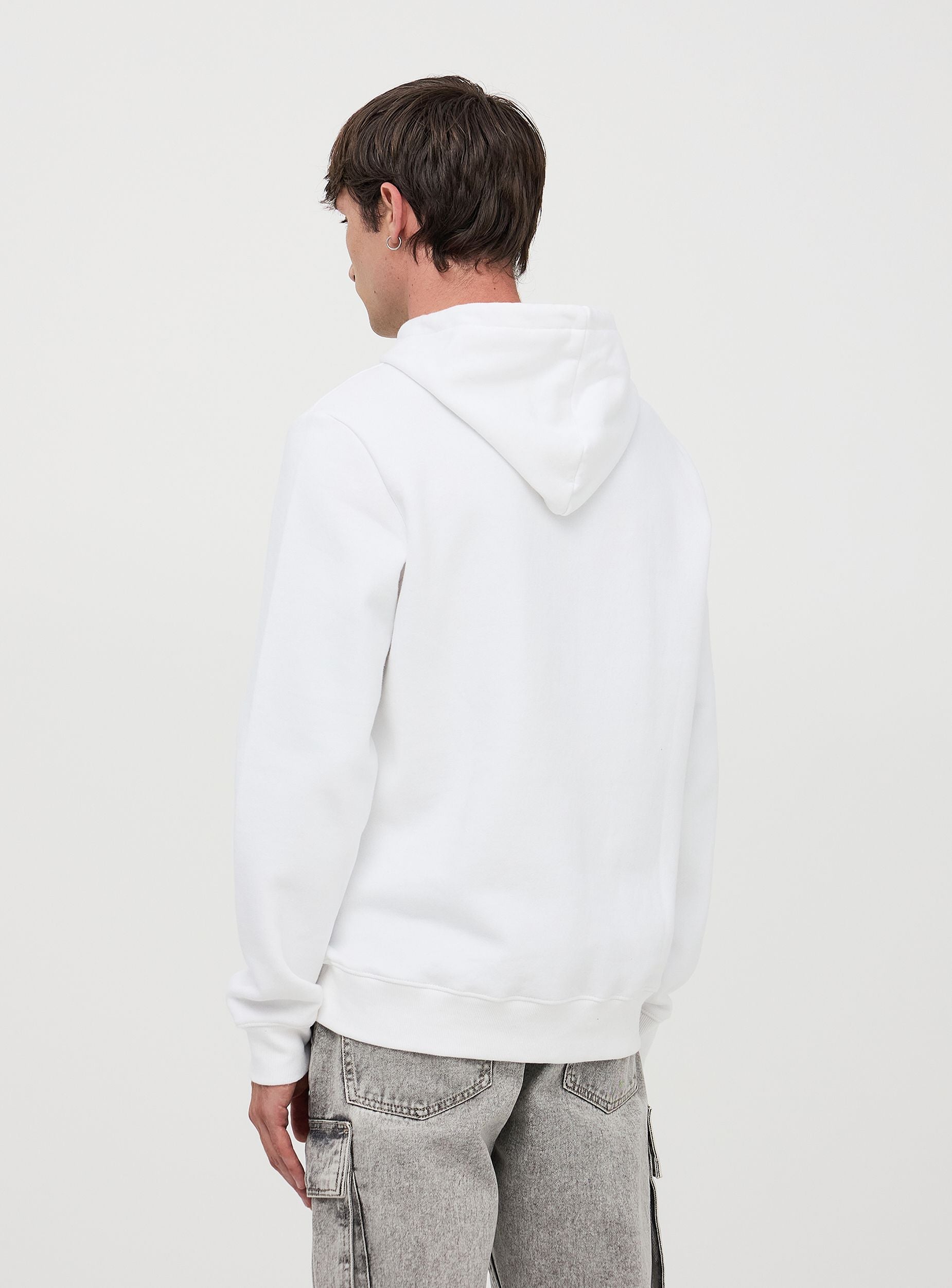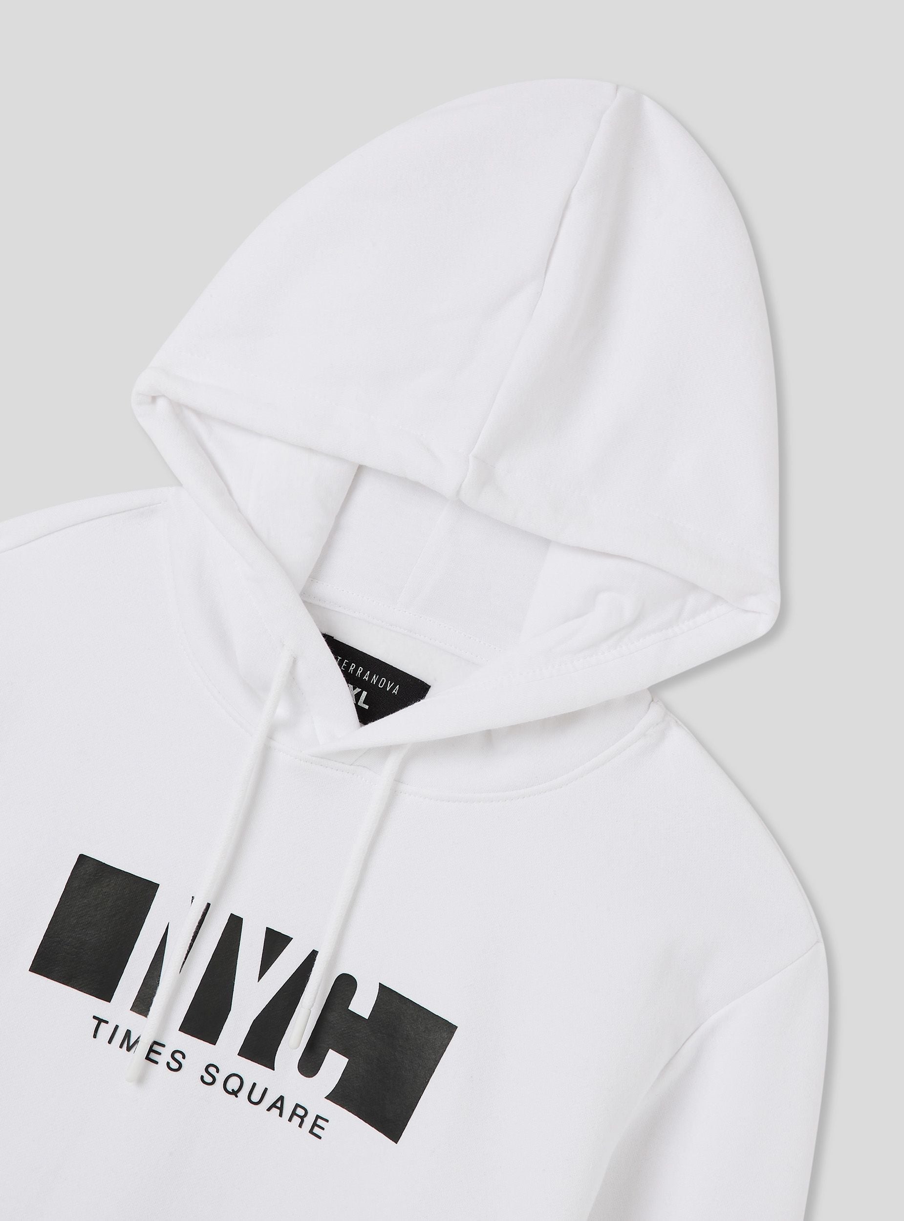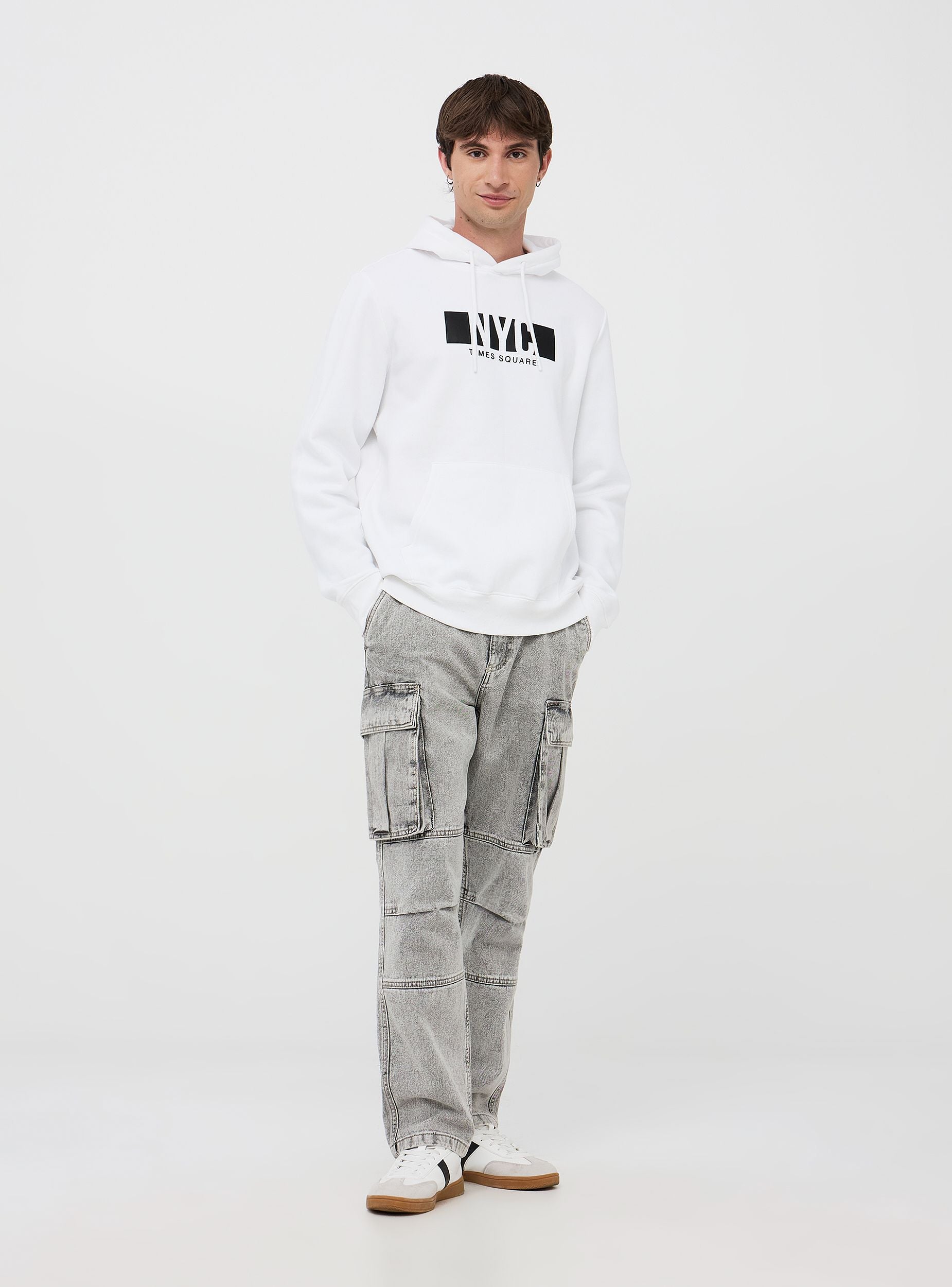 Męska bluza z kapturem i nadrukiem z przodu NYC. Wykonana z miękkiego, ciężkiego materiału, oferuje optymalny komfort. Model zapinany, wyposażony w regulowany kaptur ze sznurkiem, ściągacze i ribbowe wykończenie, oraz kieszeń typu kangur z przodu. Idealna na casualowy i sportowy look, łatwo łączy się z dżinsami lub spodniami sportowymi.Szczegóły