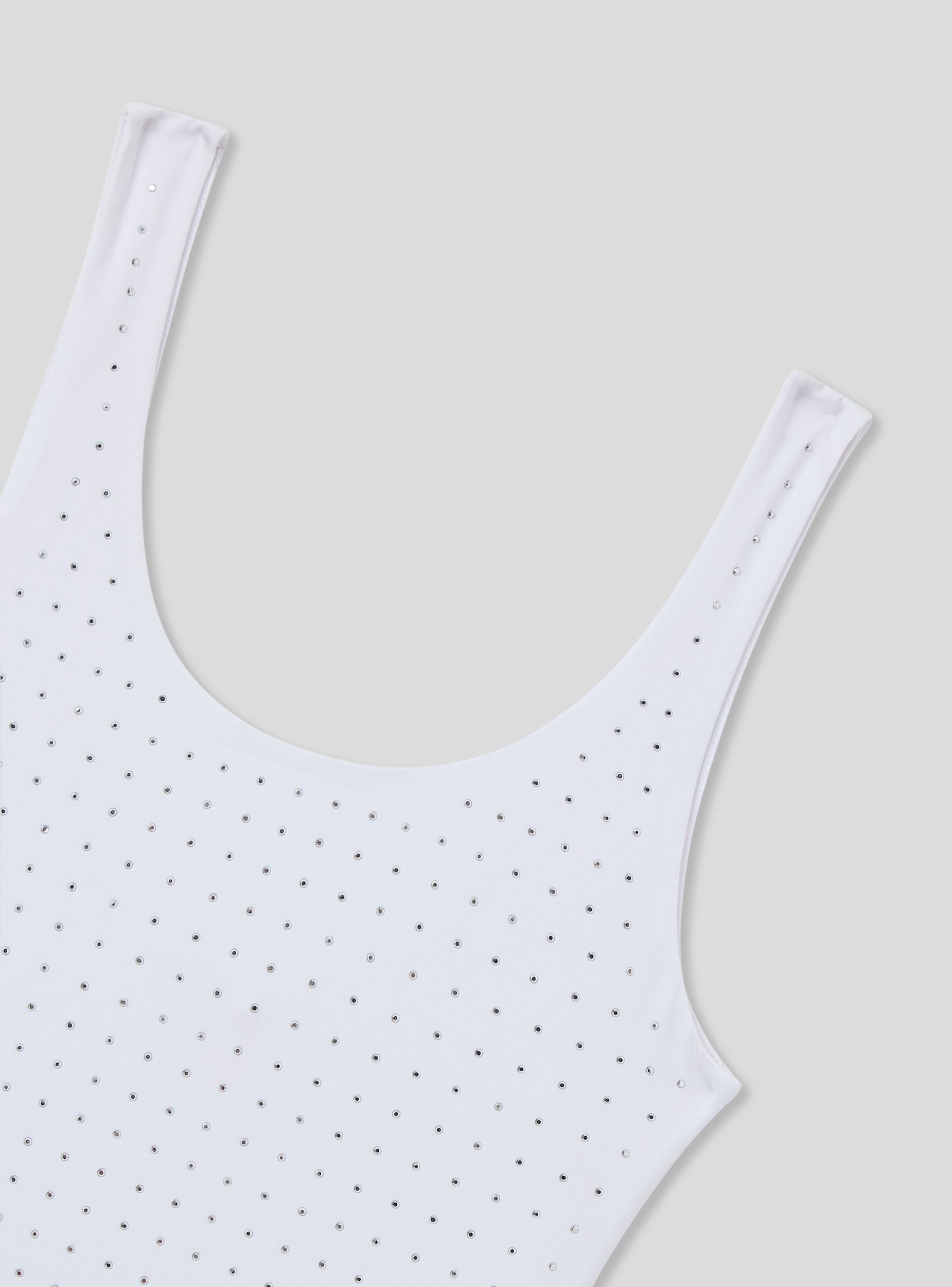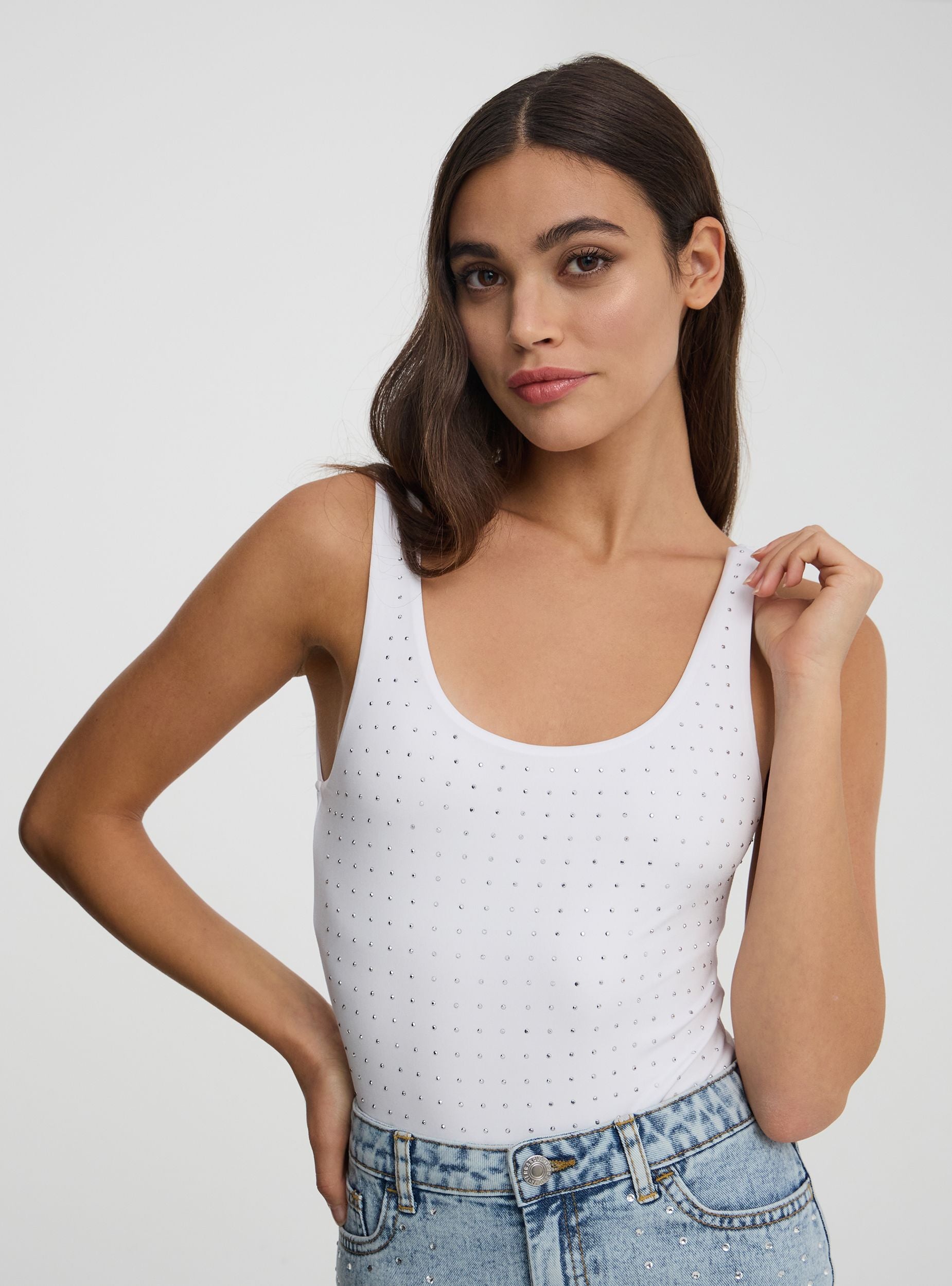 Body damski o jednolitym designie, wzbogacony elegancką aplikacją z kryształków z przodu. Ten element odzieży to prawdziwy must-have dla tych, którzy pragną dodać swojemu lookowi błyszczący akcent. Charakteryzuje się dopasowaną sylwetką, która podkreśla figurę, doskonały do tworzenia modnych stylizacji zarówno na dzień, jak i na wieczór. Detal z kryształków nadaje mu glamour, a dekolt sprawia, że body jest uniwersalne i odpowiednie na różne okazje. Idealne dla tych, którzy szukają stylu wyrafinowanego i modnego.Szczegóły