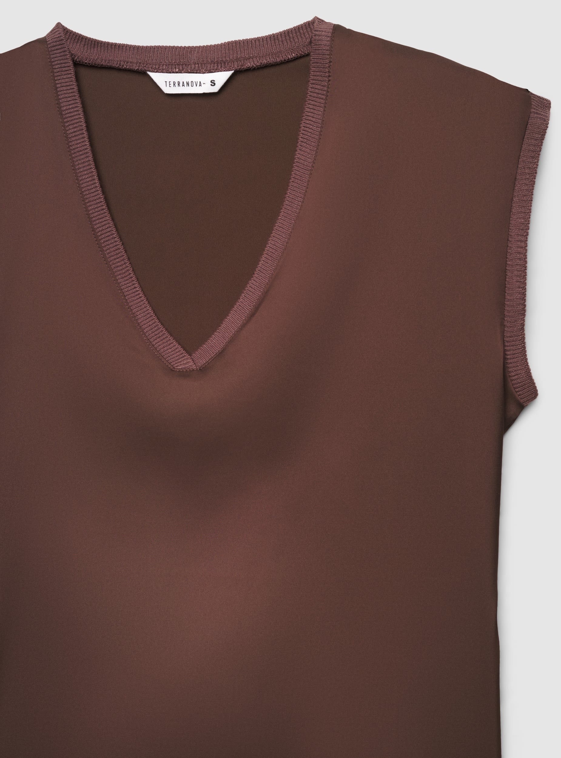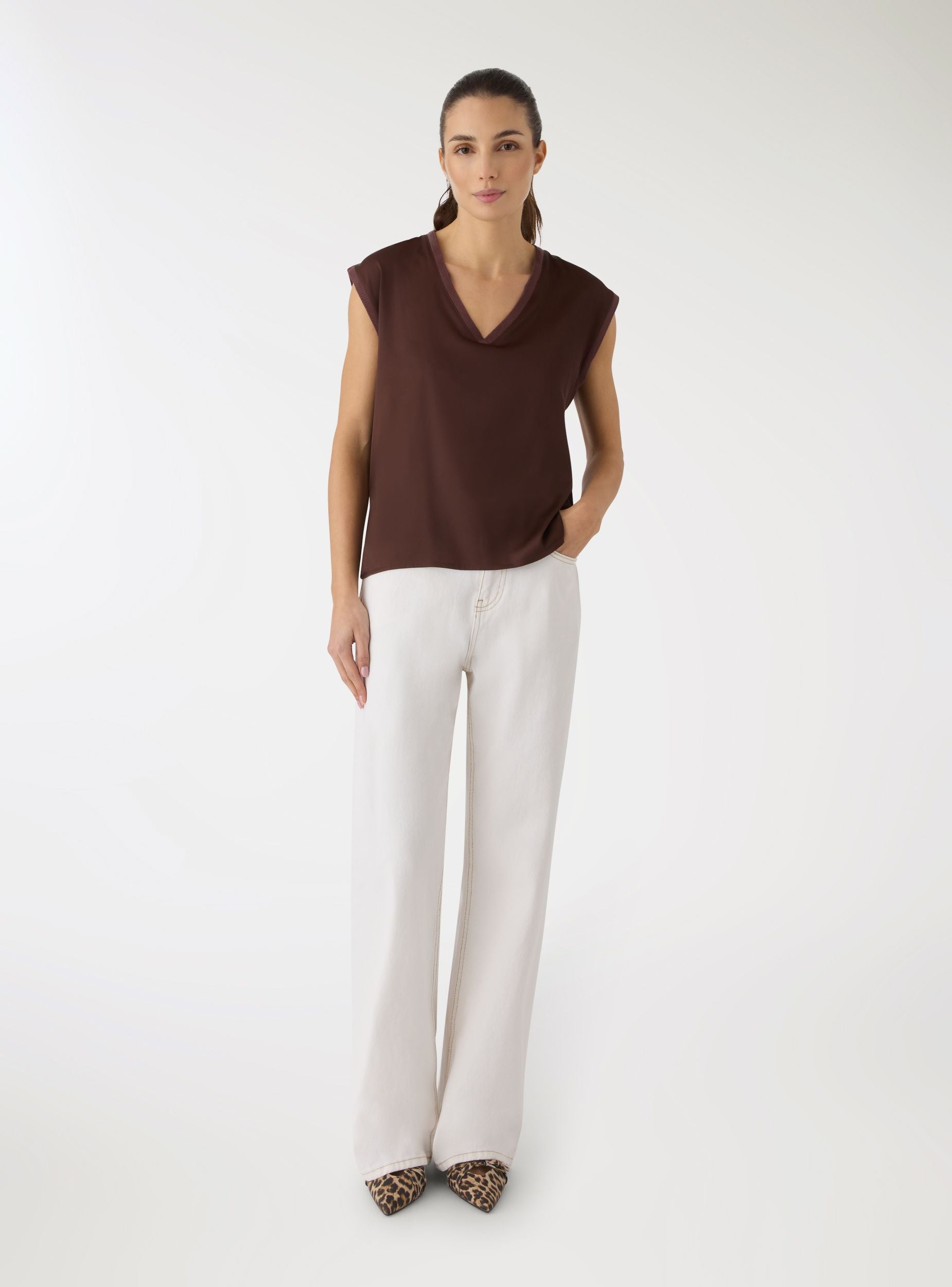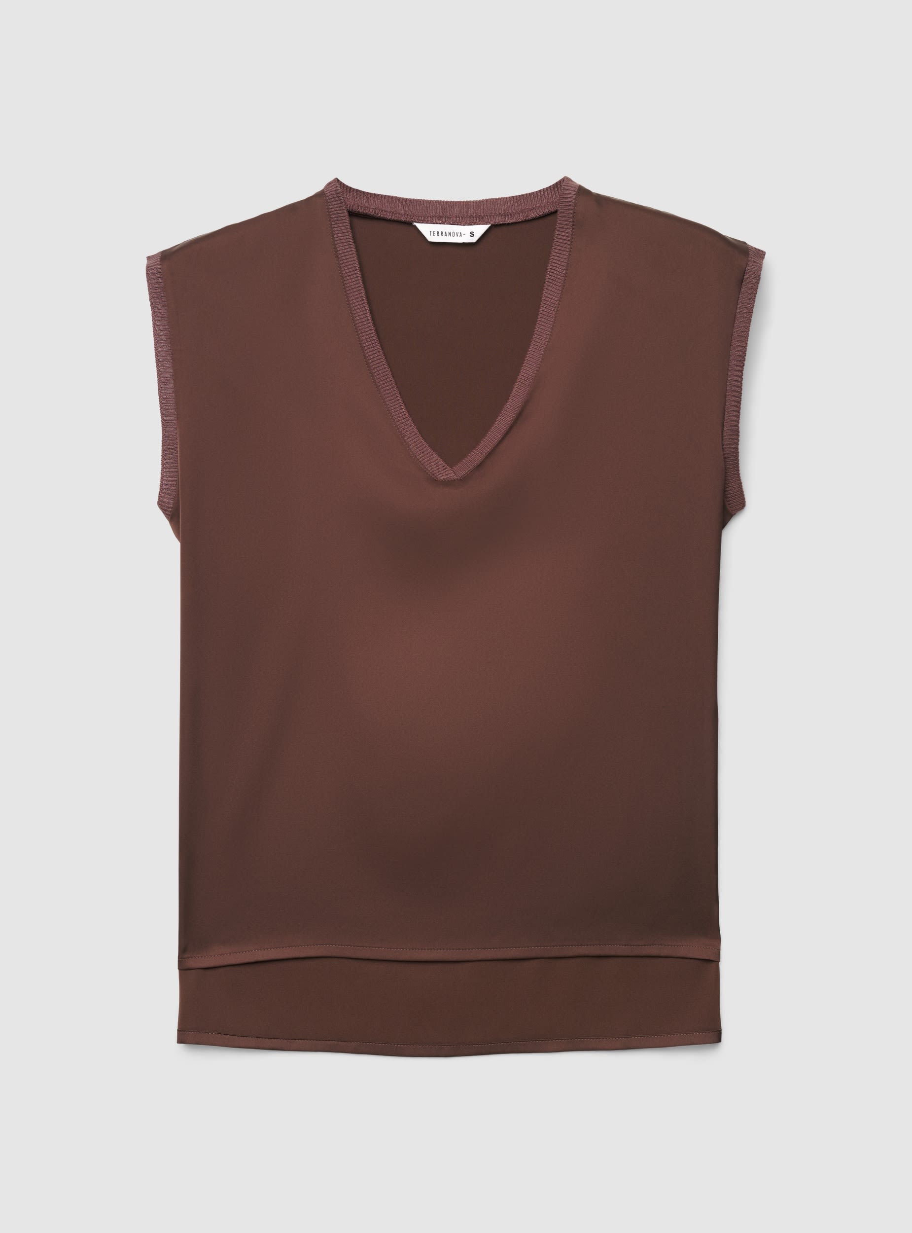 Damski top w jednolitym kolorze, bez rękawów, z głębokim dekoltem w serek wykończonym prążkowaną lamówką. Prosty krój i standardowa długość, idealny do biura i na co dzień. Minimalistyczny design ułatwia łączenie z jeansami, spódnicami midi lub eleganckimi spodniami, a lekko podwójony brzeg dodaje starannego wykończenia. Doskonały pod marynarkę lub kardigan, tworząc wszechstronne i kobiece stylizacje.Szczegóły