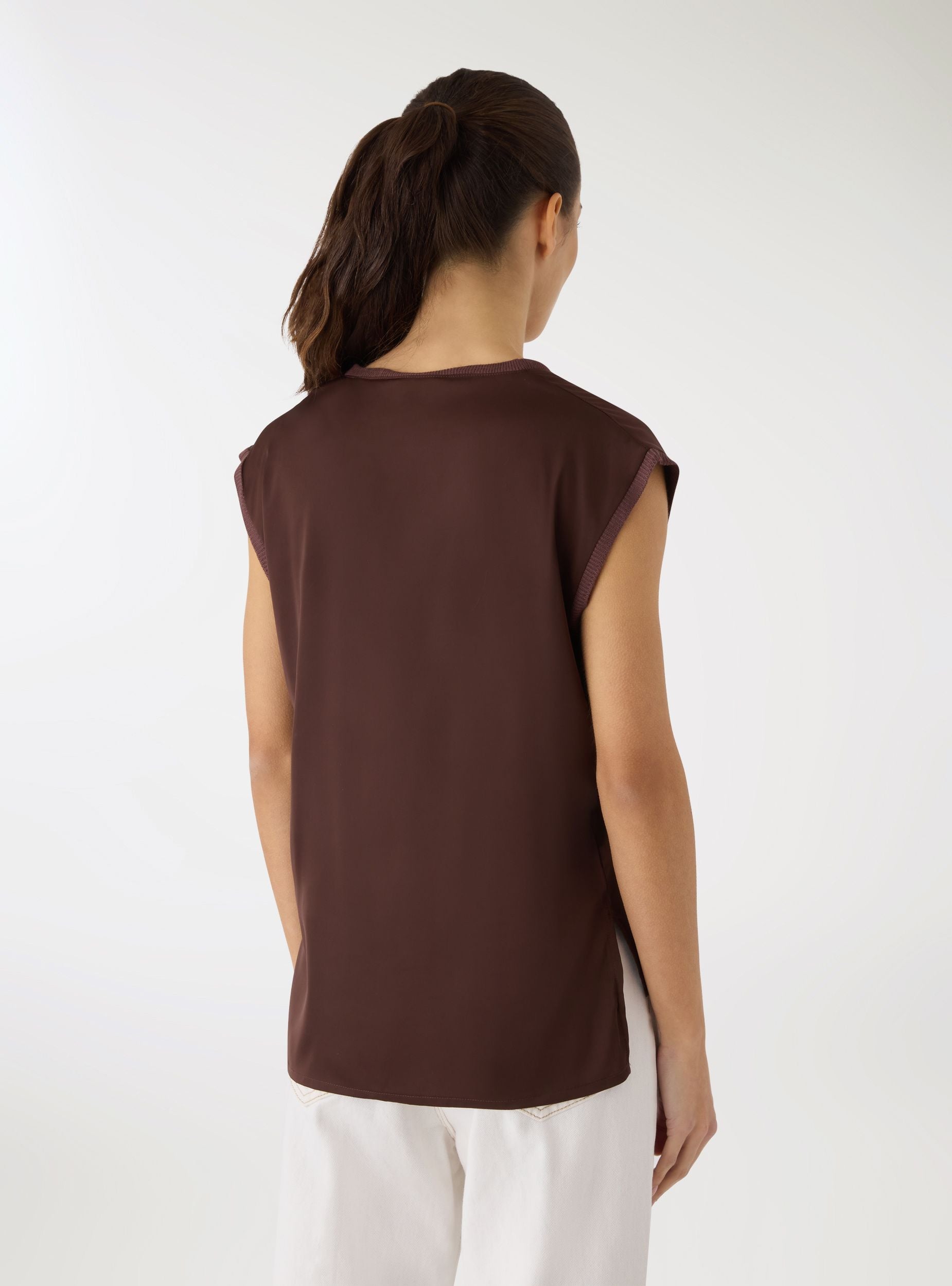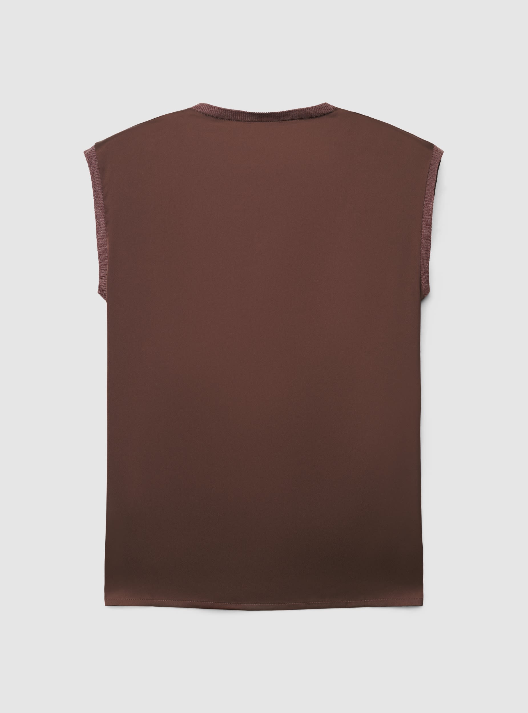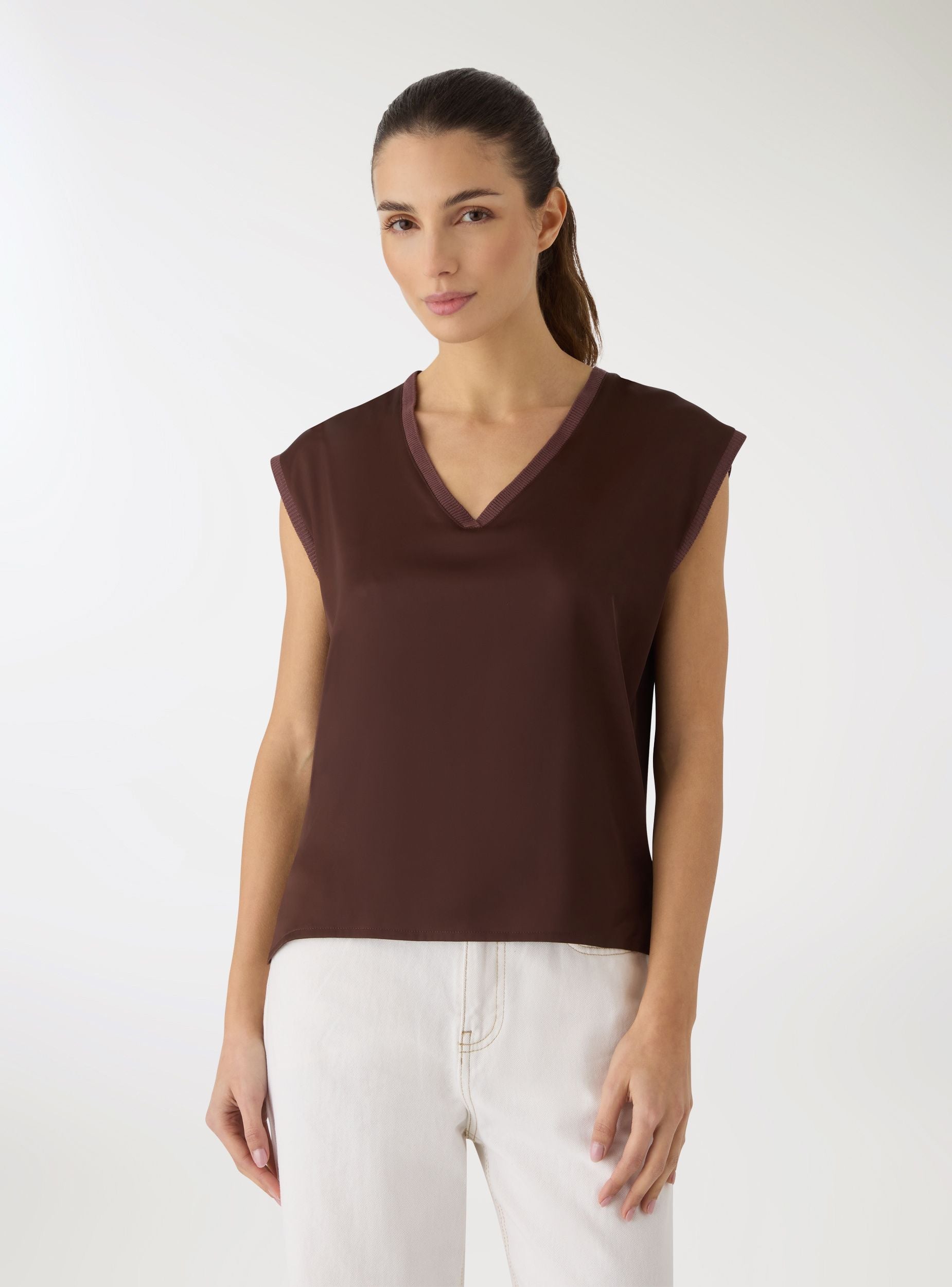 Damski top w jednolitym kolorze, bez rękawów, z głębokim dekoltem w serek wykończonym prążkowaną lamówką. Prosty krój i standardowa długość, idealny do biura i na co dzień. Minimalistyczny design ułatwia łączenie z jeansami, spódnicami midi lub eleganckimi spodniami, a lekko podwójony brzeg dodaje starannego wykończenia. Doskonały pod marynarkę lub kardigan, tworząc wszechstronne i kobiece stylizacje.Szczegóły