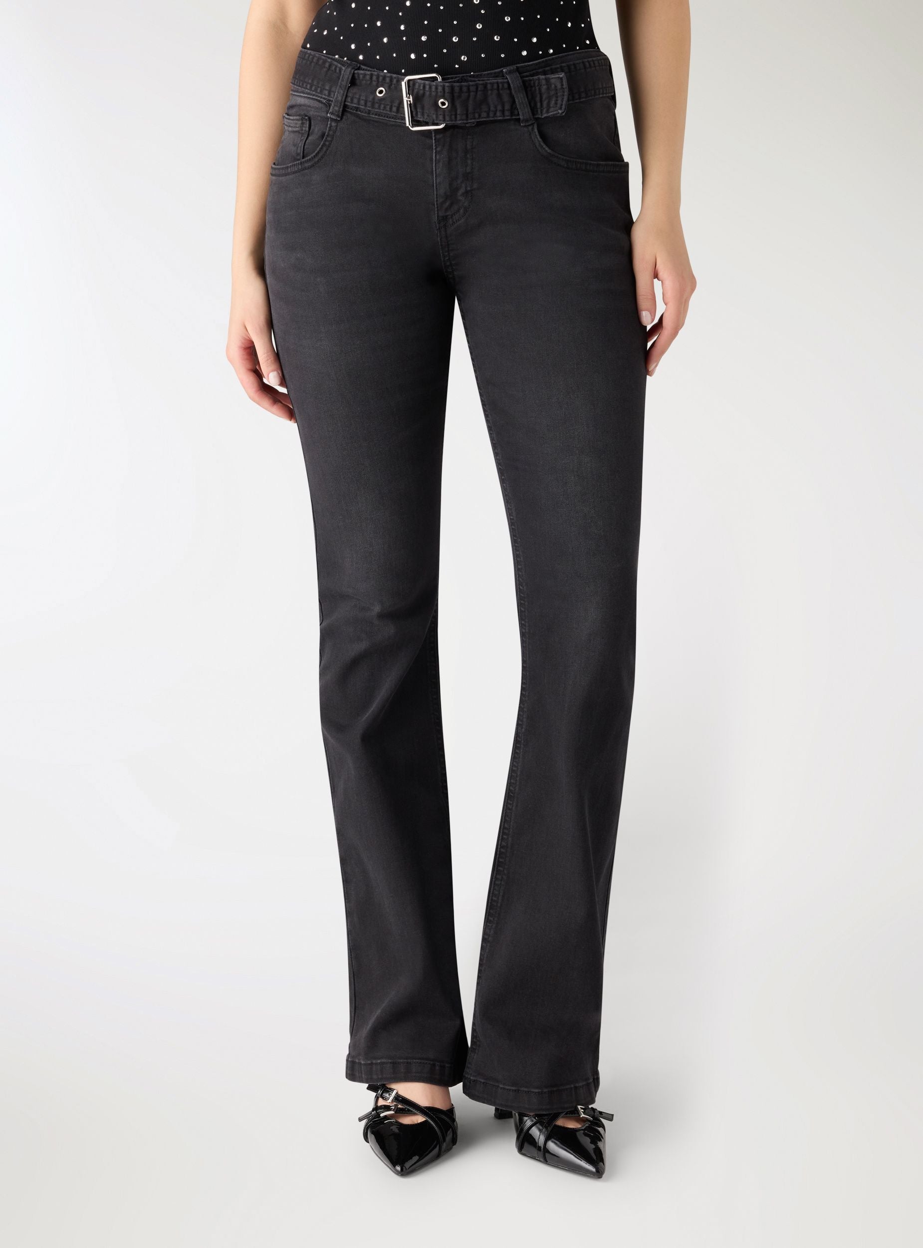 Damskie jeansy jednolite, z niskim stanem i rozszerzanymi nogawkami, idealne do wysmuklenia sylwetki w połączeniu z botkami lub czółenkami. Model z pięcioma kieszeniami, szlufkami i dopasowanym paskiem z klamrą i oczkami. Zapięcie z przodu na suwak i guzik. Z tyłu kieszenie z patką i guzikiem dla wyrazistego detalu, idealne na dzień i wieczór.Szczegóły