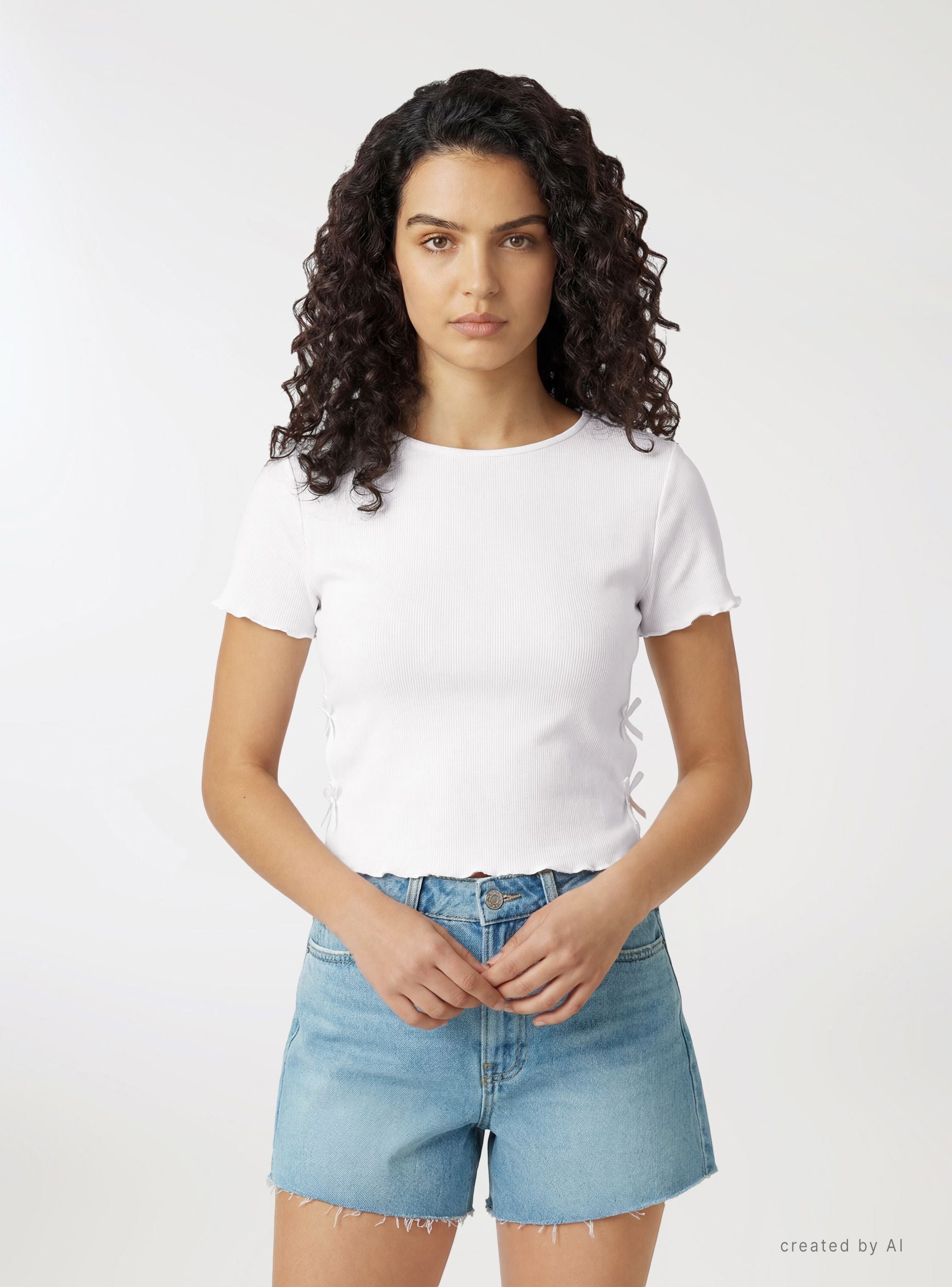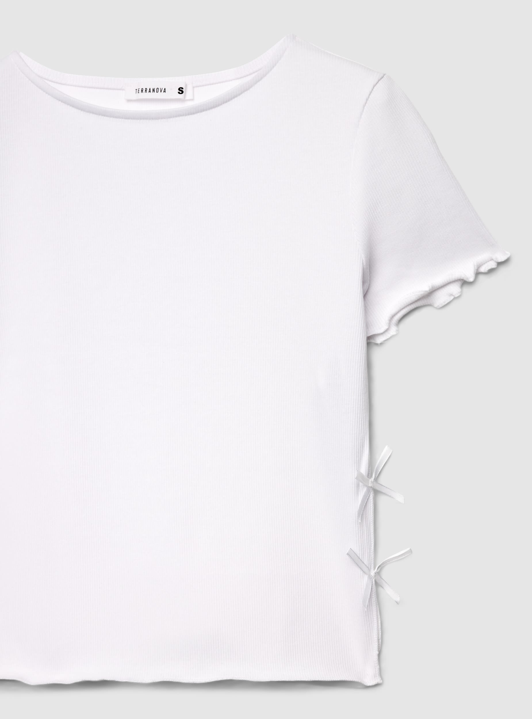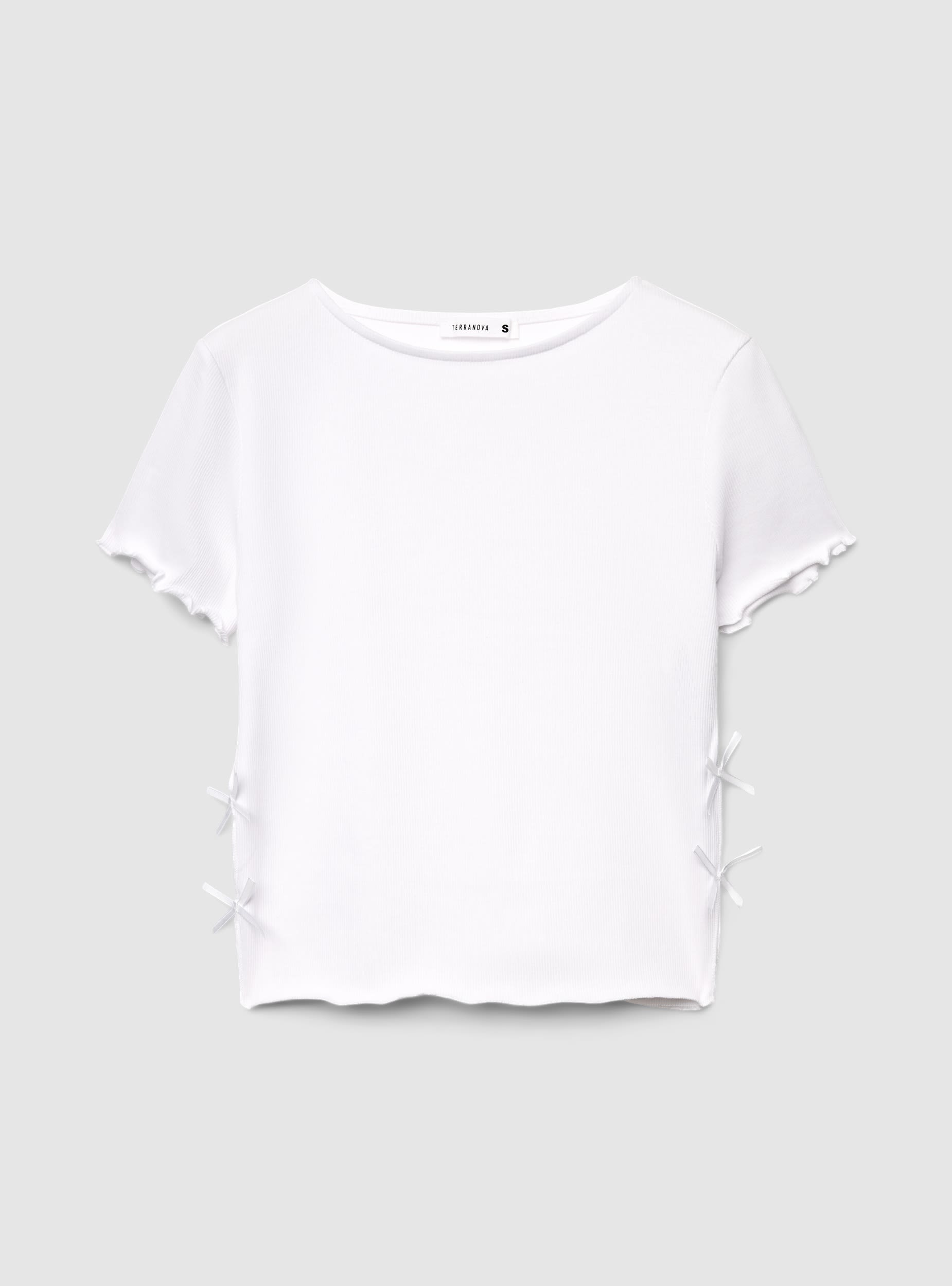 Damska jednokolorowa koszulka z okrągłym dekoltem i krótkimi rękawami. Marszczone detale na krawędziach rękawów dodają kobiecego charakteru, a małe kokardki na bokach podkreślają sylwetkę. Regularny krój, idealny na czas wolny, świetnie komponuje się z dżinsami, spódnicami lub szortami. Prosty i wszechstronny design na codzienne stylizacje.Szczegóły