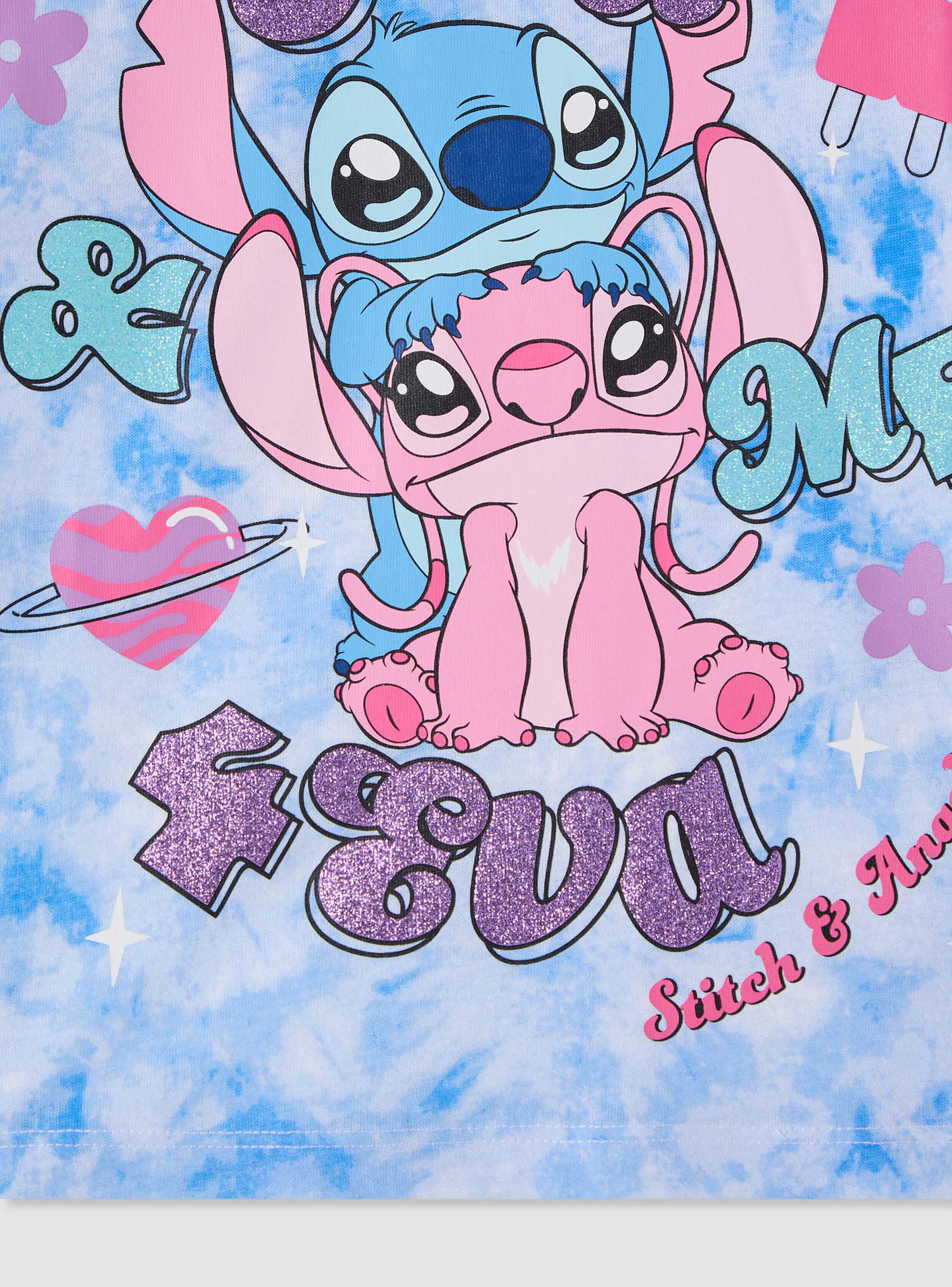 Koszulka dziewczęca z nadrukiem Stitch® i napisami na tle tie-dye. Model z krótkim rękawem i okrągłym dekoltem, o regularnym kroju i długości do bioder. Grafika zawiera błyszczące detale, które dodają jej efektu połysku. Idealna na czas wolny i do szkoły, pasuje do jeansów, szortów lub spódniczek z denimu. Doskonała do noszenia pod lekkimi bluzami lub kurtkami w okresie przejściowym.Szczegóły