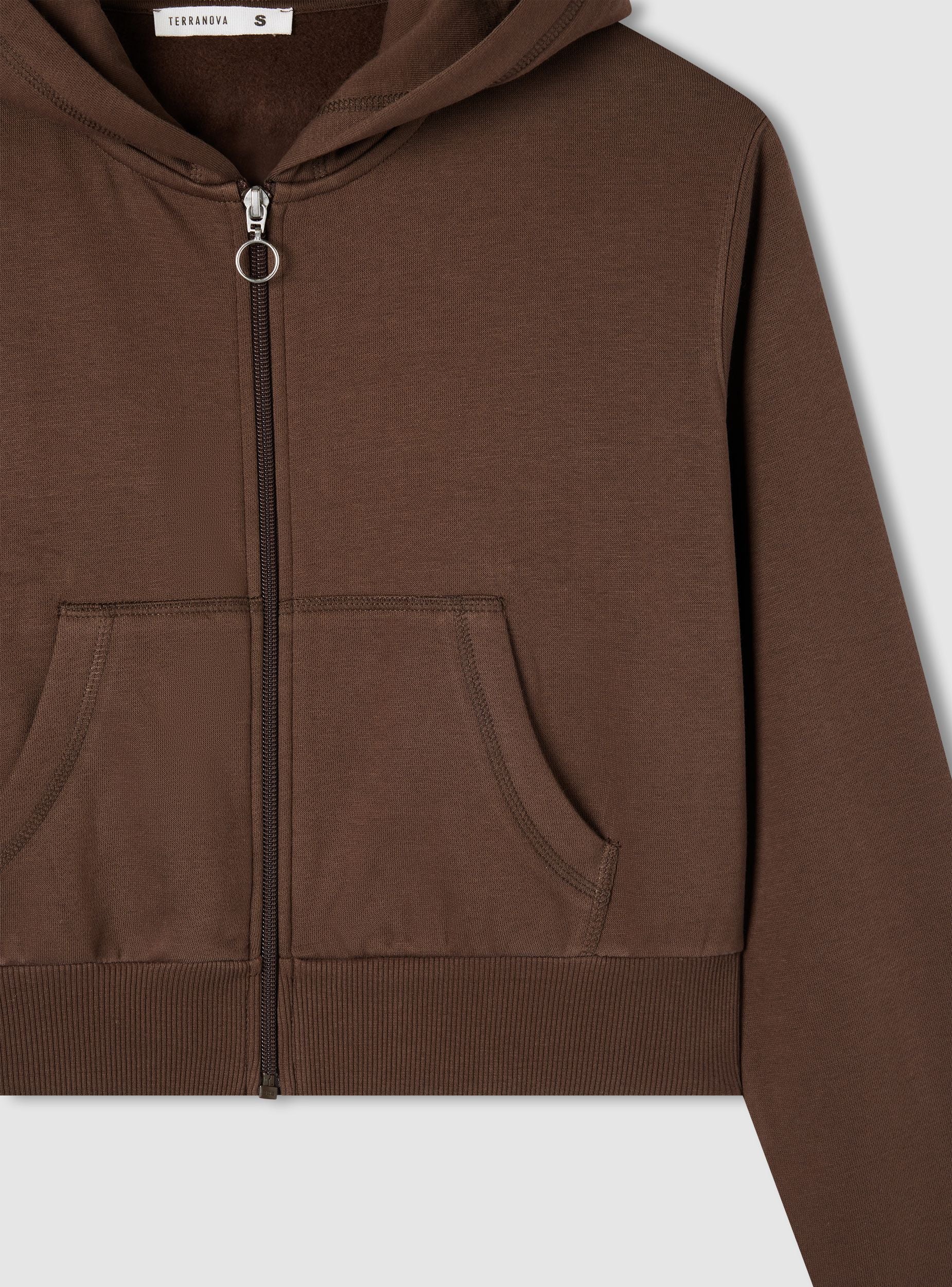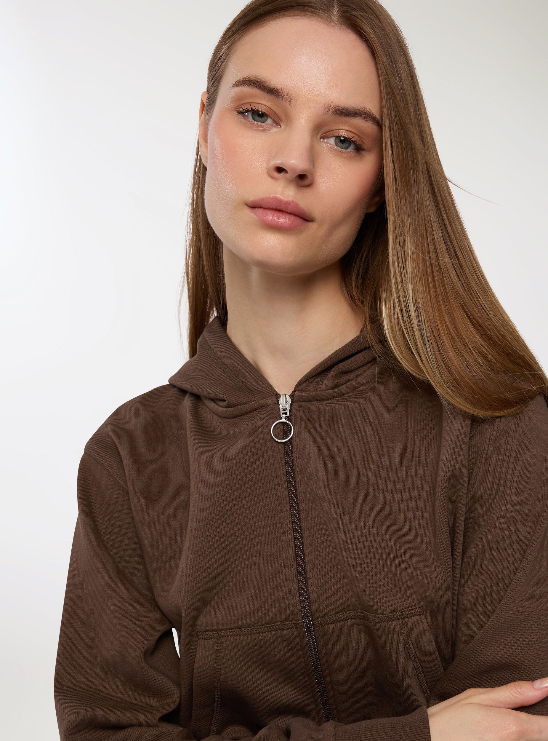 Damska ciężka crop bluza z kapturem i zamkiem z przodu, idealna do casualowego i nowoczesnego stylu. Krótki krój podkreśla sylwetkę, a materiał zapewnia ciepło i komfort. Wyposażona w kieszenie typu kangur i wykończenia z ściągacza na dole oraz przy mankietach dla wygodnego dopasowania. Idealna do parowania z spodniami z wysokim stanem lub joggerami.Szczegóły