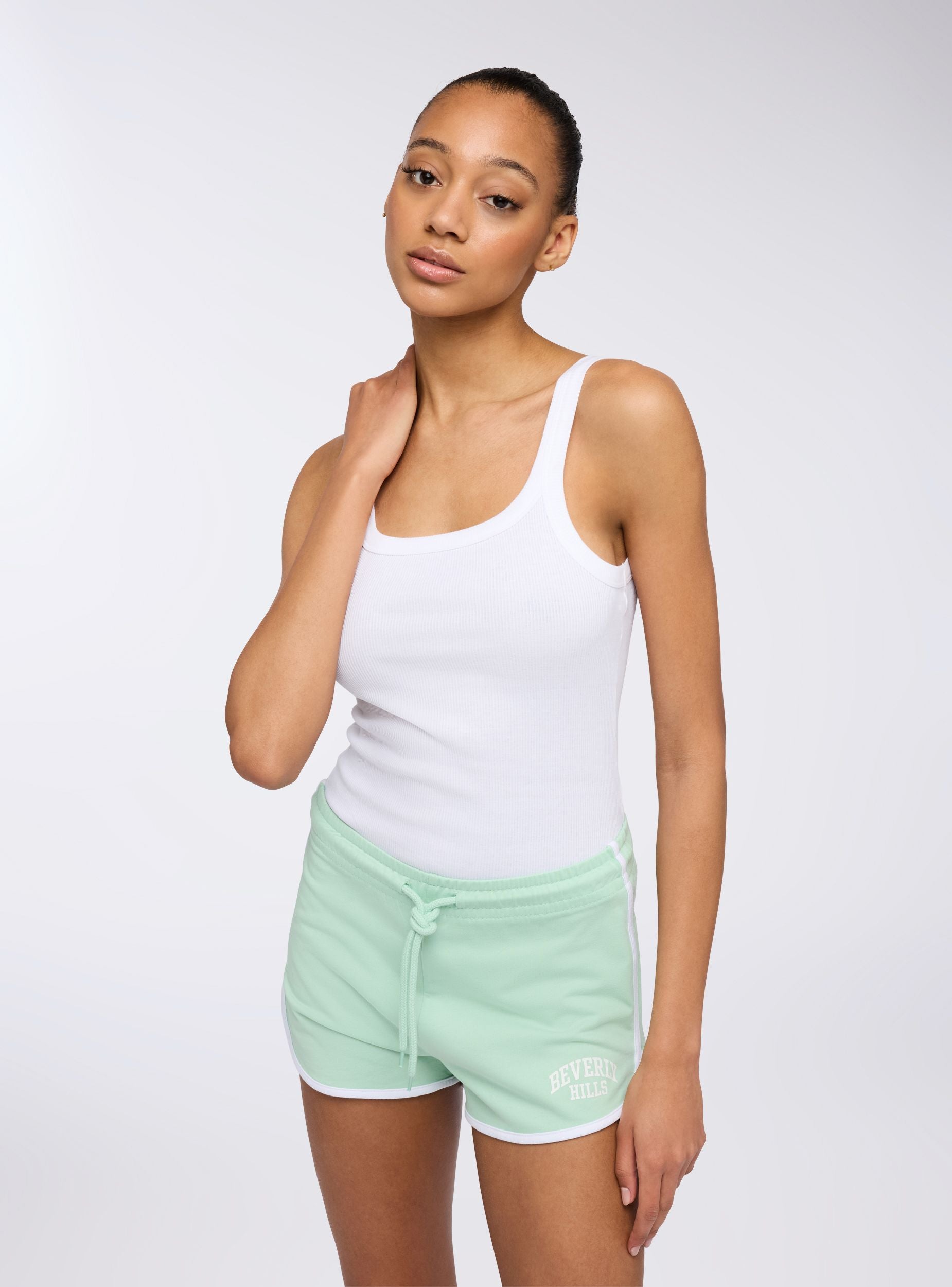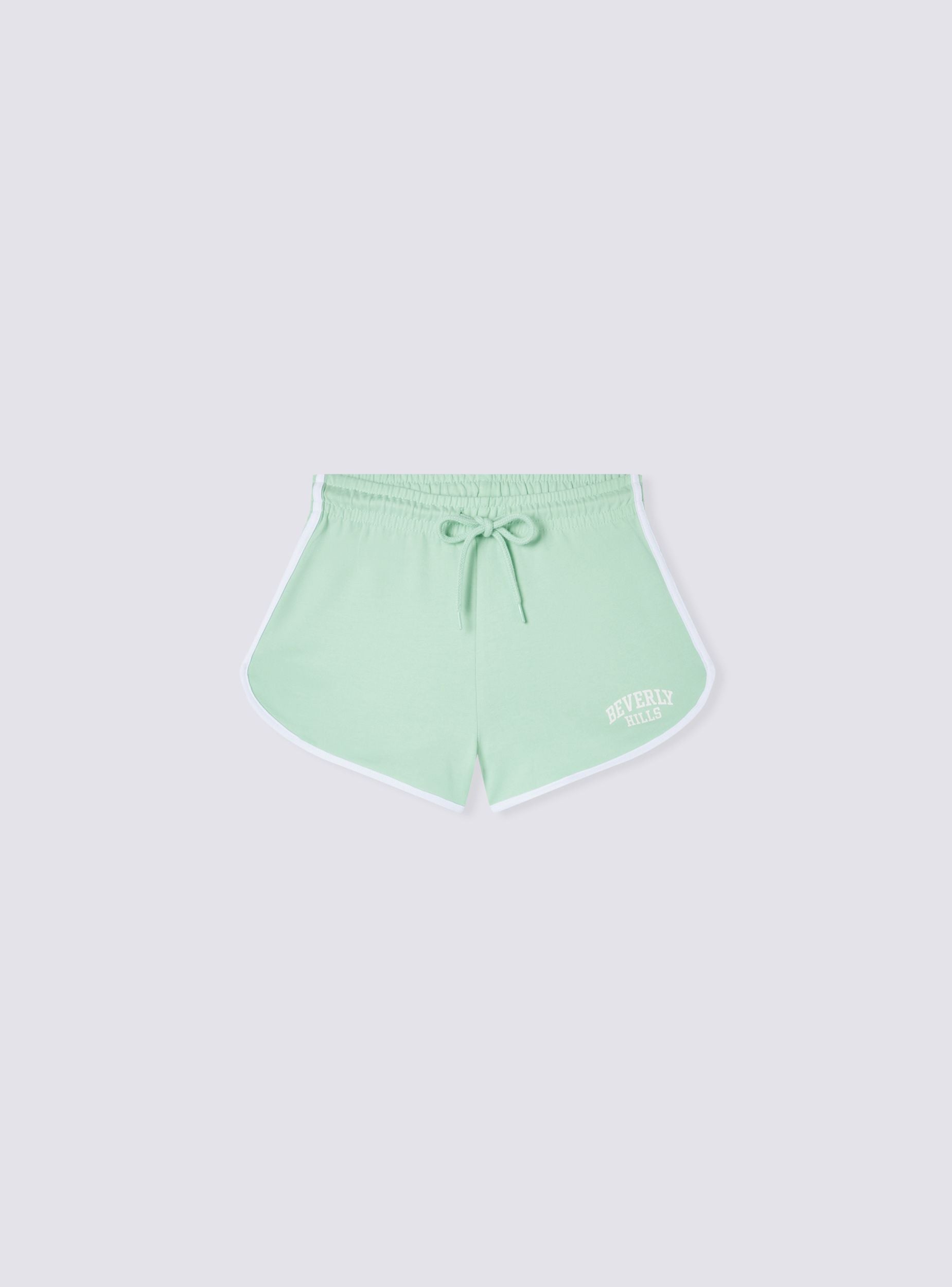 Kobiece szorty wykonane z lekkiego materiału, z sportowym designem i nadrukiem w stylu college na przodzie. Posiadają wygodny sznurek w talii do regulacji dopasowania i są wykończone kontrastowymi detalami, które nadają dynamiczny charakter wyglądowi. Idealne na czas wolny, te szorty oferują praktyczność i styl, z casualowym, ale zadbanym wyglądem.Szczegóły