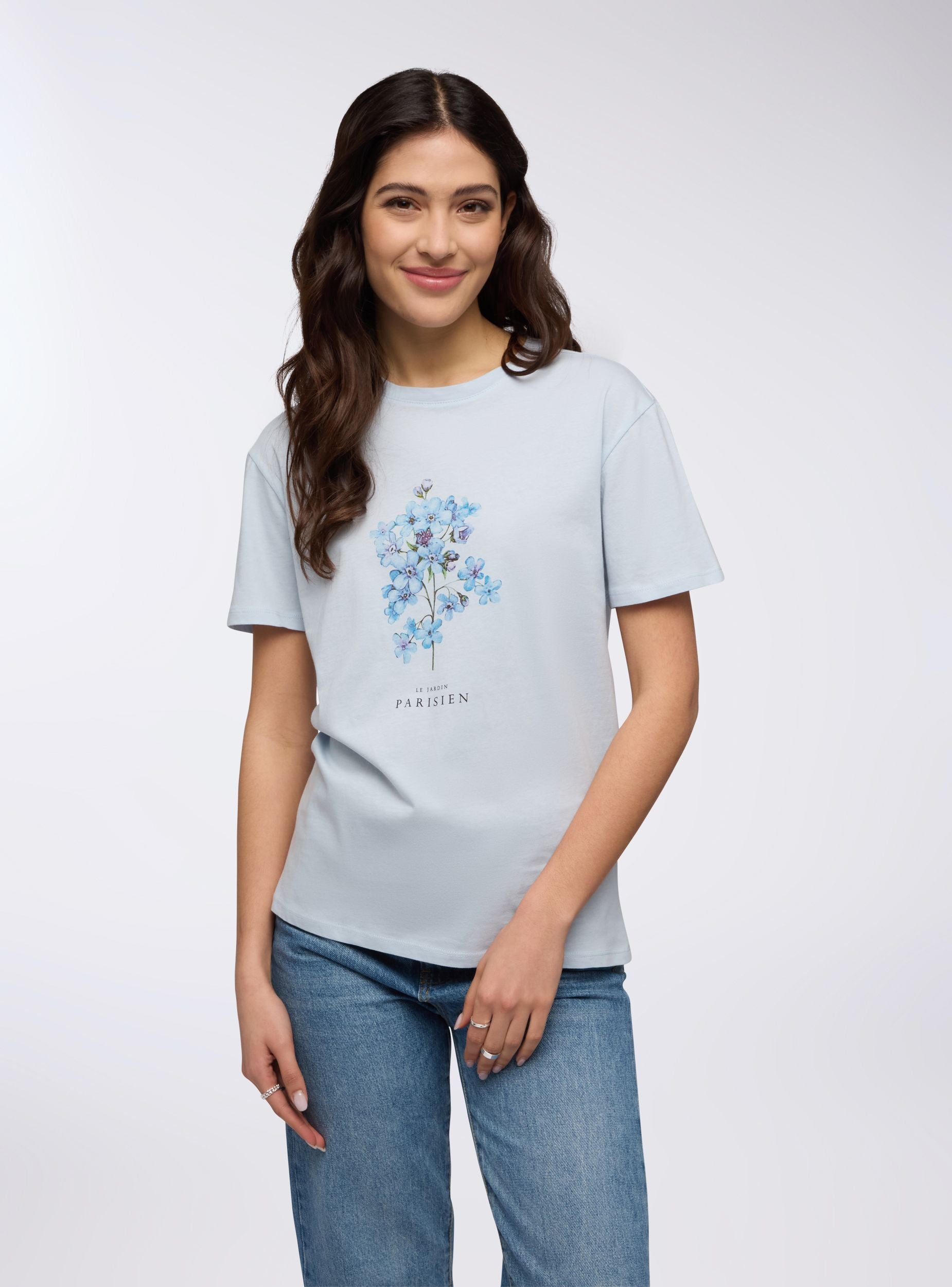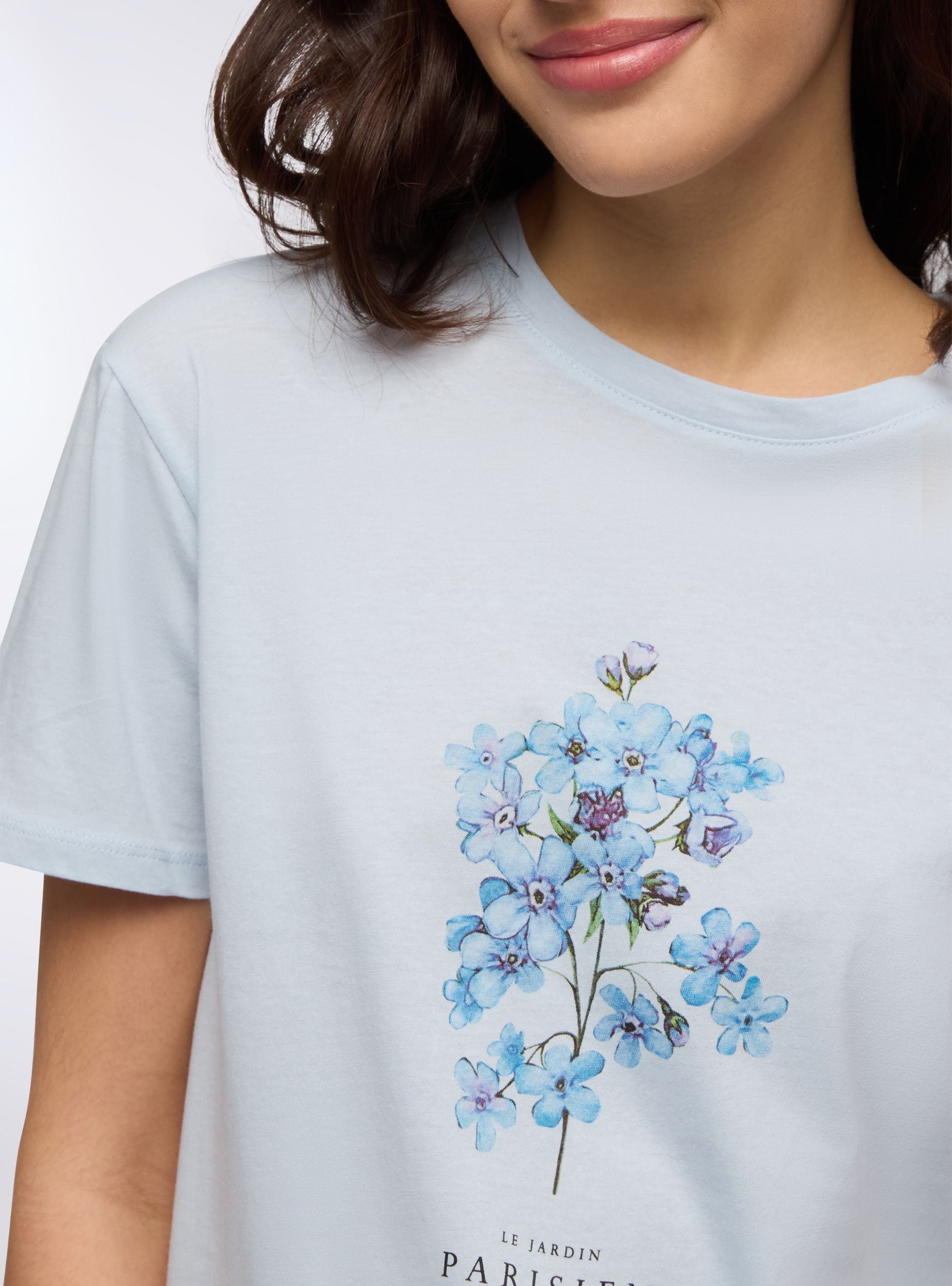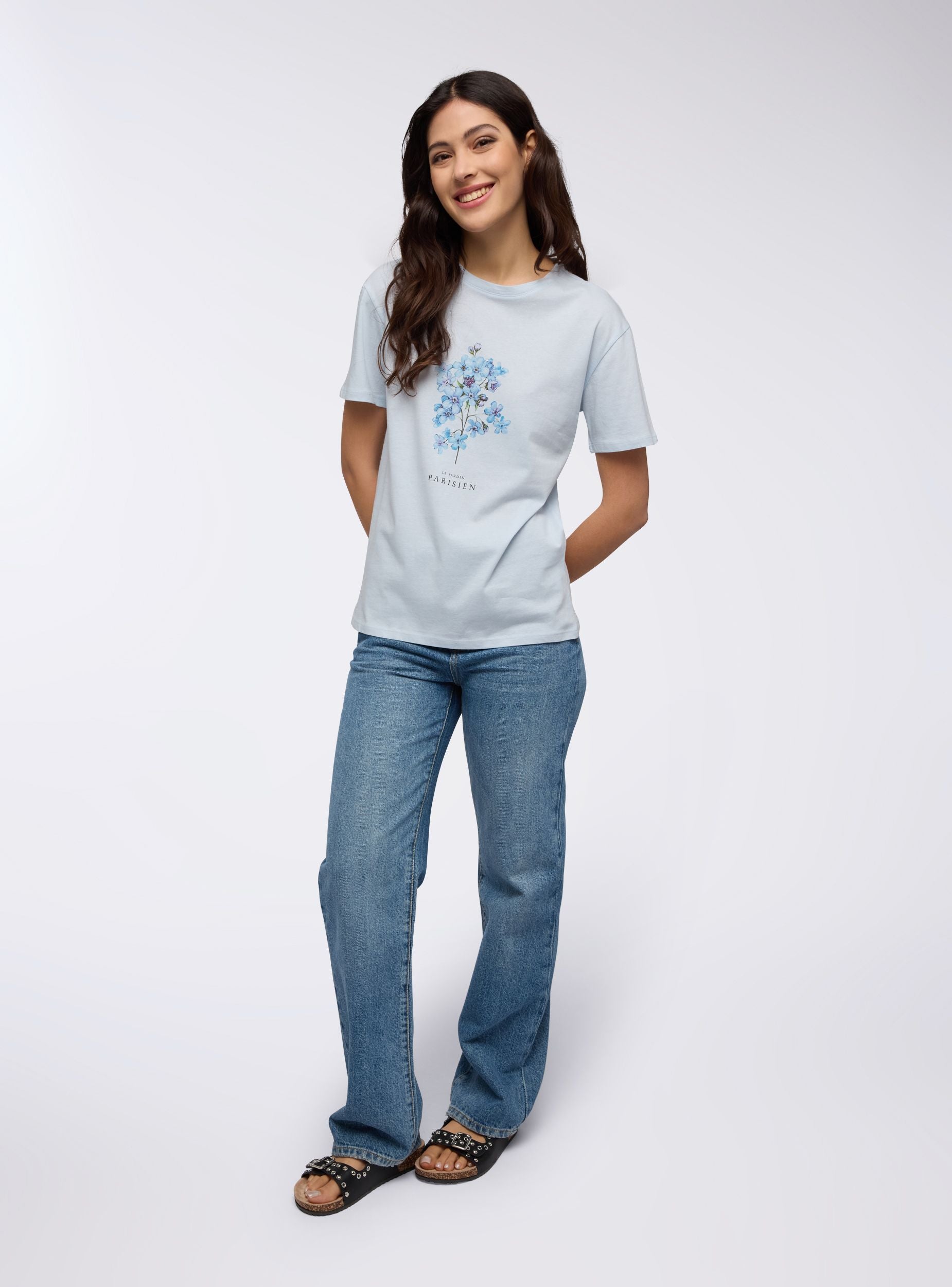 Koszulka damska o luźnym kroju, idealna dla tych, którzy szukają wygodnego i casualowego ubrania. Krótkie rękawy i okrągły dekolt sprawiają, że ta koszulka jest idealna do noszenia w cieplejsze dni, oferując luźny krój. Na przodzie wyróżnia się kwiatowy nadruk, towarzyszący dekoracyjnym napisom, które nadają projektowi kobiecy i romantyczny akcent. Nadruk dodaje osobowości ubraniu, czyniąc je idealnym do zestawień zarówno casualowych, jak i bardziej eleganckich. Koszulka, która łączy komfort i styl, doskonała do uzupełnienia świeżego i swobodnego wyglądu.Szczegóły