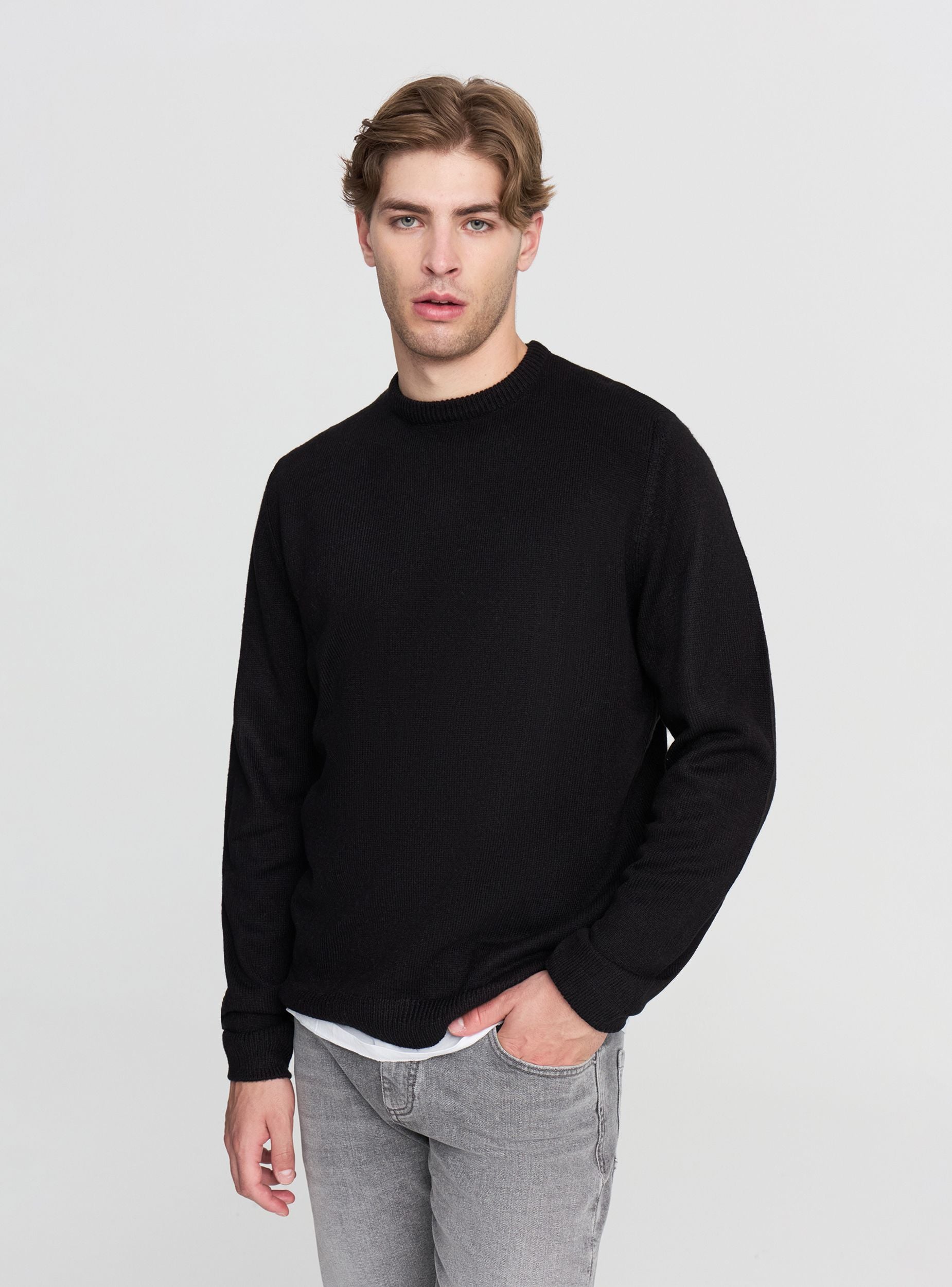 Męski sweter jednokolorowy z okrągłym dekoltem i regularnym krojem, idealny na zimowy sezon w stylu minimalistycznym i uniwersalnym. Żebrowane wykończenia na dole, mankietach i dekolcie dodają elementu wyrazistości do odzieży. Doskonały do noszenia z dżinsami lub spodniami chinos, aby uzyskać casualowy, ale zadbany wygląd, to must-have, który warto mieć pod ręką na każdą nieformalną okazję lub do biura.Szczegóły