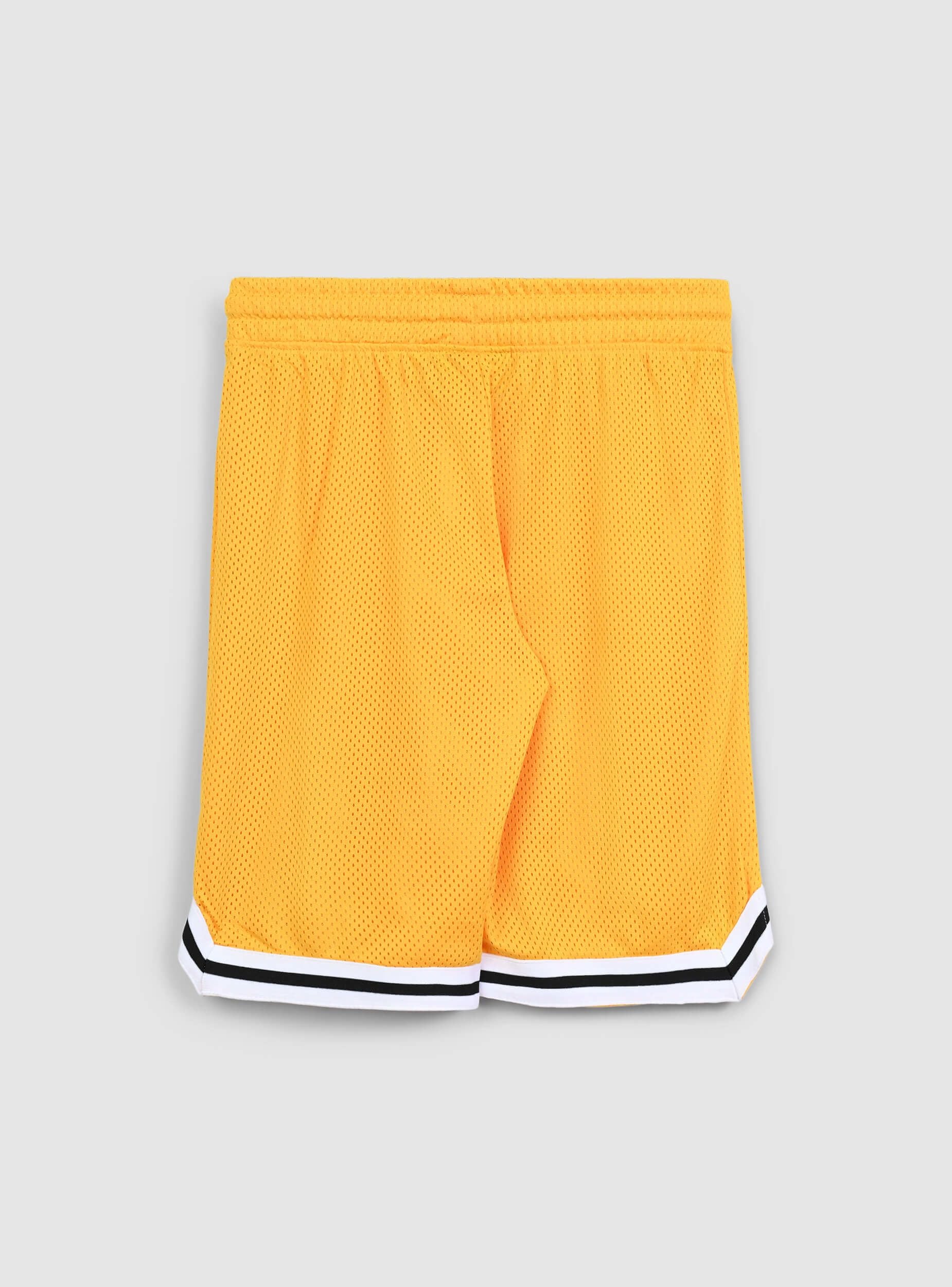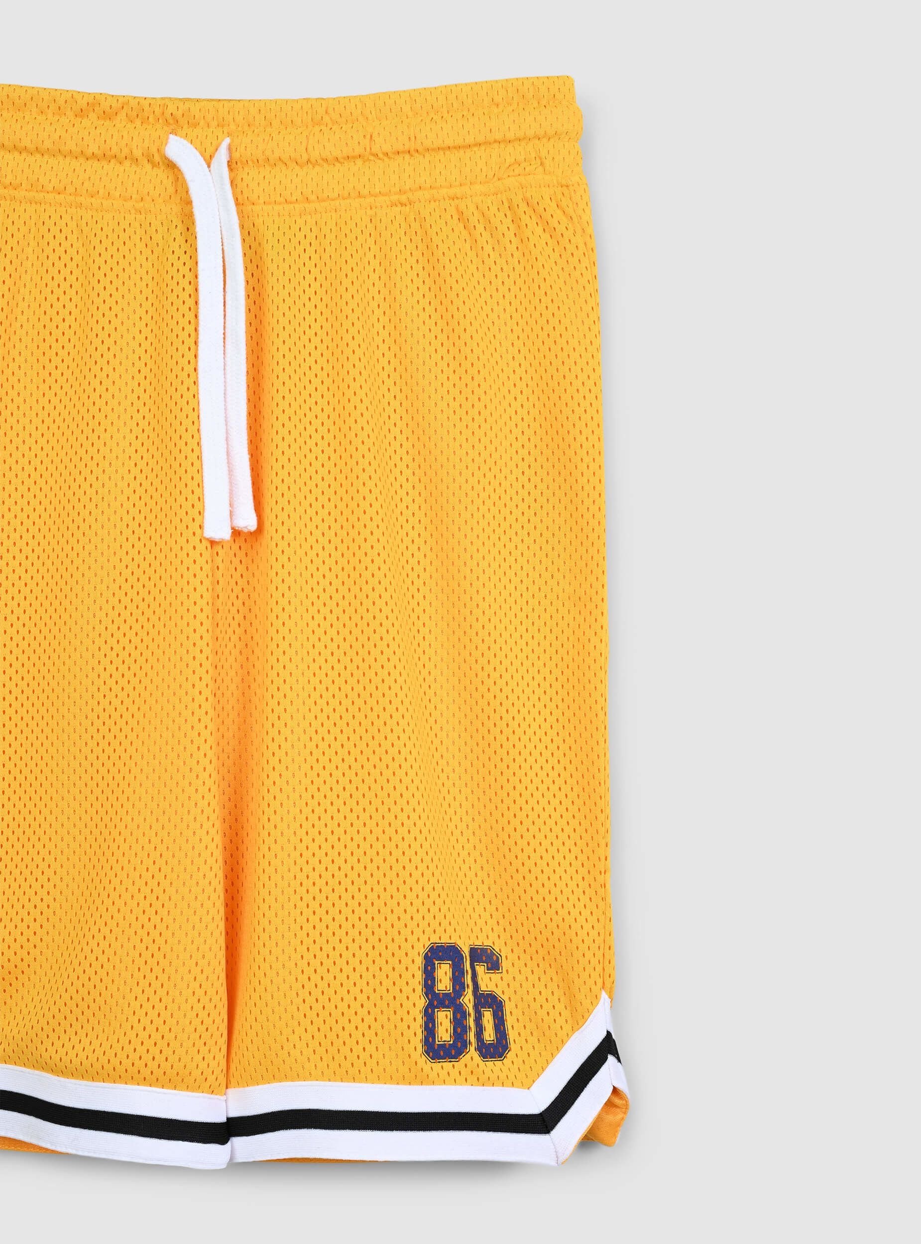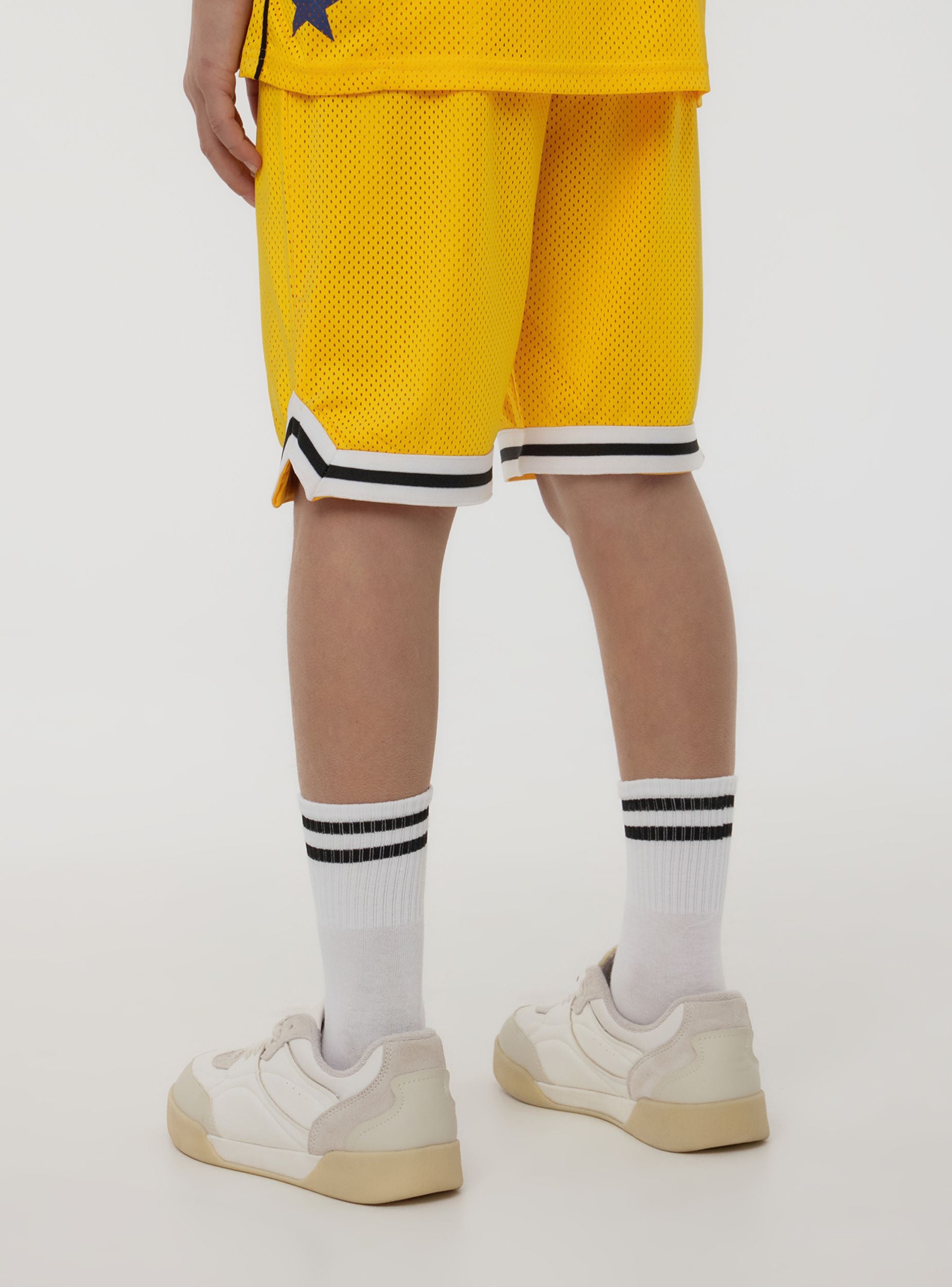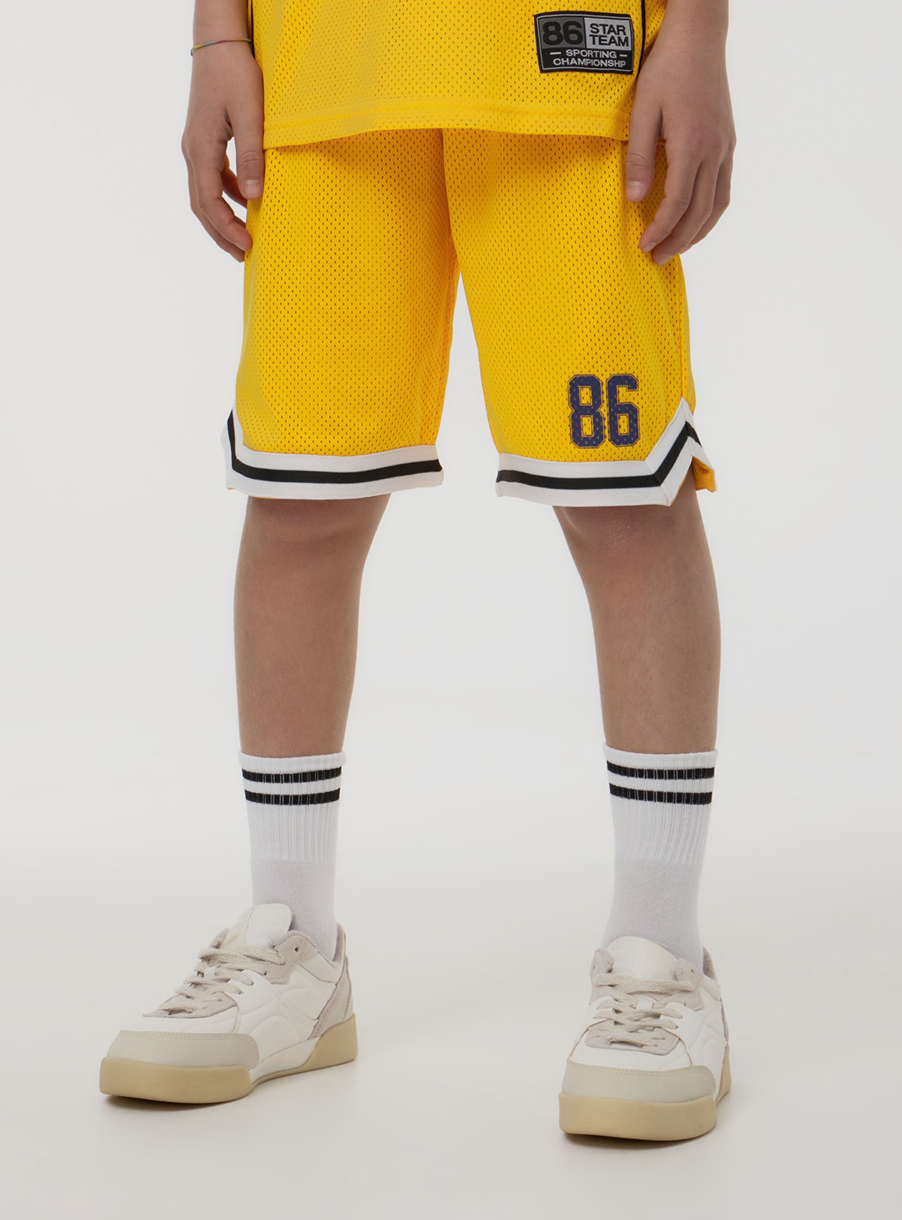 Spodenki sportowe dla dzieci z siateczki, idealne do aktywności fizycznej i zabawy. Krótka długość i design inspirowany koszykówką łączą się z detalem z nadrukowanym numerem na nodze. Kontrastowe wykończenia dodają dynamizmu, a regulowany sznurek w talii zapewnia wygodne i bezpieczne dopasowanie. Praktyczny i wszechstronny element, zaprojektowany z myślą o maksymalnym komforcie i stylu w ruchu.Szczegóły