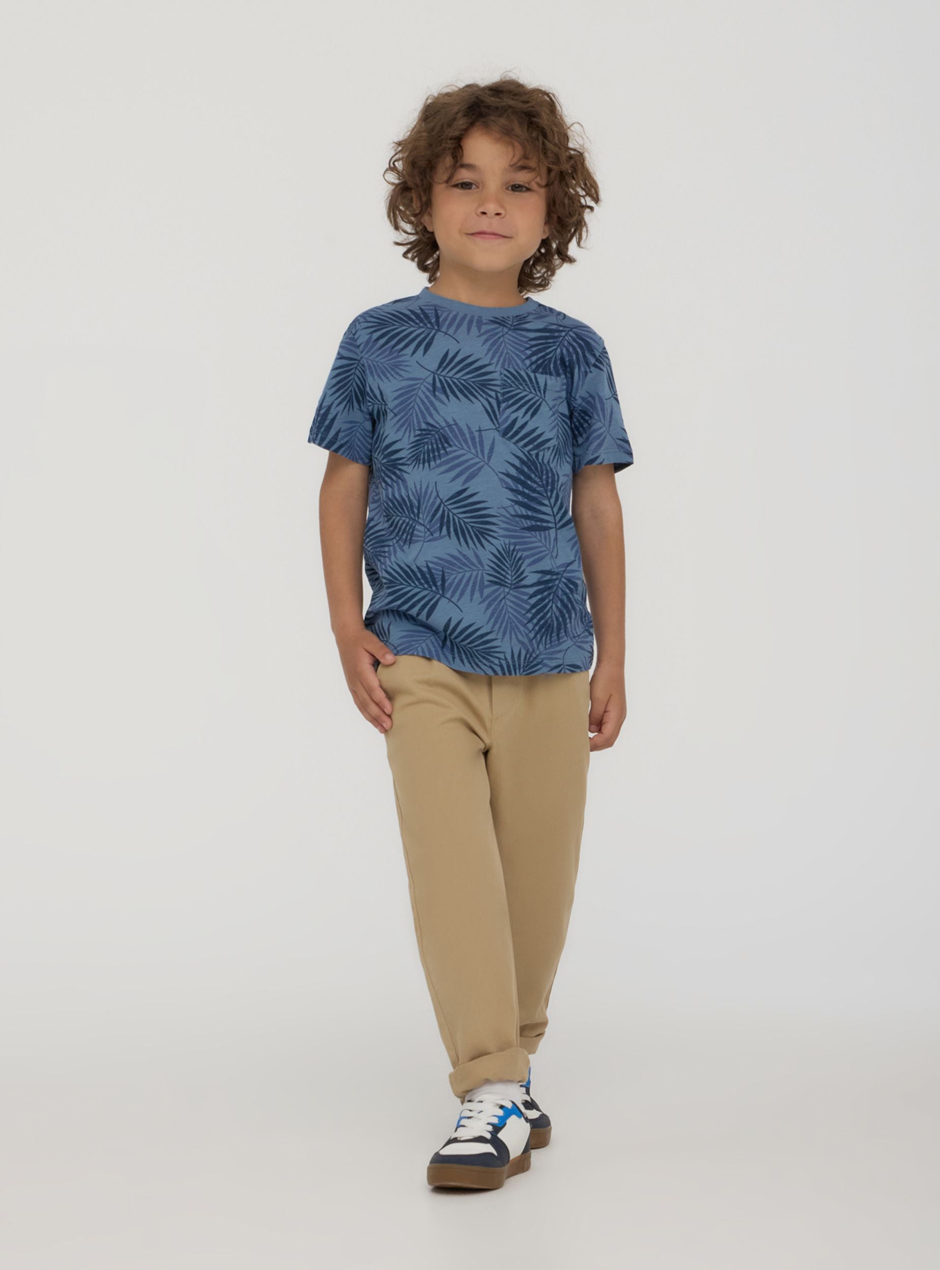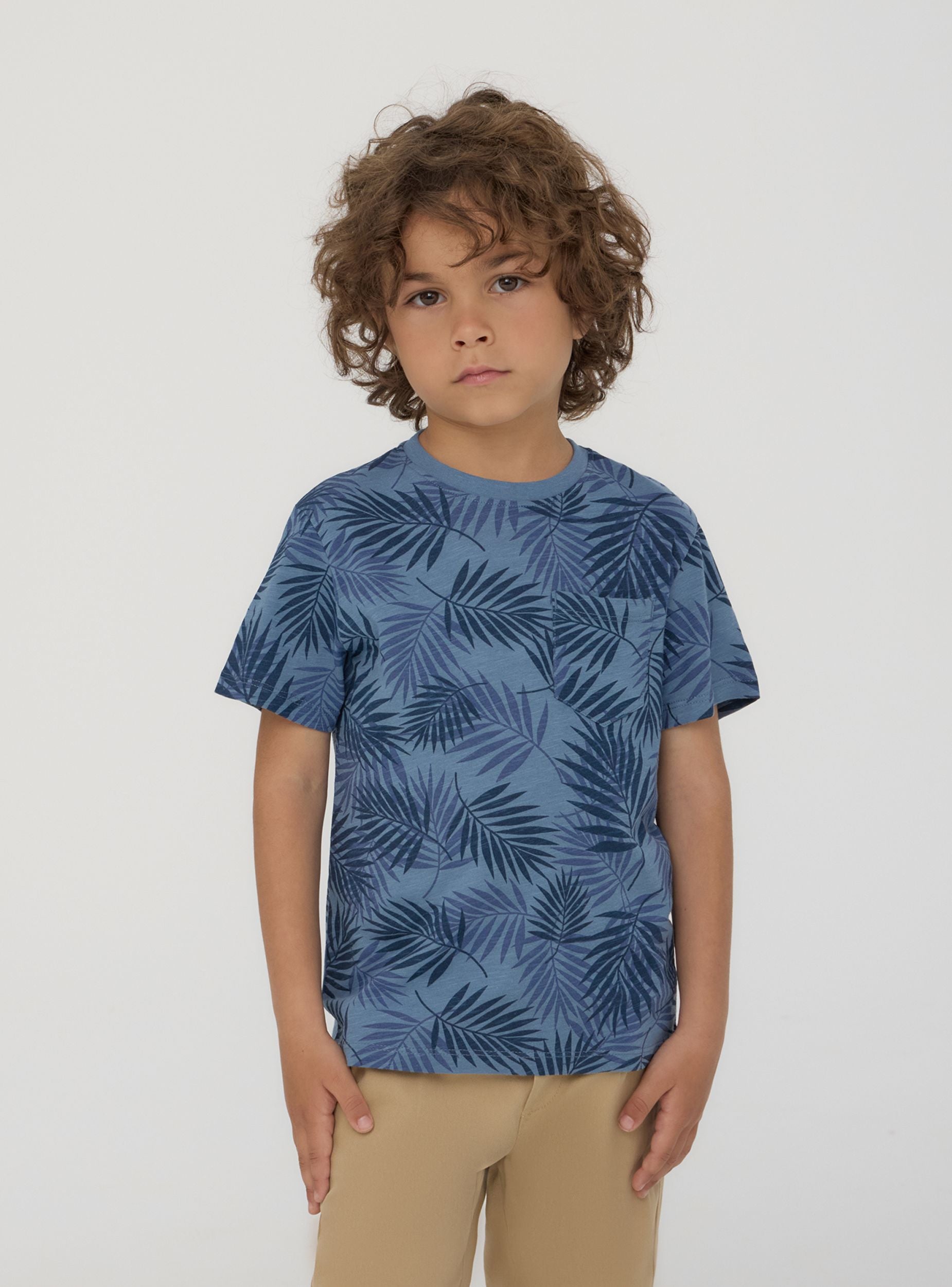 Koszulka dziecięca o świeżym i nowoczesnym stylu, idealna na letnie dni i przygody na świeżym powietrzu. Krótki rękaw i okrągły dekolt zapewniają komfort i funkcjonalność, podczas gdy nadruk z liśćmi w całym wzorze dodaje tropikalnego i dynamicznego akcentu. Mała kieszonka na piersi dodaje swobodnego i praktycznego detalu. Doskonała z szortami lub dżinsami dla praktycznego i modnego wyglądu.Szczegóły