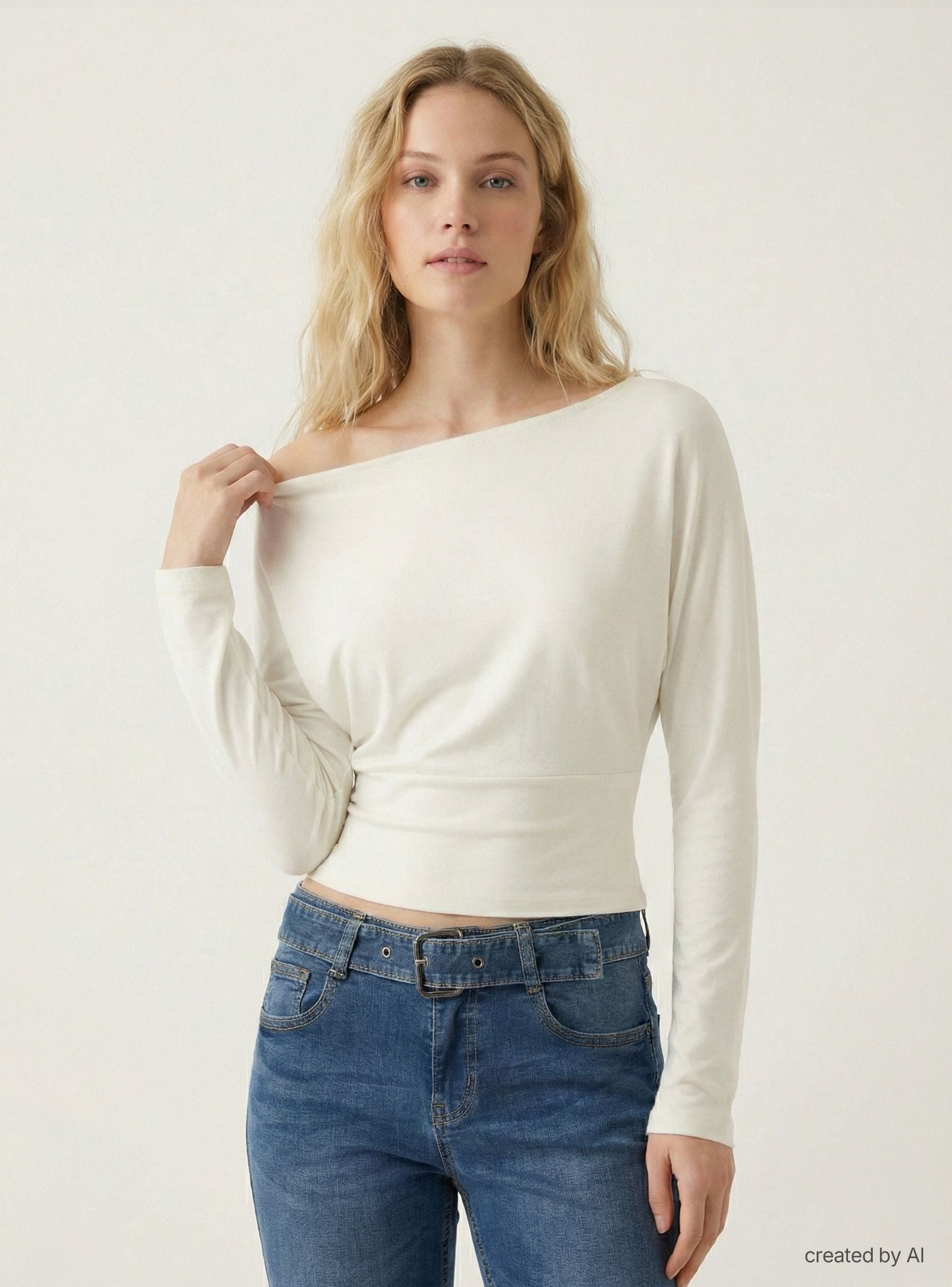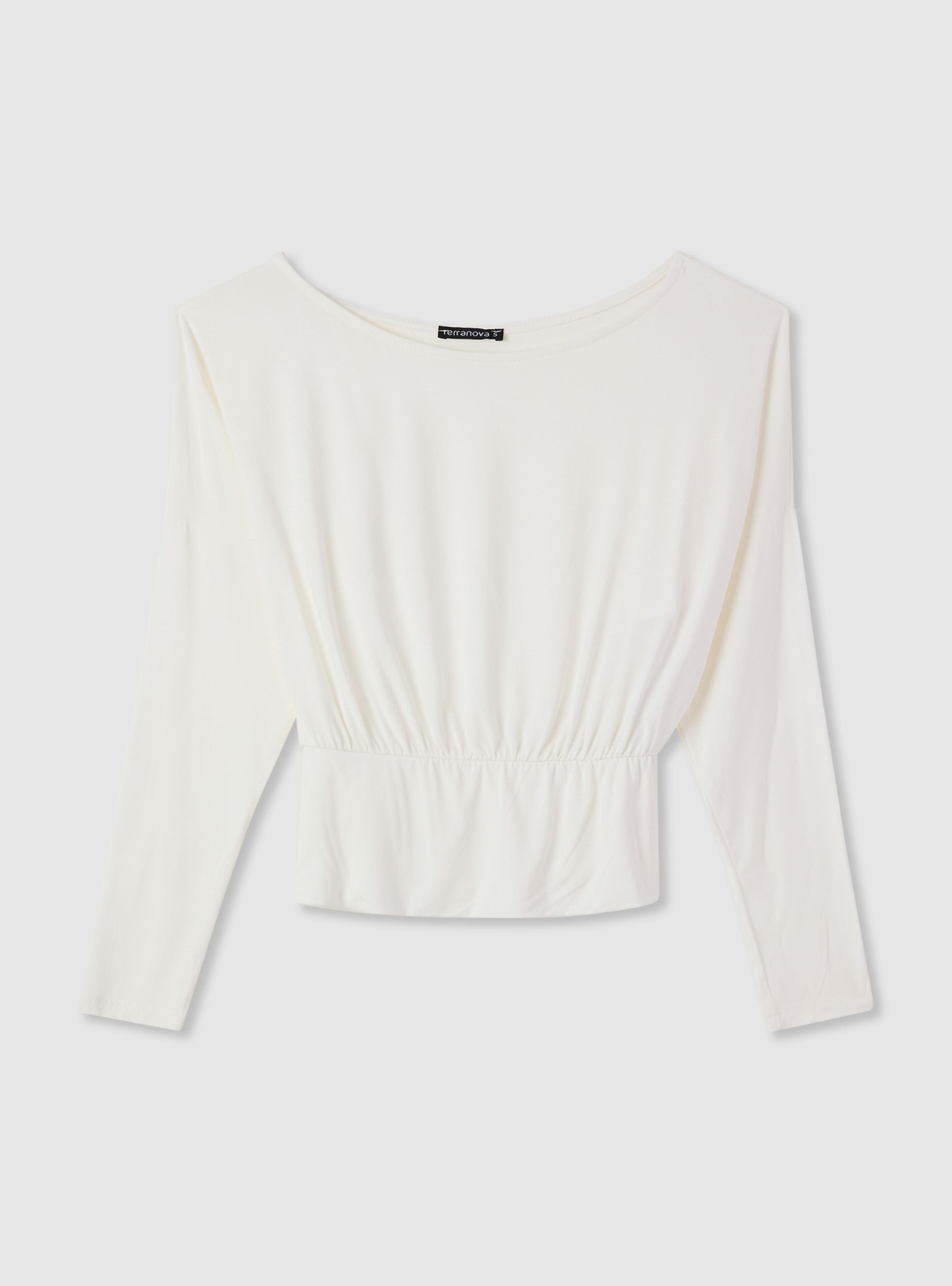 Damska jednokolorowa koszulka z długimi rękawami i szerokim dekoltem podkreślającym odkryte ramiona. Talia z elastycznym pasem tworzy efekt marszczenia i krótką długość, idealną do jeansów z wysokim stanem lub spódnic. Luźny krój na biuście i proste mankiety, idealna na casualowe stylizacje i nieformalne wieczory z minimalistycznymi dodatkami.Szczegóły