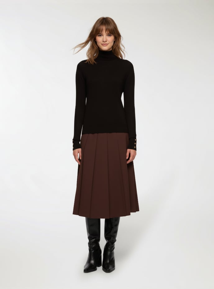 Damski golf, idealny na elegancki i profesjonalny wygląd. Posiada dopasowany krój podkreślający sylwetkę, z detalami guzików na mankietach, które dodają wyrafinowanego akcentu. Doskonały do zestawienia z formalnymi spodniami lub spódnicami na okazje zawodowe lub wieczorne wydarzenia. Wszechstronny element garderoby, który pasuje do wielu stylizacji.