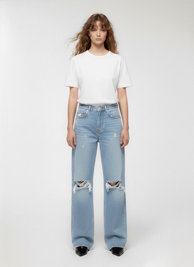 Damskie jeansy o szerokim kroju i nowoczesnym designie. Posiadają zapięcie na guzik i zamek błyskawiczny. Model wide leg zapewnia casualowy i wygodny wygląd, idealny do łączenia z t-shirtami lub koszulami. Dekoracyjne przetarcia dodają miejskiego stylu, doskonałe na nieformalne i modne outfity.