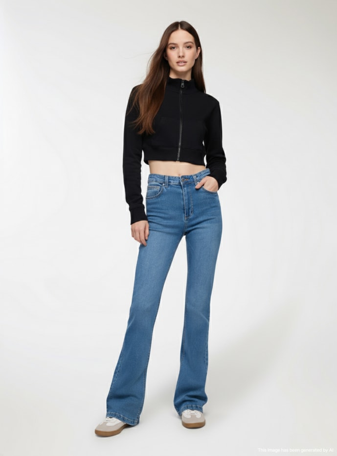 Damskie jeansy o nowoczesnym i uniwersalnym designie, idealne na casualowy i modny look. Posiadają fason dzwony, który podkreśla sylwetkę, z wysokim stanem dla optymalnego komfortu. Wyposażone w zapięcie na guzik i zamek oraz funkcjonalne kieszenie z przodu i z tyłu. Doskonałe do zestawienia z dopasowanymi topami lub miękkimi koszulami, tworząc kompletną i modną stylizację.