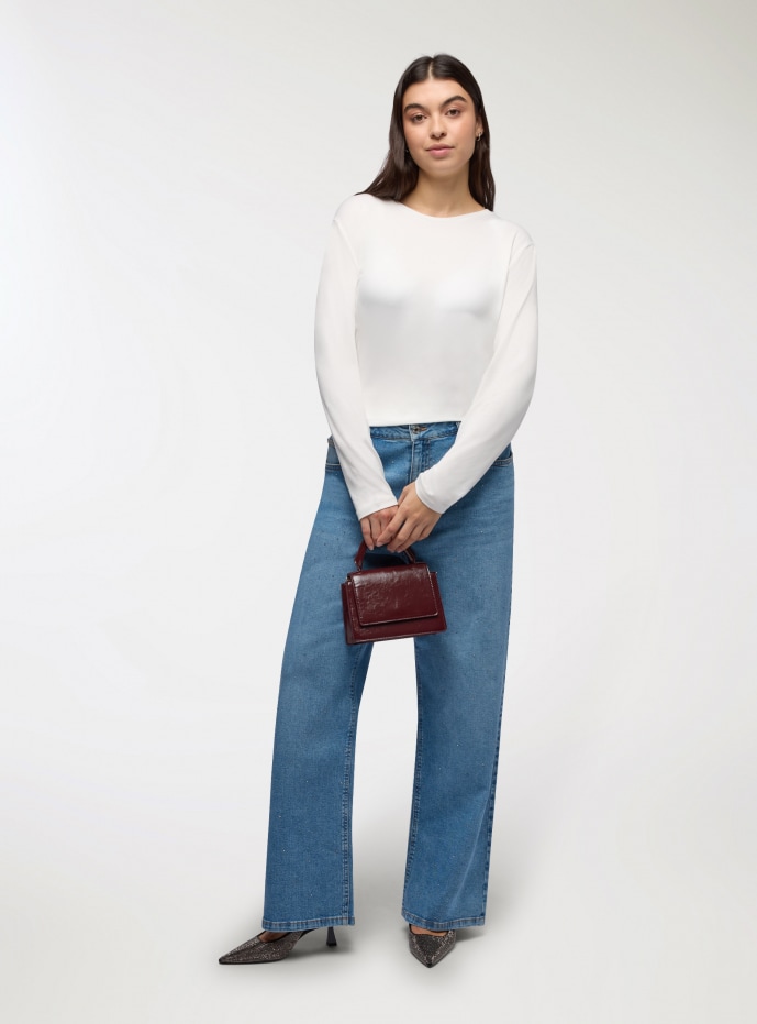 Damskie jeansy o szerokich nogawkach, idealne na codzienne stylizacje z nutą blasku. Model długi, z średnim stanem, zapinany na guzik i zamek, z pięcioma kieszeniami i szlufkami na pasek. Komfortowe dopasowanie, które opada prosto od uda do dołu, doskonałe w połączeniu z t-shirtem i sneakersami lub koszulą i sandałami. Gładki kolor ozdobiony mikro cyrkoniami rozmieszczonymi z przodu i z tyłu, aby rozświetlić każdą stylizację.