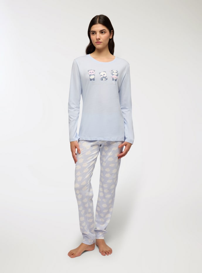 Damski komplet piżamowy składający się z długiego rękawa koszulki i długich spodni. Koszulka ma nadruk z uroczymi pandami i dekoracyjny napis, natomiast spodnie zdobi wzór w chmurki. Idealny na chwile relaksu i odpoczynku, ta piżama zapewnia komfort i styl podczas wieczorów w domu.