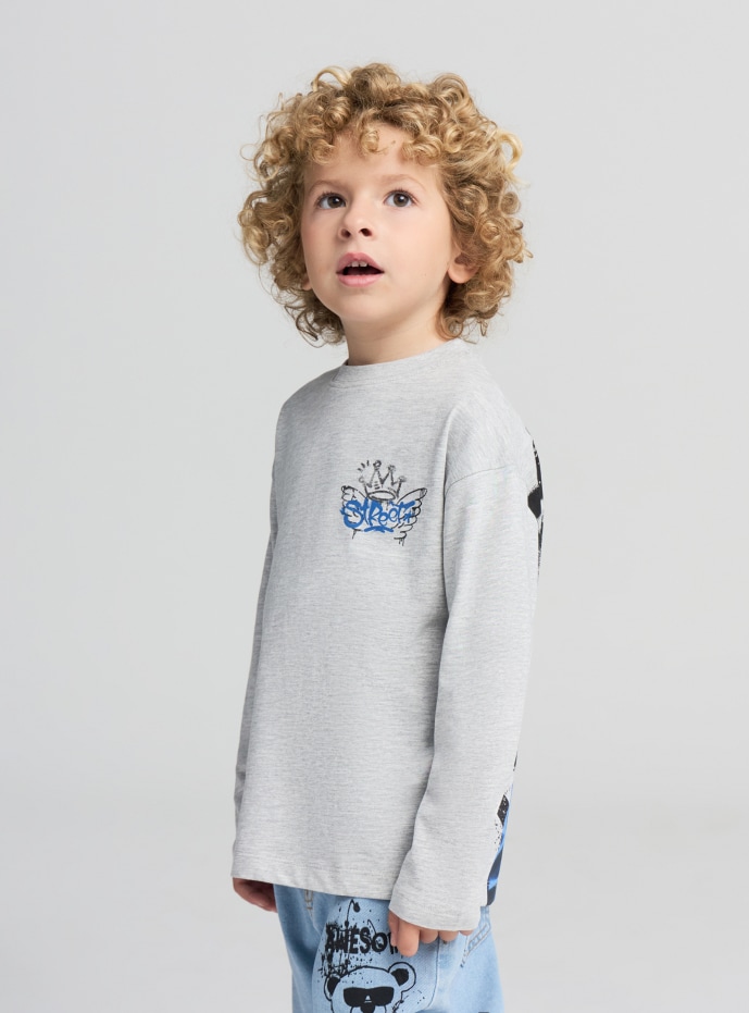 Dziecięca koszulka z długim rękawem w stylu urban, z małym napisem na piersi i dużym nadrukiem misia na plecach w klimacie graffiti. Okrągły dekolt i regularny krój dla codziennego komfortu, idealna do szkoły i na czas wolny. Łatwa do zestawienia z jeansami lub szortami, można ją też nosić pod bluzami lub kurtkami w chłodniejsze dni.