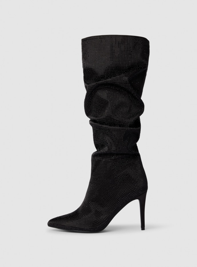 Damskie kozaki idealne na eleganckie wieczory i specjalne okazje. Posiadają zdobienie z kryształkami, zamek błyskawiczny dla wygodnego zakładania oraz wysoki obcas, który wysmukla sylwetkę. Idealne do zestawienia z sukienkami lub obcisłymi spodniami, tworząc wyrafinowany i efektowny look. Wysokość obcasa 11 cm.