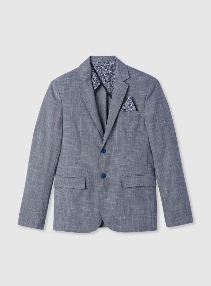 Męska marynarka o eleganckim i nowoczesnym designie, charakteryzująca się czystymi liniami i doskonałym krojem podkreślającym sylwetkę. Posiada klasyczne klapy i zapięcie na dwa guziki. Wyposażona w dopasowaną poszetkę w kieszeni na piersi, idealna na wydarzenia i uroczystości oraz do biznesowego looku z koszulą i eleganckimi spodniami. Regularny krój i długie rękawy, doskonała również do noszenia z chinosami dla zadbanego, casualowego stylu.