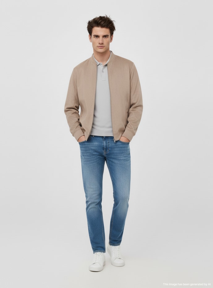 Męska kurtka o wyrafinowanym i nowoczesnym stylu, model bomber z materiału przypominającego zamsz, idealna na wszechstronny i elegancki wygląd. Zamek błyskawiczny zapewnia praktyczność, a boczne kieszenie z zatrzaskami dodają funkcjonalności. Długie rękawy z elastycznymi mankietami zapewniają komfort. Doskonała z dżinsami i sneakersami na casualowy strój lub z chinosami i mokasynami dla bardziej wyrafinowanego akcentu.
