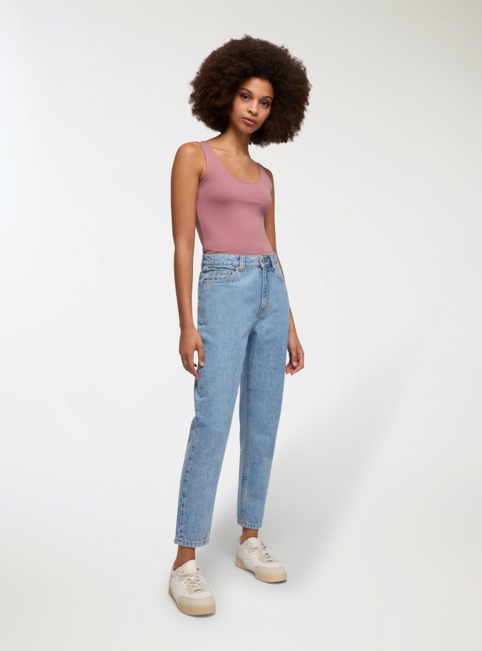 Jeans w fasonie "mom fit" w jasnym dżinsie. Zapięcie na zamek i guzik. Model z pięcioma funkcjonalnymi kieszeniami, dwoma z przodu, dwoma z tyłu i małą kieszonką na monety. Kontrastujące szwy podkreślają ich estetykę, dodając autentycznego i vintage'owego stylu. Luźny krój zapewnia maksymalny komfort, nie rezygnując ze stylu.
