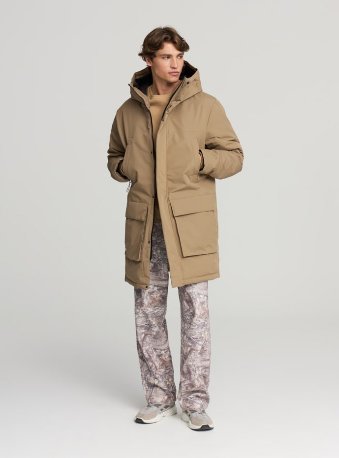 Długi, ocieplany męski parka z kapturem, zaprojektowany, aby zapewnić maksymalny komfort podczas sezonu zimowego. Funkcjonalny design z długimi rękawami i wewnętrznymi mankietami, gwarantuje optymalną ochronę przed zimnem, z ukrytą zapięciem na zamek błyskawiczny i zatrzaskami. Tkanina odporna na wodę w jednolitym kolorze. Wyposażony w cztery zewnętrzne kieszenie na zamek i jedną wewnętrzną kieszeń na rzep. Idealny na deszczowe lub wietrzne dni, doskonały do noszenia na casualowe lub robocze stylizacje.