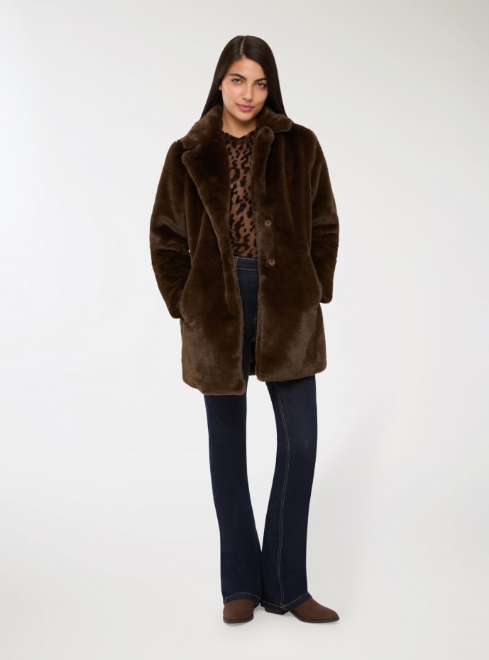 Płaszcz damski z kołnierzem z klapami, idealny do nadania wyrafinowanego charakteru zimowym stylizacjom. Średnia długość i prosty krój podkreślają sylwetkę, podczas gdy wykończenie w efekcie futra dodaje elegancji. Wyposażony w praktyczne zatrzaski i boczne kieszenie, doskonale komponuje się z szerokimi spodniami lub sukienkami midi, idealny na formalne okazje lub wieczory w mieście.
