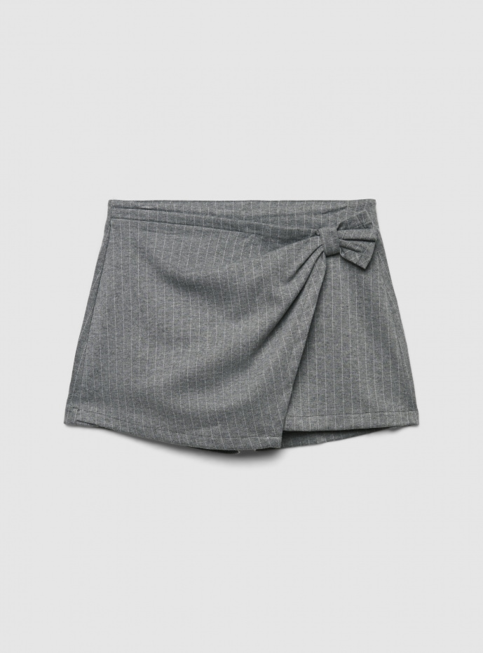 Spodenki-spódniczka dziewczęca w prążkowany wzór. Krótki model z przednim panelem w stylu wrap i boczną kokardą, która dodaje elegancji. Wygodne i praktyczne dopasowanie, łatwe do zestawienia z koszulami lub włożonymi koszulkami oraz kardiganem. Bez widocznego zapięcia dla szybkiego ubierania. Tył w formie szortów zapewnia swobodę ruchów. Idealne do sneakersów lub balerinek.
