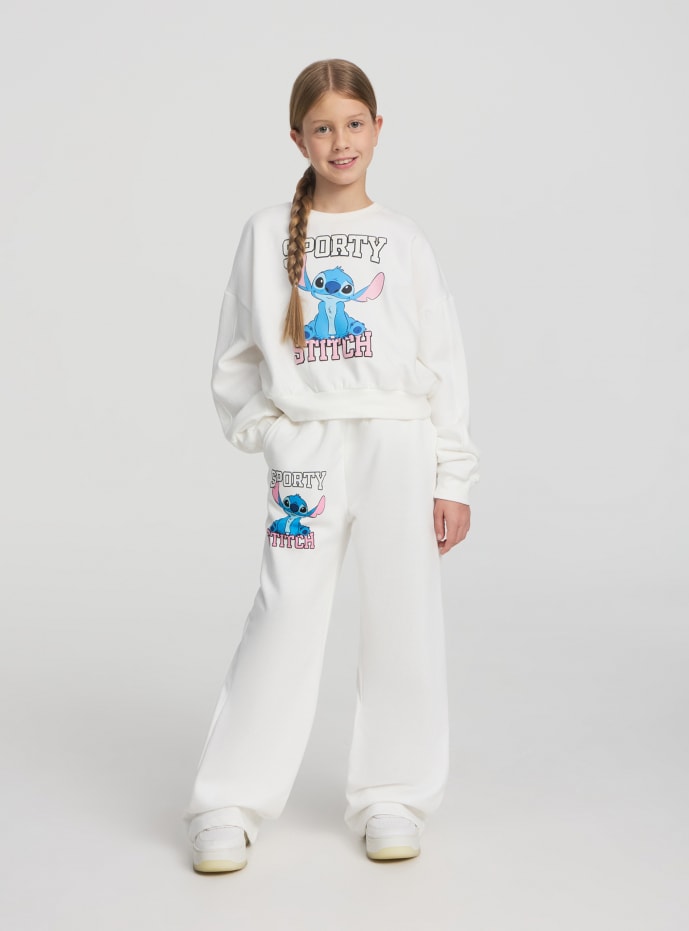 Dziecięce dresowe spodnie treningowe z sportowym wzorem i nadrukiem Stitch®. Charakteryzują się szerokim i wygodnym krojem, idealne do codziennych i sportowych aktywności. Wyposażone w skośne kieszenie i elastyczną talię z sznurkiem do regulacji, zapewniają optymalne dopasowanie. Idealne do tworzenia wygodnych i zabawnych zestawów, które można łączyć z t-shirtami i sneakersami dla dynamicznego looku.