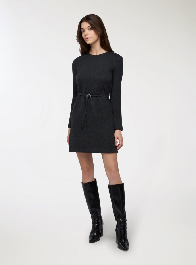 Sukienka damska w jednolitym kolorze, idealna do biura i na czas wolny. Krój regularny o długości sięgającej nad kolano, z prostym dekoltem i długimi rękawami. Wąski pasek z klamrą w talii podkreślający sylwetkę. Łatwa do zestawienia z botkami lub sneakersami. Doskonała pod płaszcz lub krótką kurtkę w okresie przejściowym. Prosty, jednolity design, minimalistyczny i uniwersalny, bez kieszeni i o prostym kroju.