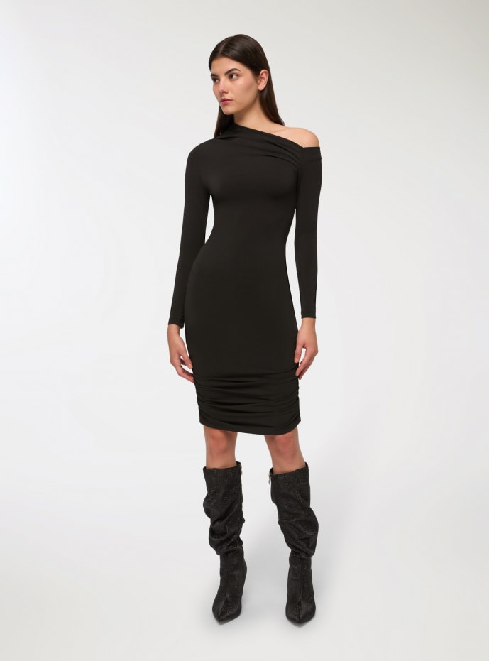 Sukienka damska z asymetrycznym dekoltem i długimi rękawami, wyróżniająca się eleganckimi marszczeniami podkreślającymi sylwetkę. Wykonana z jednolitego, elastycznego materiału. Idealna na formalne okazje i wyjątkowe wieczory, doskonale komponuje się z wysokimi obcasami i wyrafinowanymi dodatkami, tworząc wyrafinowany i nowoczesny look.