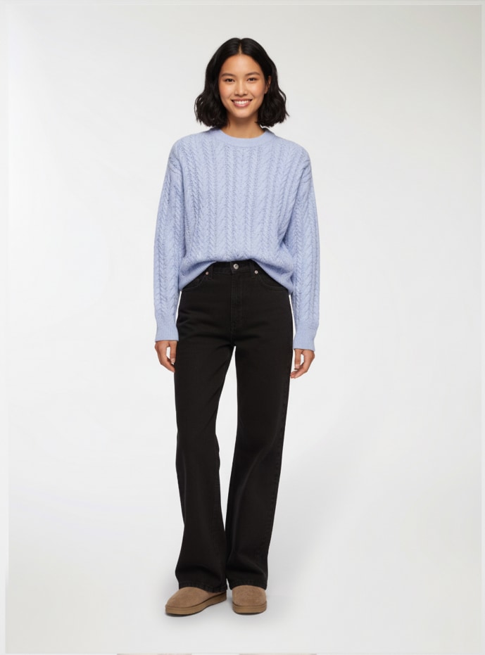 Damski sweter z warkoczowym splotem, idealny na casualowy i wygodny wygląd. Posiada okrągły dekolt i długie rękawy, doskonały do zestawienia z jeansami lub spodniami na codzienny strój. Regularny krój zapewnia komfort i styl, dzięki czemu nadaje się na różne okazje.