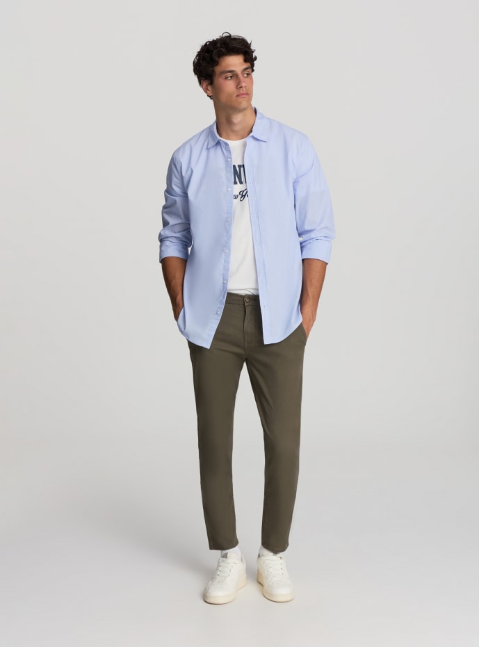 Męskie spodnie chino o kroju skinny, idealne na casualowy, ale zadbany wygląd. Wykonane z lekko elastycznego materiału twill, zapewniają komfort i swobodę ruchów przez cały dzień. Posiadają boczne kieszenie, kieszenie tylne z lamówką oraz zapięcie z przodu na guzik i zamek. Idealne do zestawienia z koszulami lub swetrami, oferują wszechstronny styl, od pracy po czas wolny.