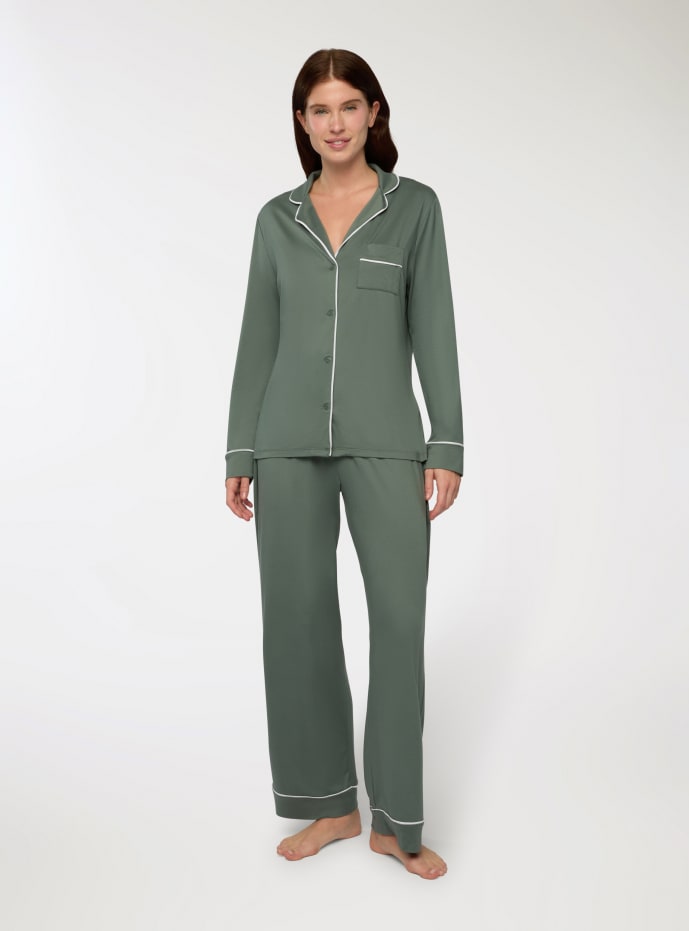 Piżama damska składająca się z koszuli z długim rękawem oraz długich spodni. Koszula posiada kołnierzyk z klapami, zapięcie na guziki oraz naszytą kieszonkę na piersi. Spodnie zapewniają wygodne dopasowanie dzięki elastycznemu pasowi w talii. Idealna na chwile relaksu lub spokojną noc snu, ta piżama łączy praktyczność ze stylem i eleganckimi detalami.