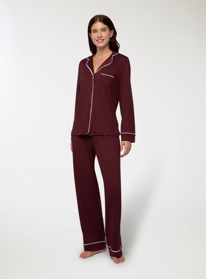 Piżama damska składająca się z koszuli z długim rękawem i długich spodni. Koszula posiada kołnierzyk z klapami, zapięcie na guziki oraz naszytą kieszeń na piersi. Spodnie zapewniają wygodne dopasowanie dzięki elastycznemu pasowi. Idealna na chwile relaksu lub spokojną noc snu, ta piżama łączy praktyczność ze stylem i eleganckimi detalami.