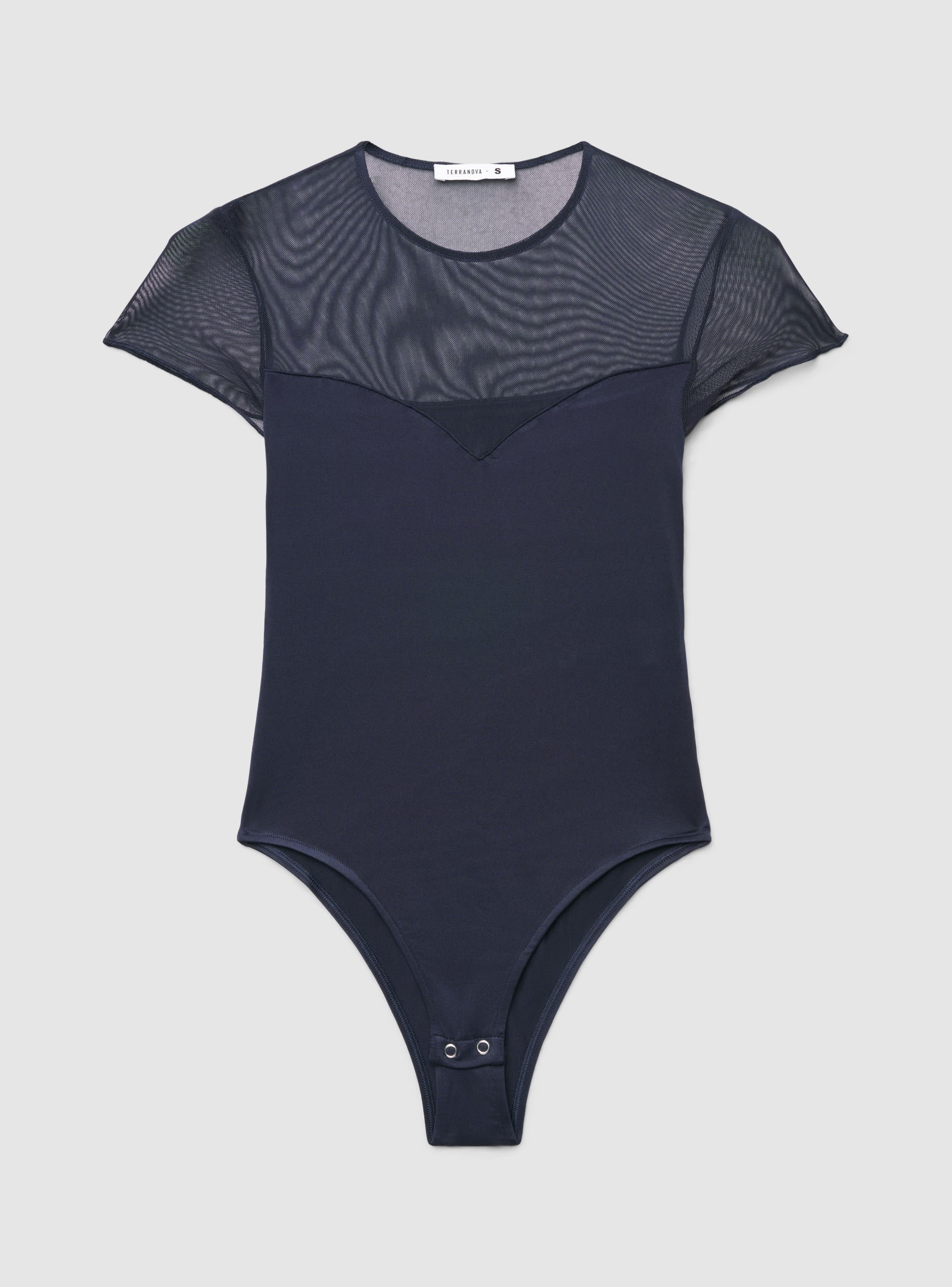 Body da donna con girocollo e maniche corte, pensato per look da sera. Il design a tinta unita è valorizzato dall’inserto trasparente sul décolleté e sulle spalle, che crea un elegante effetto vedo non vedo. Linea aderente da indossare con pantaloni a vita alta o gonne, con pratica chiusura con bottoni a pressione sul fondo.Dettagli