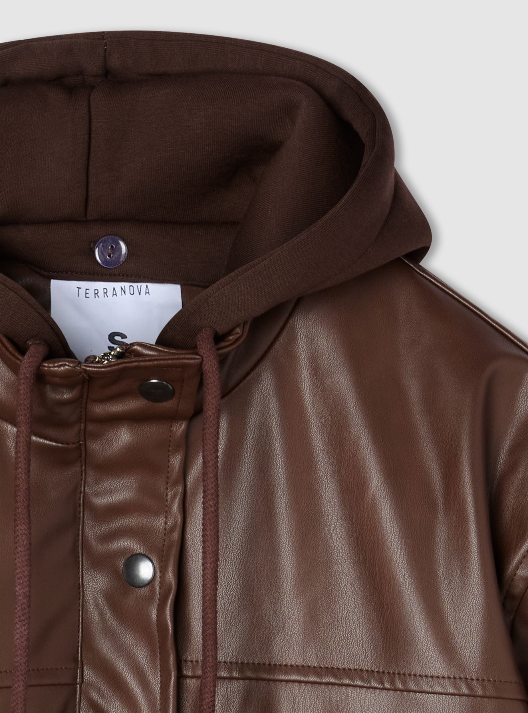Bomber da donna in effetto pelle, con cappuccio in felpa. Chiusura frontale con zip coperta da pattina con bottoni a pressione, polsini elasticizzati e fondo regolabile. Tasche laterali. Ideale per il tempo libero in città, si abbina a jeans e sneakers per un look casual oppure a pantaloni per un tocco urbano.Dettagli