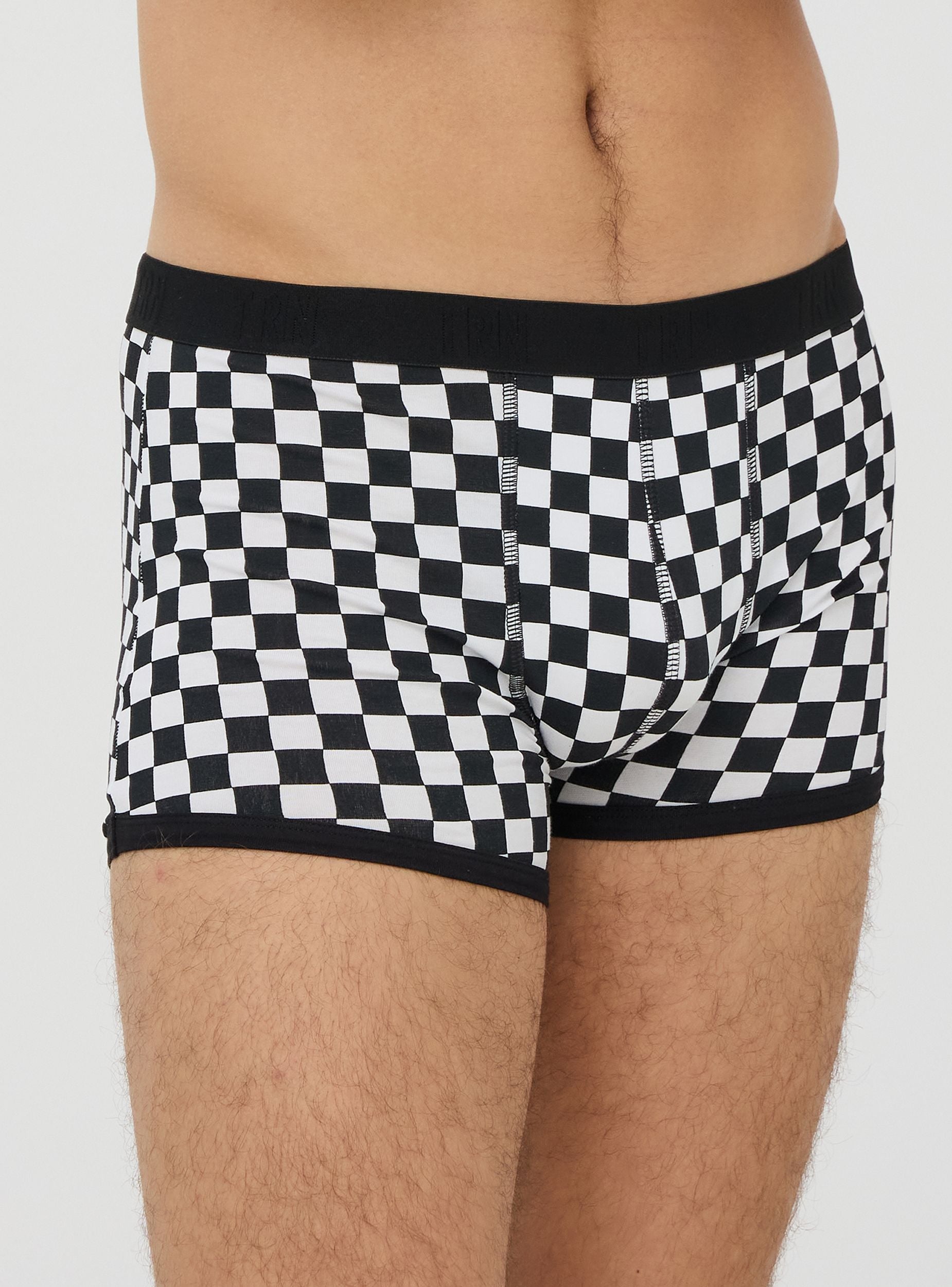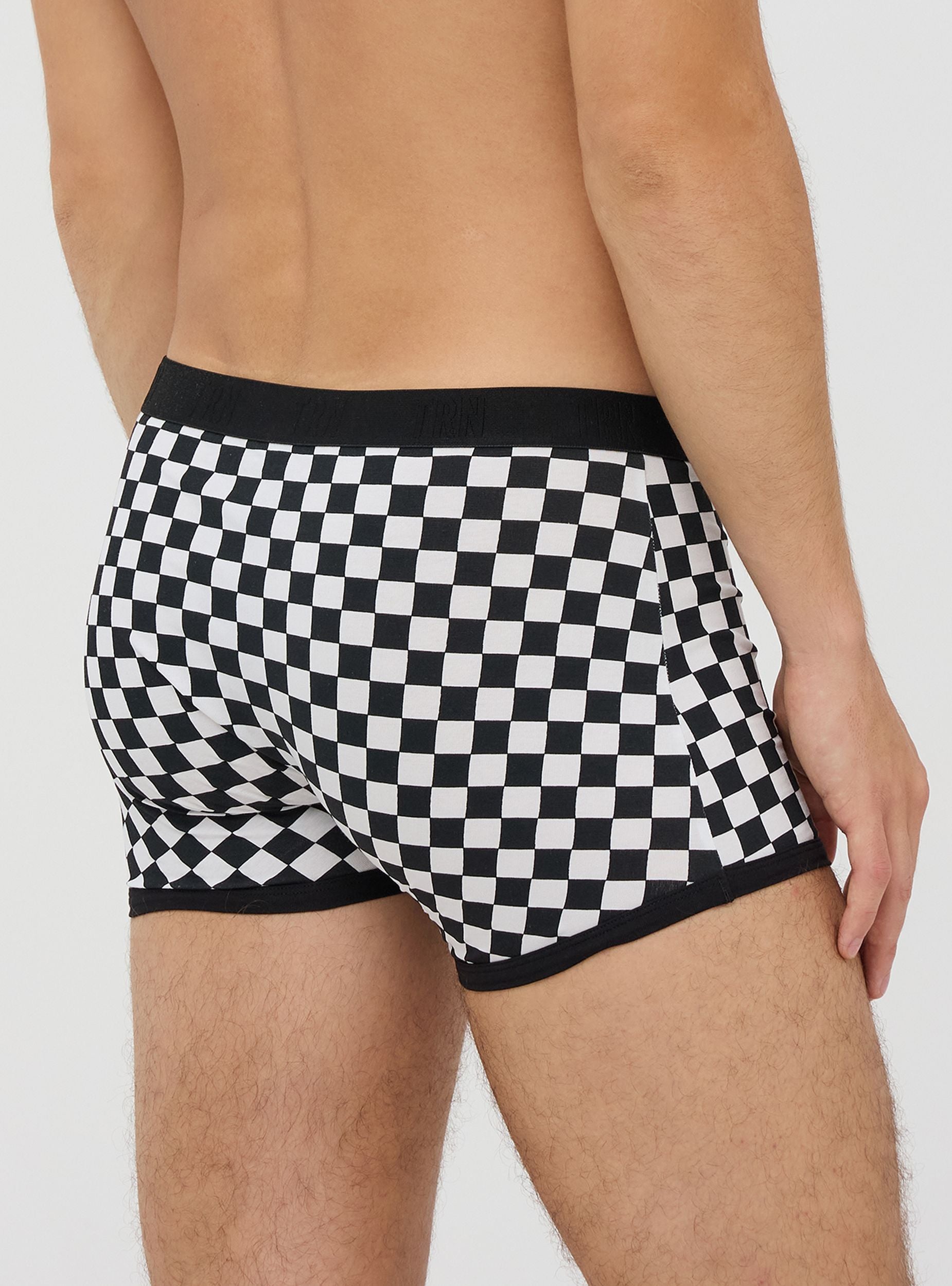 Boxer da uomo realizzati in cotone elasticizzato morbido e traspirante per un comfort quotidiano. Caratterizzati da un accattivante pattern a quadri bianchi e neri su tutta la superficie, in stile race, questi boxer uniscono stile e praticità. Dotati di una fascia elastica nera, con logo TRN, in vita per una vestibilità sicura e comoda.Dettagli
