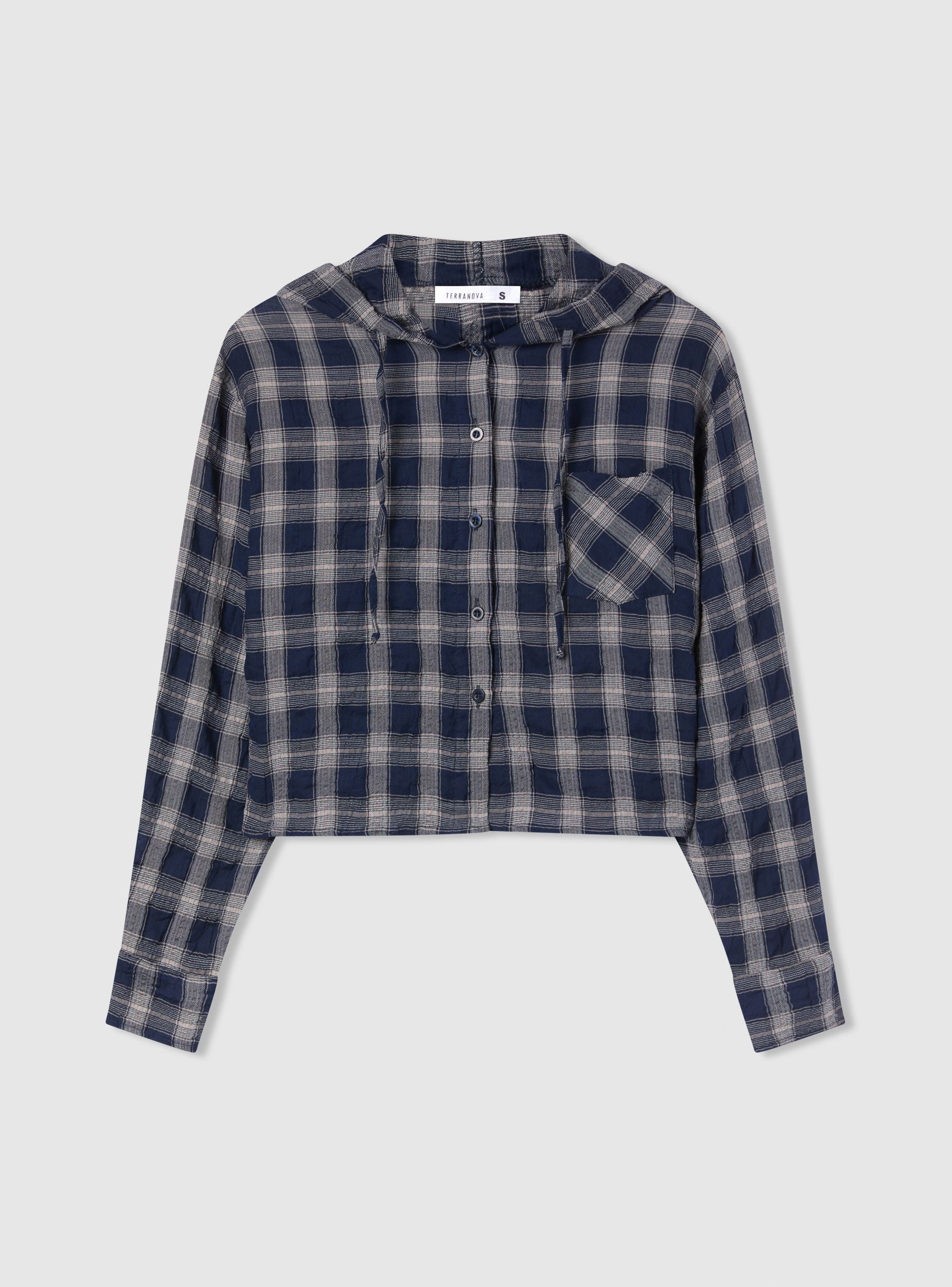 Camicia da donna a quadri con cappuccio e chiusura frontale a bottoni. Modello crop, maniche lunghe con polsino e taschino applicato sul petto. Ideale per outfit casual con jeans o pantaloncini, perfetta anche sopra una maglietta. Design versatile per il tempo libero, facile da abbinare a sneakers o anfibi.Dettagli