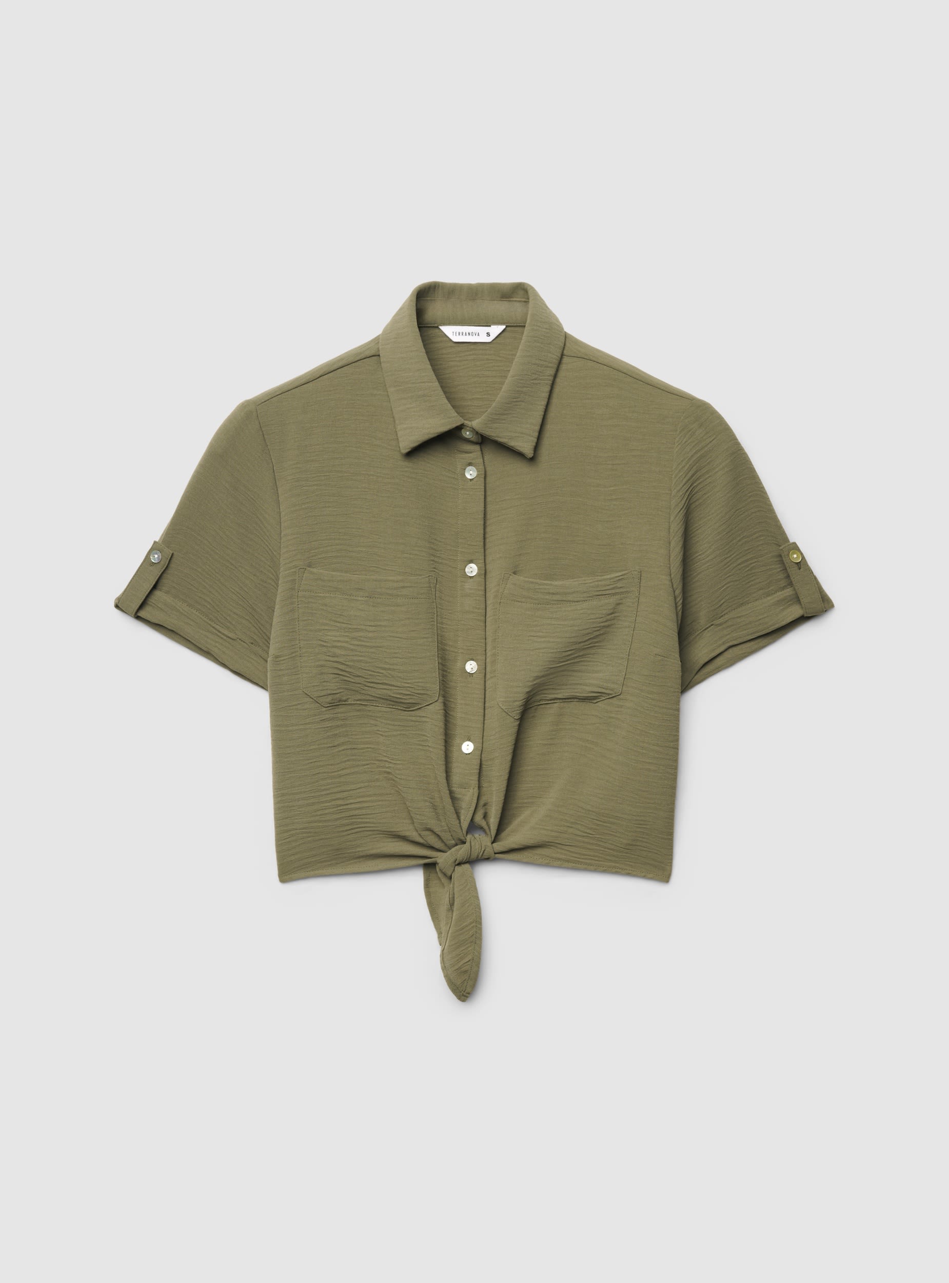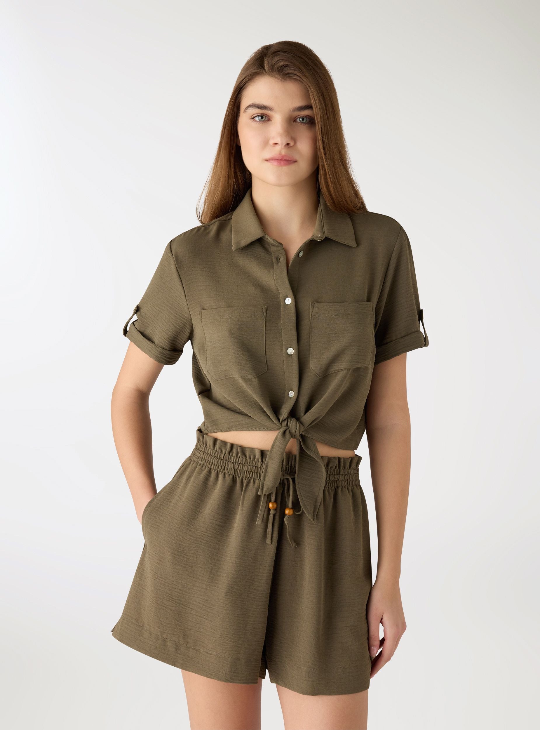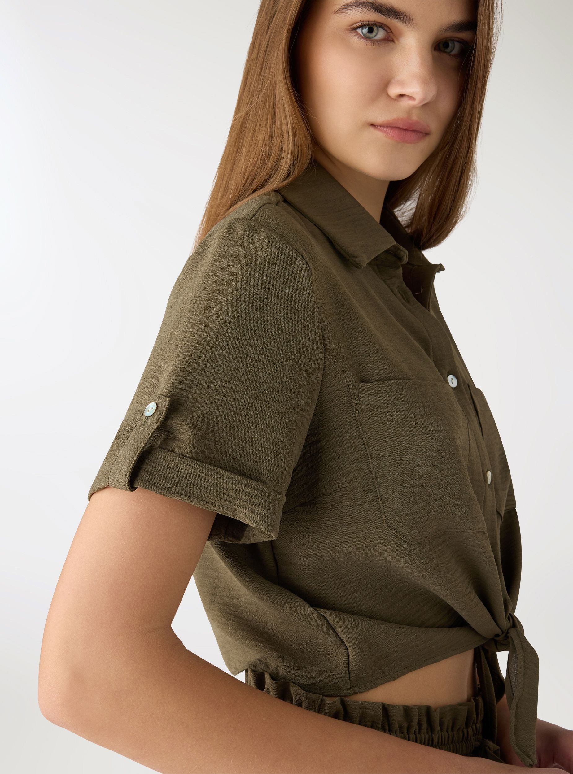 Camicia da donna a maniche corte in tinta unita con vestibilità crop e nodo frontale. Colletto a punta, chiusura con bottoni e due tasche applicate sul petto. Maniche con risvolto fissato da alamaro e bottone. Perfetta per look casual o trendy, si abbina a jeans a vita alta, gonne e pantaloncini per creare outfit freschi e versatili nelle giornate libere o in città.Dettagli