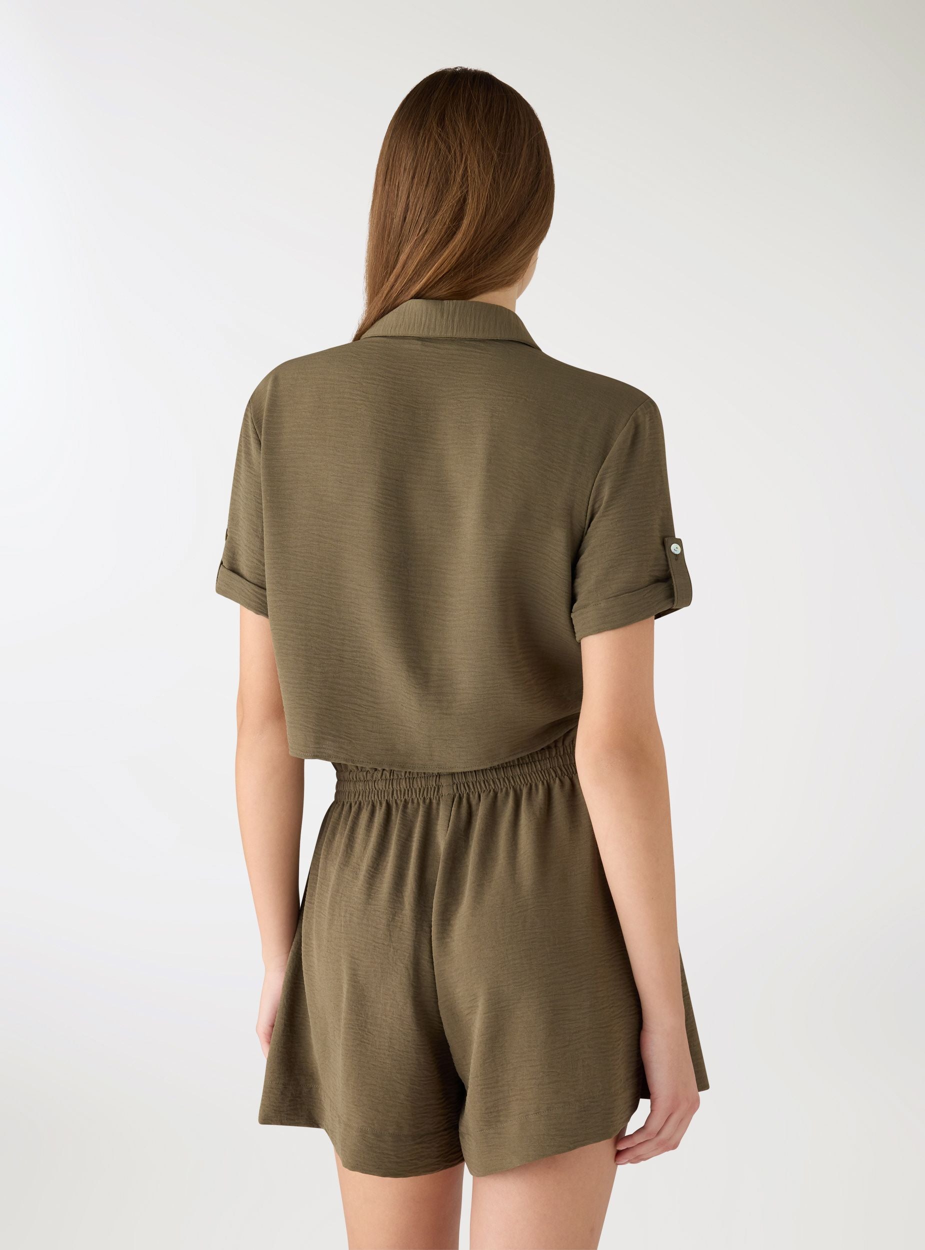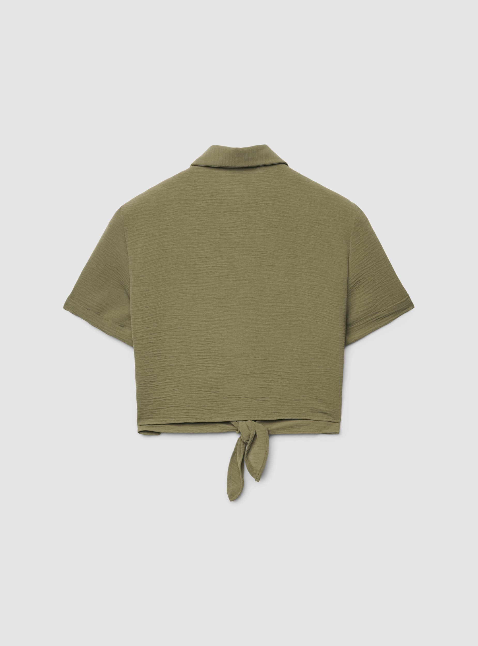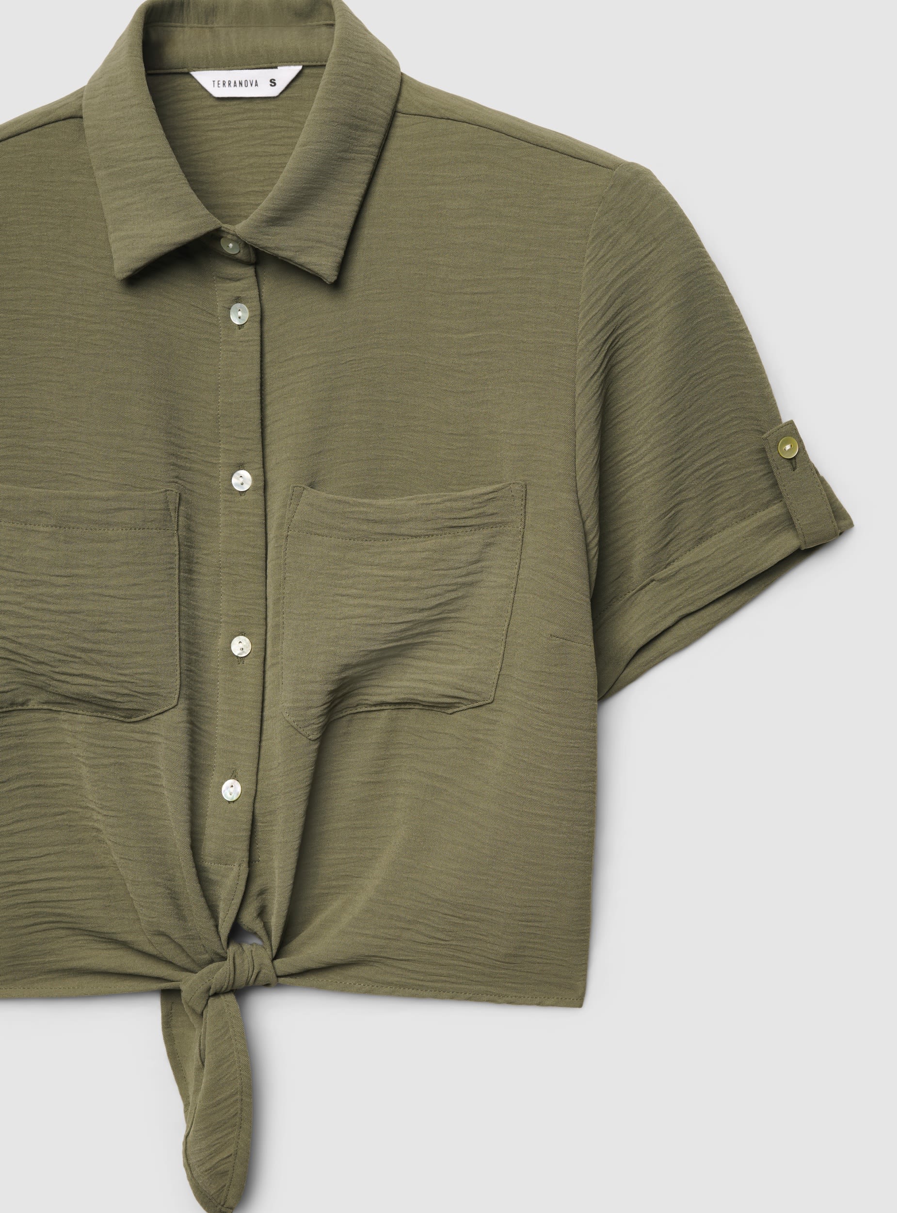 Camicia da donna a maniche corte in tinta unita con vestibilità crop e nodo frontale. Colletto a punta, chiusura con bottoni e due tasche applicate sul petto. Maniche con risvolto fissato da alamaro e bottone. Perfetta per look casual o trendy, si abbina a jeans a vita alta, gonne e pantaloncini per creare outfit freschi e versatili nelle giornate libere o in città.Dettagli