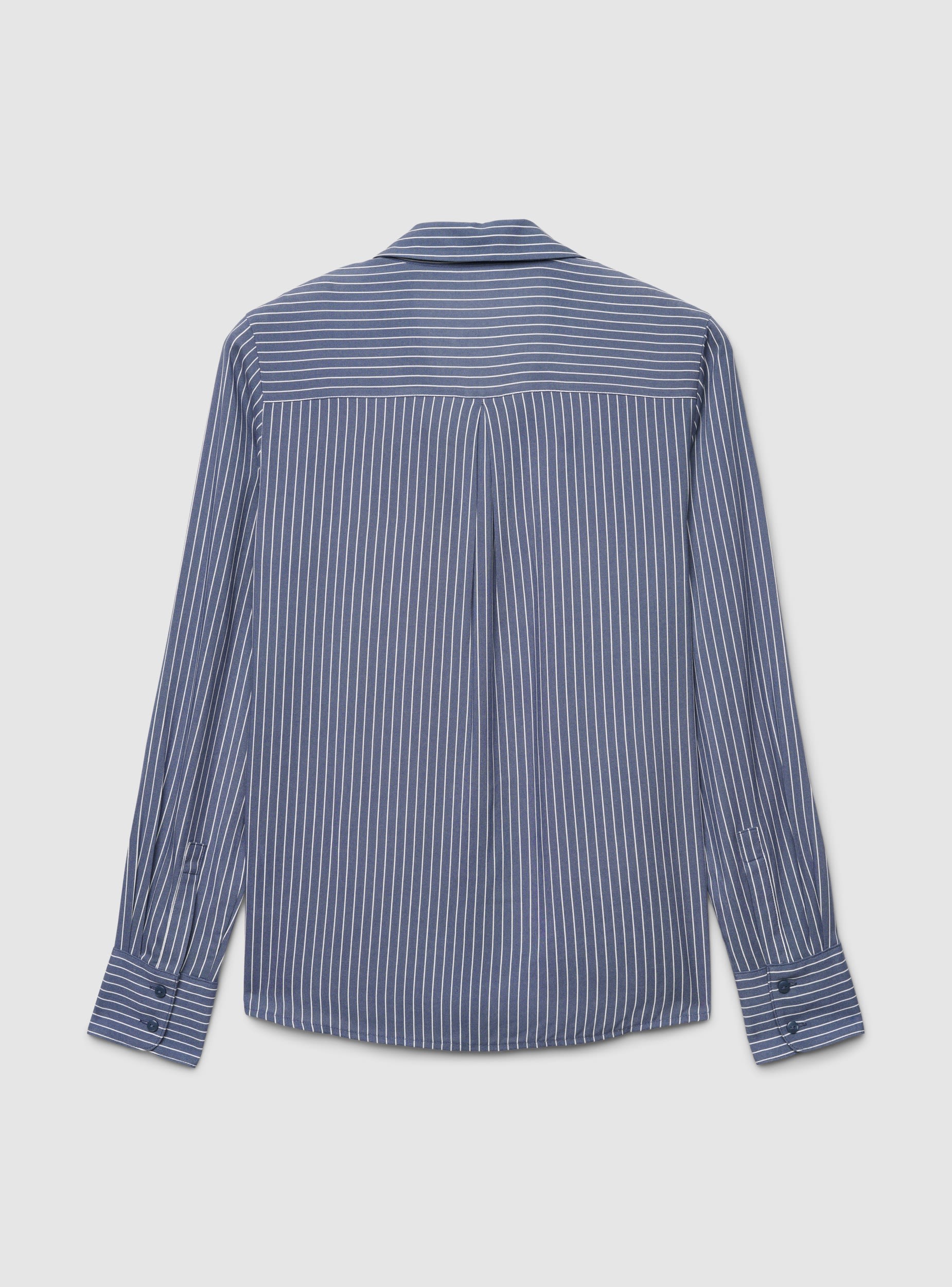 Camicia da donna a righe con colletto e scollatura a V, ideale per look casual o ufficio. Chiusura frontale con bottoni e polsini abbottonati. Taglio regolare che cade morbido sui fianchi, pensata per essere indossata con jeans, pantaloni sartoriali o una gonna midi. Perfetta per stratificare sotto un blazer o un cardigan, aggiunge un tocco curato a ogni outfit grazie al motivo a righe.Dettagli