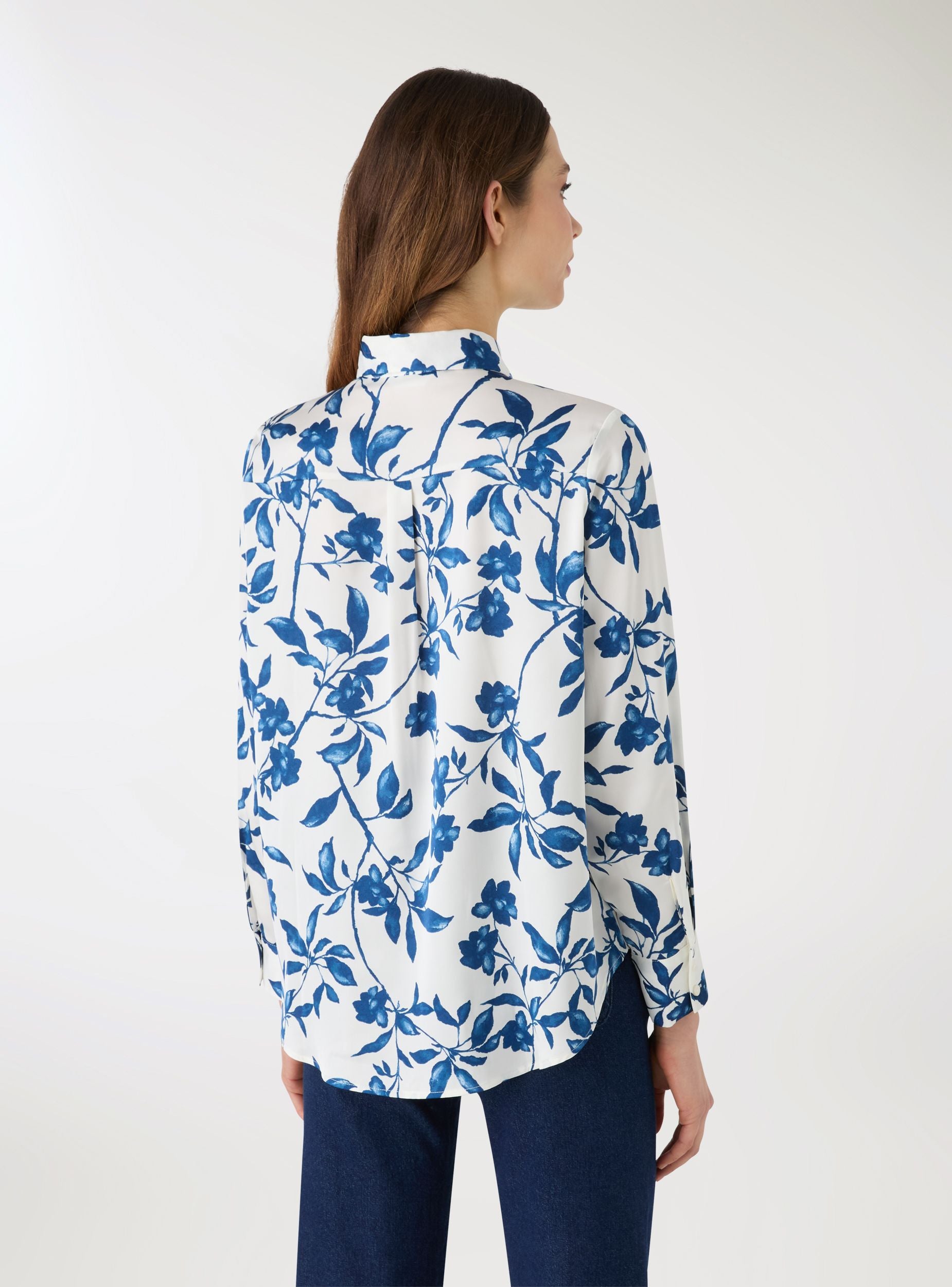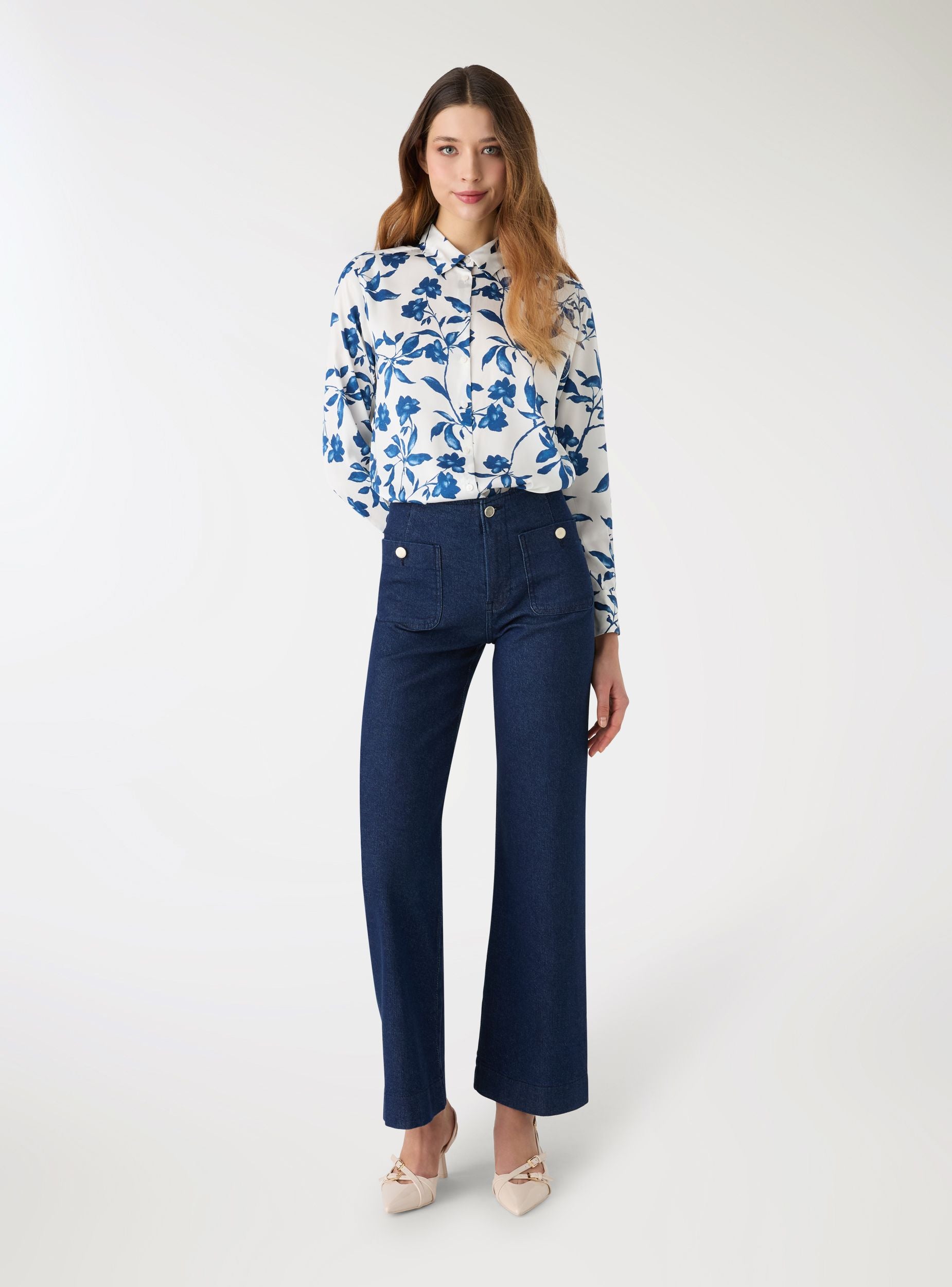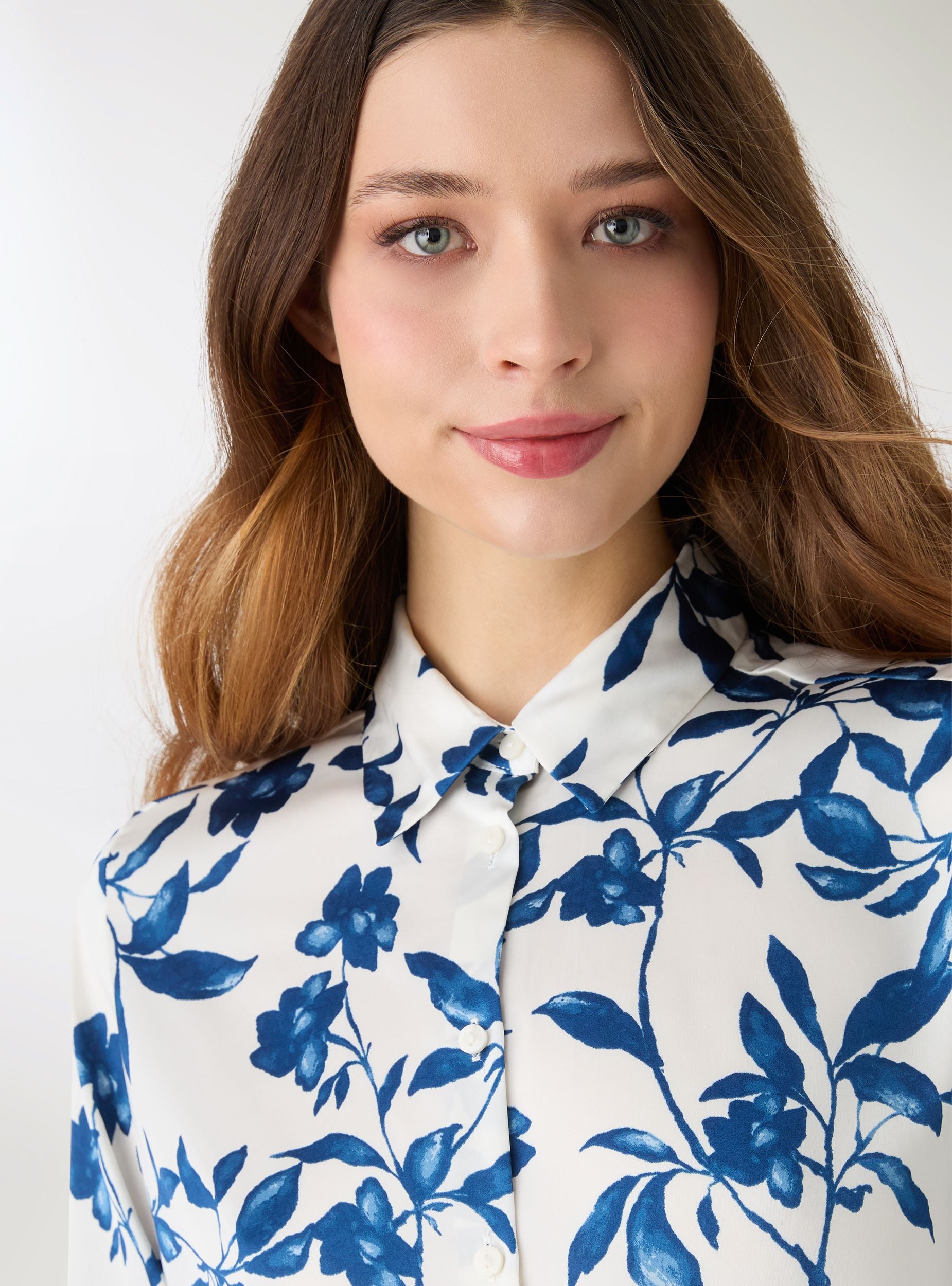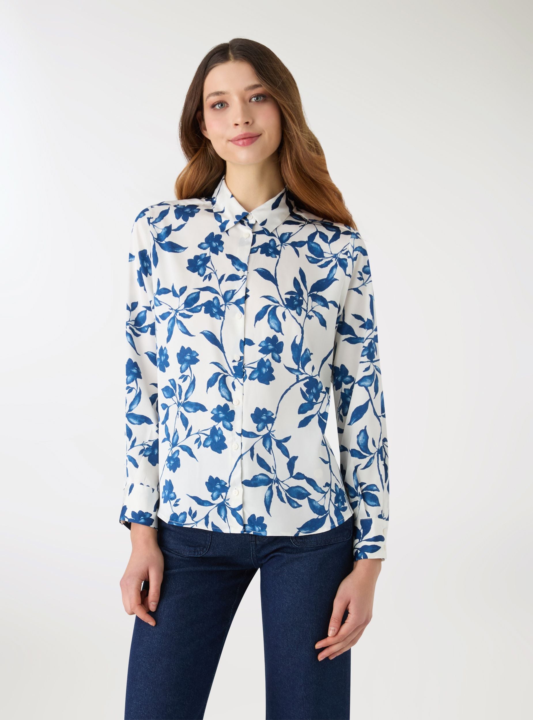Camicia da donna con stampa floreale, pensata per look da giorno e abbinamenti easy chic. Modello a maniche lunghe con colletto a camicia e chiusura frontale con bottoni, rifinito da polsini con bottoni. La vestibilità ampia la rende ideale su jeans o pantaloni sartoriali, anche aperta sopra un top per layering leggero.Dettagli
