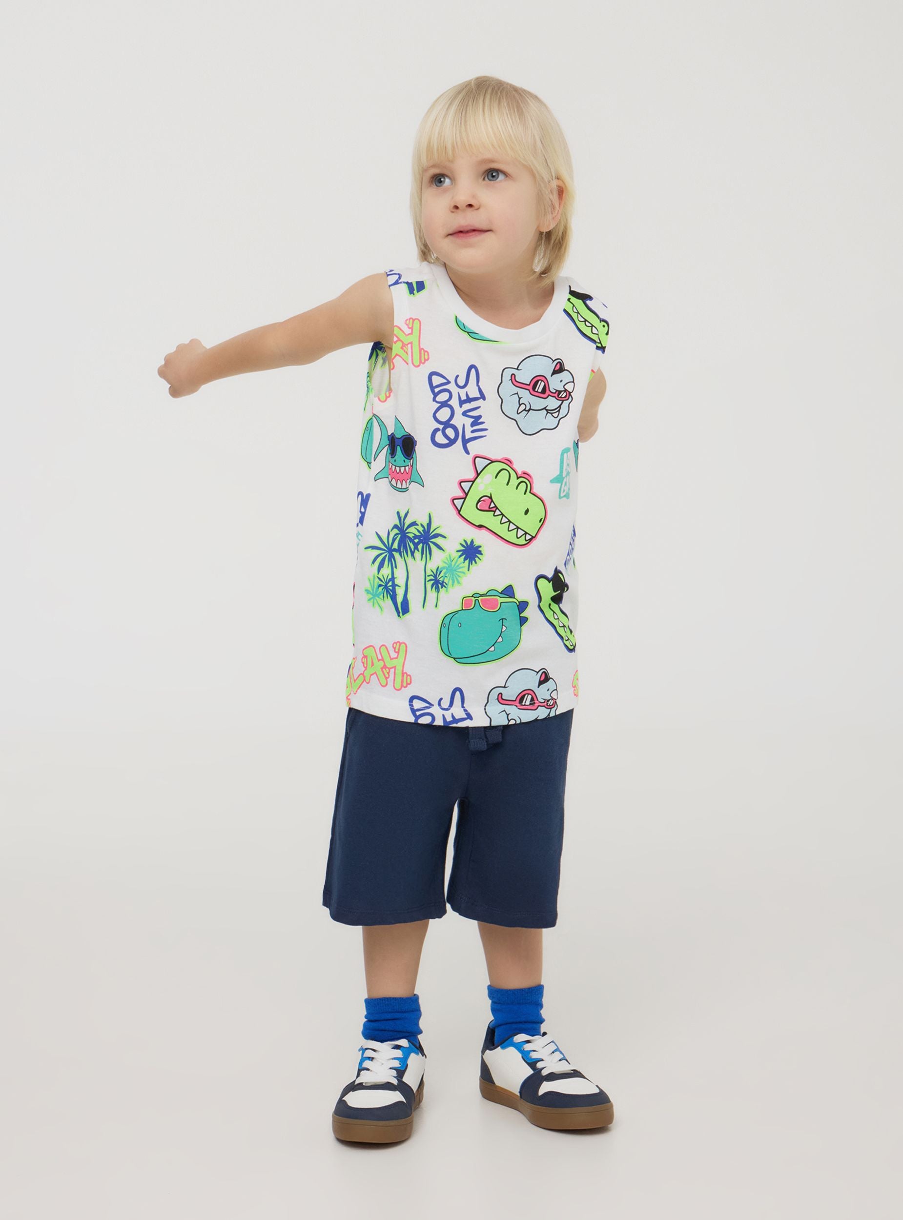 Canotta da bimbo con stampe simpatiche all-over, arricchita da divertenti squali, dinosauri, scritte e palme che donano un look vivace e giocoso. Perfetta per le giornate estive, offre comfort e libertà di movimento. Ideale da abbinare a bermuda o pantaloncini per un outfit casual e spensierato, perfetto per il tempo libero, le vacanze o le avventure all'aria aperta.Dettagli