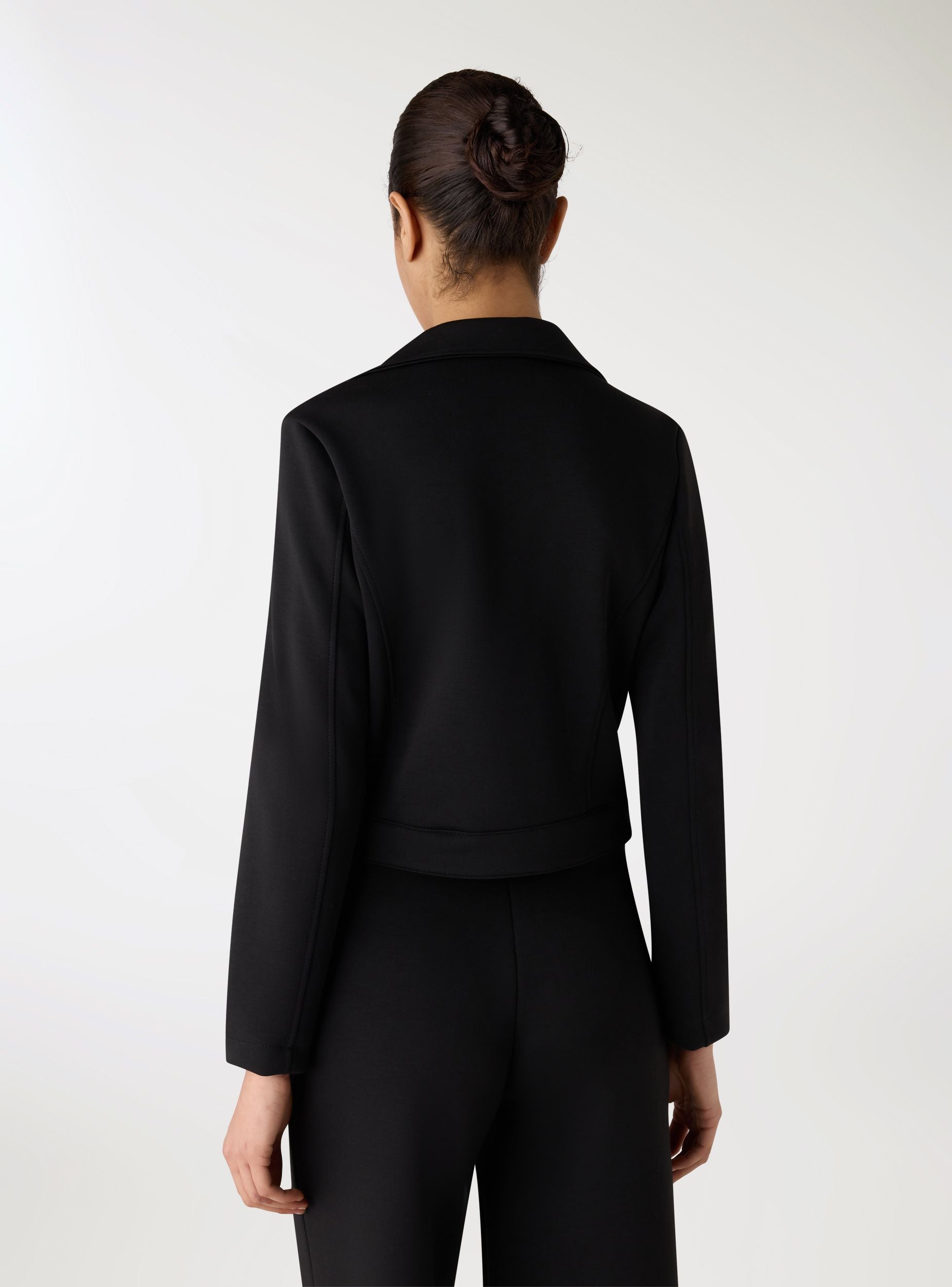 Chiodo da donna tinta unita dal taglio crop, perfetta per dare carattere ai look da giorno e da sera. Il design con collo a revers e chiusura con zip asimmetrica valorizza la silhouette, mentre le maniche lunghe e le impunture sagomate aggiungono definizione. Da abbinare a jeans a vita alta o a un vestito per un contrasto grintoso.Dettagli