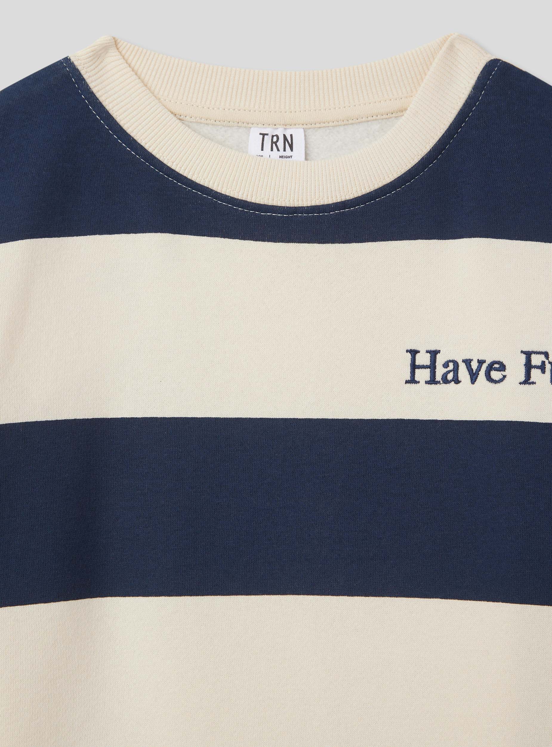 Felpa pesante da bimbo a righe, ideale per un look sportivo e confortevole. Il design senza zip e senza cappuccio la rende perfetta per l'uso quotidiano, garantendo libertà di movimento. La scritta ricamata sul petto aggiunge un dettaglio distintivo e giocoso. Facile da abbinare a jeans o pantaloni sportivi, è perfetta per la scuola, il tempo libero e le avventure all'aria aperta.Dettagli