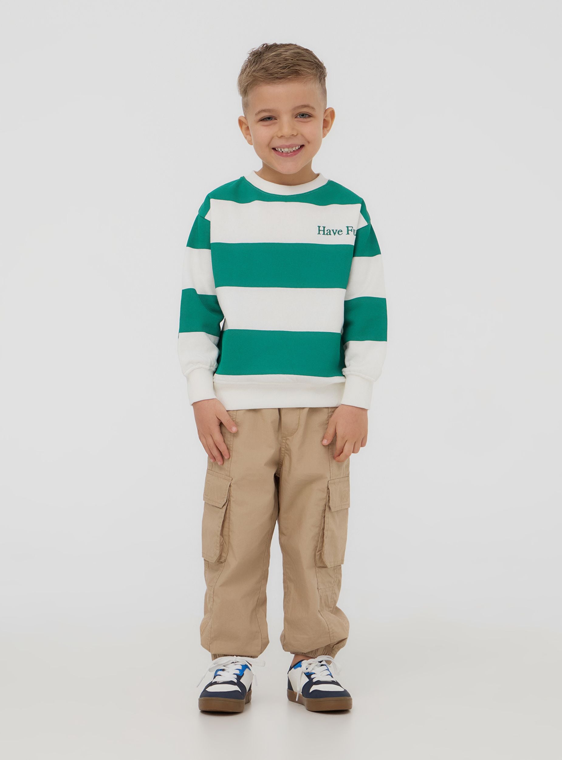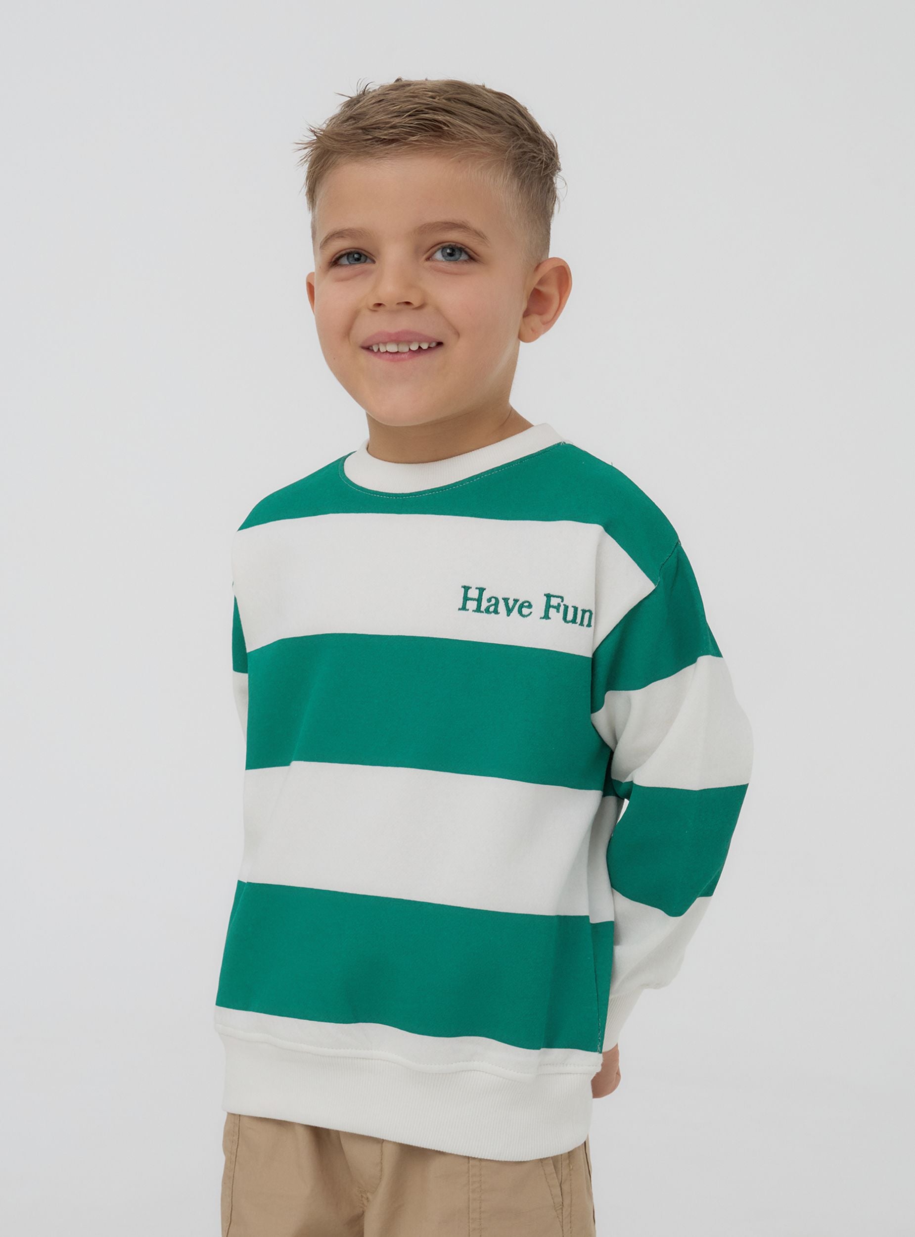 Felpa pesante da bimbo a righe, ideale per un look sportivo e confortevole. Il design senza zip e senza cappuccio la rende perfetta per l'uso quotidiano, garantendo libertà di movimento. La scritta ricamata sul petto aggiunge un dettaglio distintivo e giocoso. Facile da abbinare a jeans o pantaloni sportivi, è perfetta per la scuola, il tempo libero e le avventure all'aria aperta.Dettagli