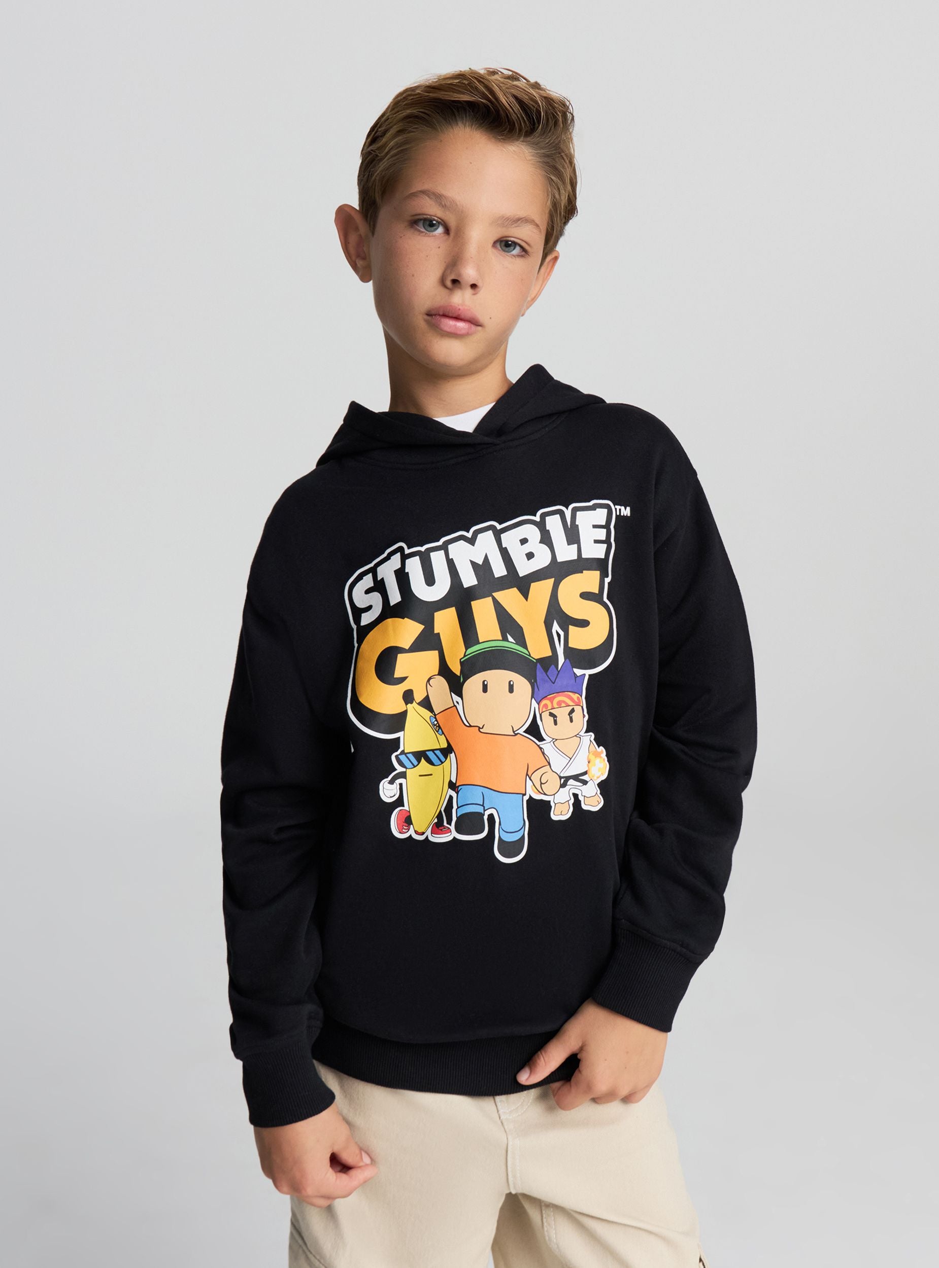 Felpa da bambino con cappuccio, senza zip, a maniche lunghe. Stampa Stumble Guys® sul davanti. Ideale per scuola e tempo libero, si abbina a jeans o pantaloni tuta. Polsini e fondo a costine per maggiore comfort e vestibilità regular. Grafica vivace che aggiunge un tocco divertente agli outfit.Dettagli
