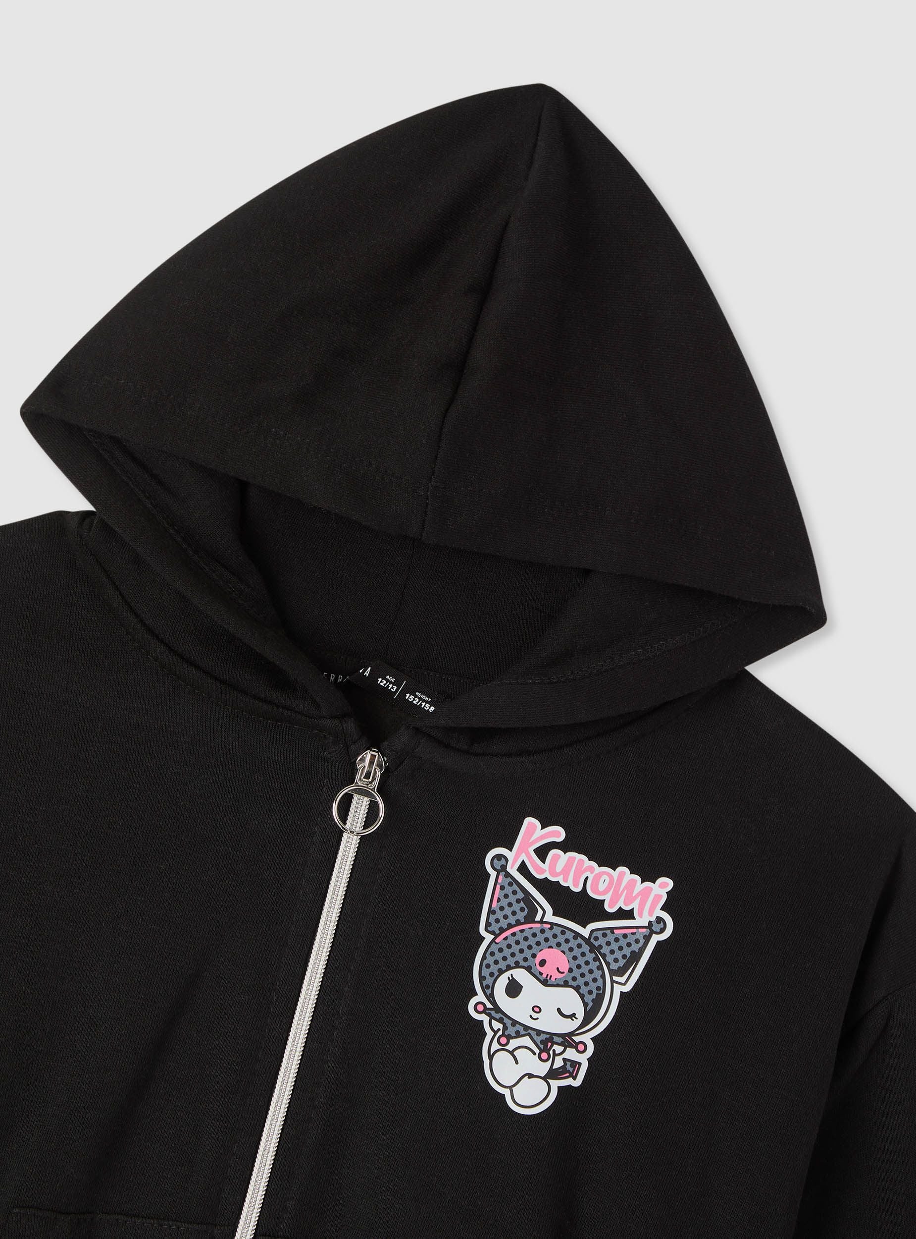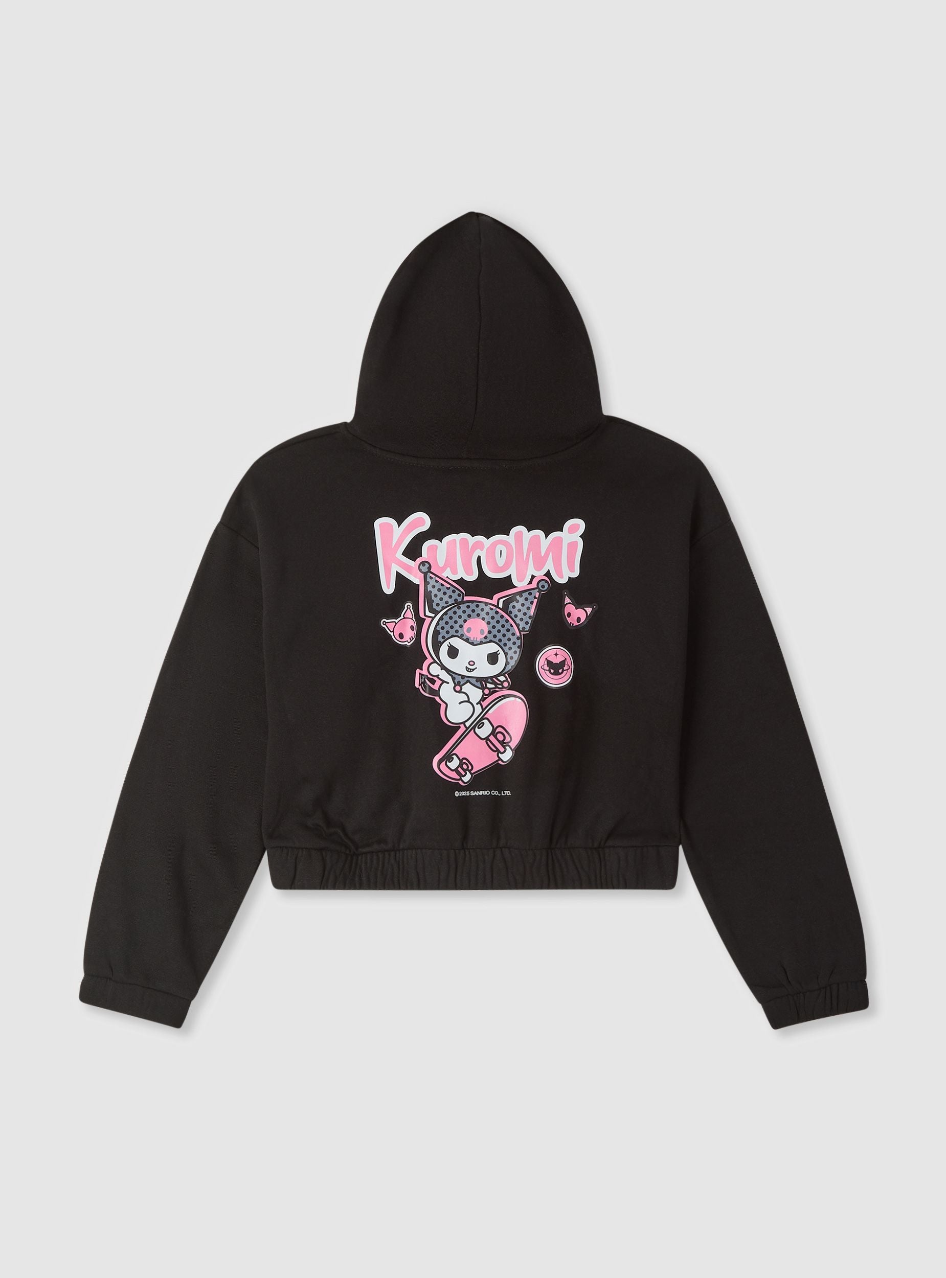 Felpa da bambina con cappuccio e con zip frontale, lunghezza crop e fondo arricciato elasticizzato. Presenta tasche a marsupio e stampa Kuromi® sul petto e sul retro, ideale per look casual e urban. Perfetta sopra maglietta e jeans o con pantaloni tuta per il tempo libero. Maniche lunghe con polsini elasticizzati e vestibilità comoda che assicura libertà di movimento.Dettagli