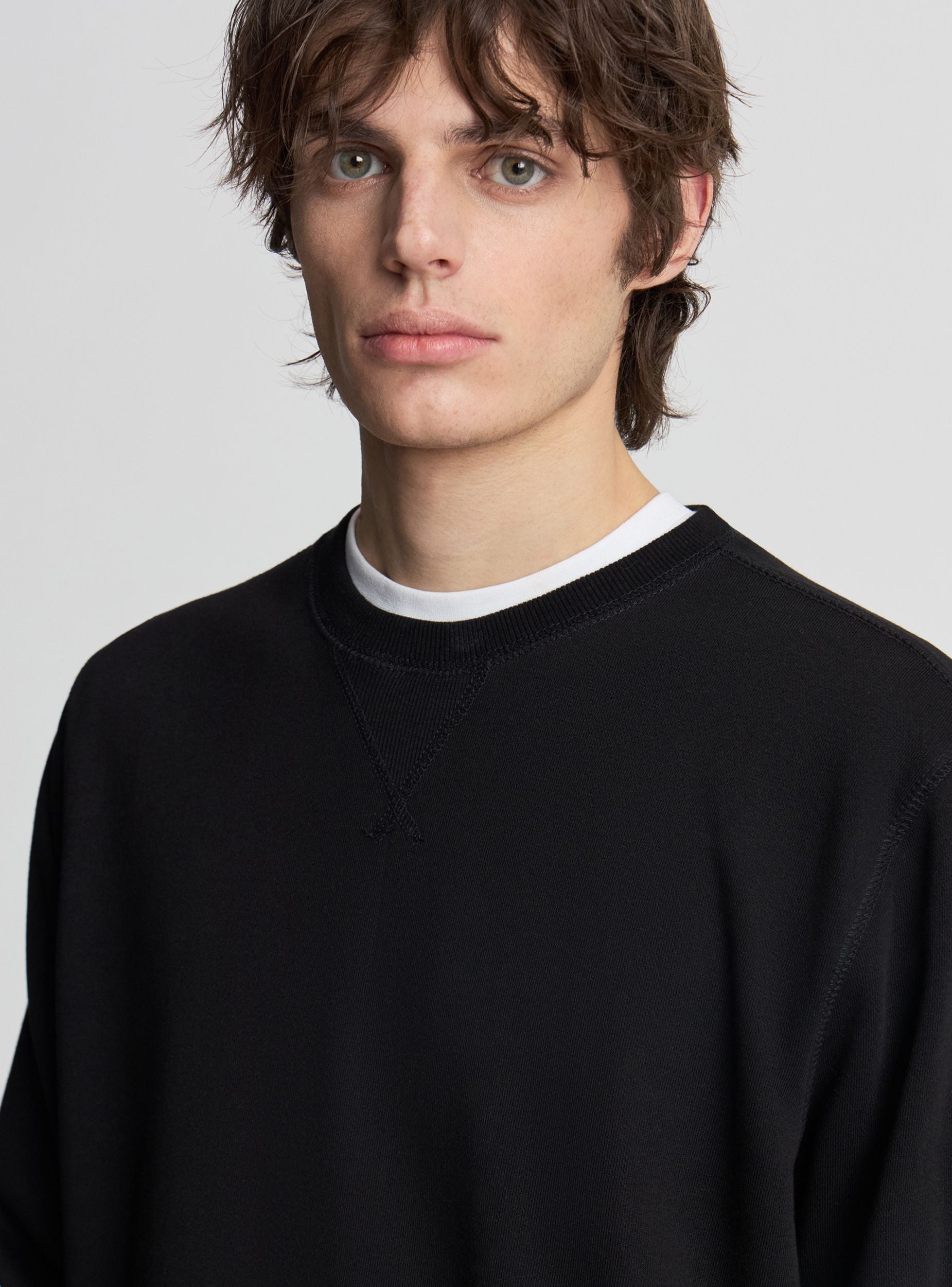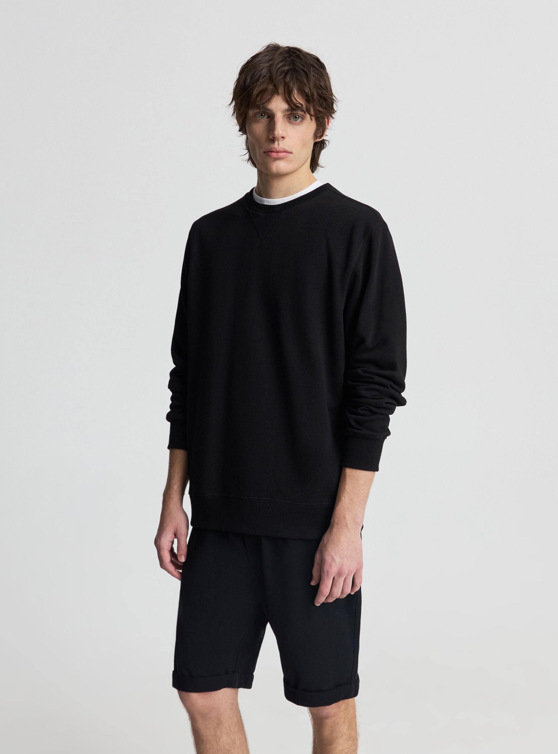 Felpa leggera da uomo senza cappuccio a tinta unita con collo girocollo e inserto a V, maniche lunghe e senza zip. Fondo lavorato a maglia per una vestibilità confortevole. Ideale per il tempo libero e per look urban con jeans e sneakers, perfetta anche sotto una giacca leggera. Design essenziale pensato per abbinamenti versatili in ogni stagione.Dettagli