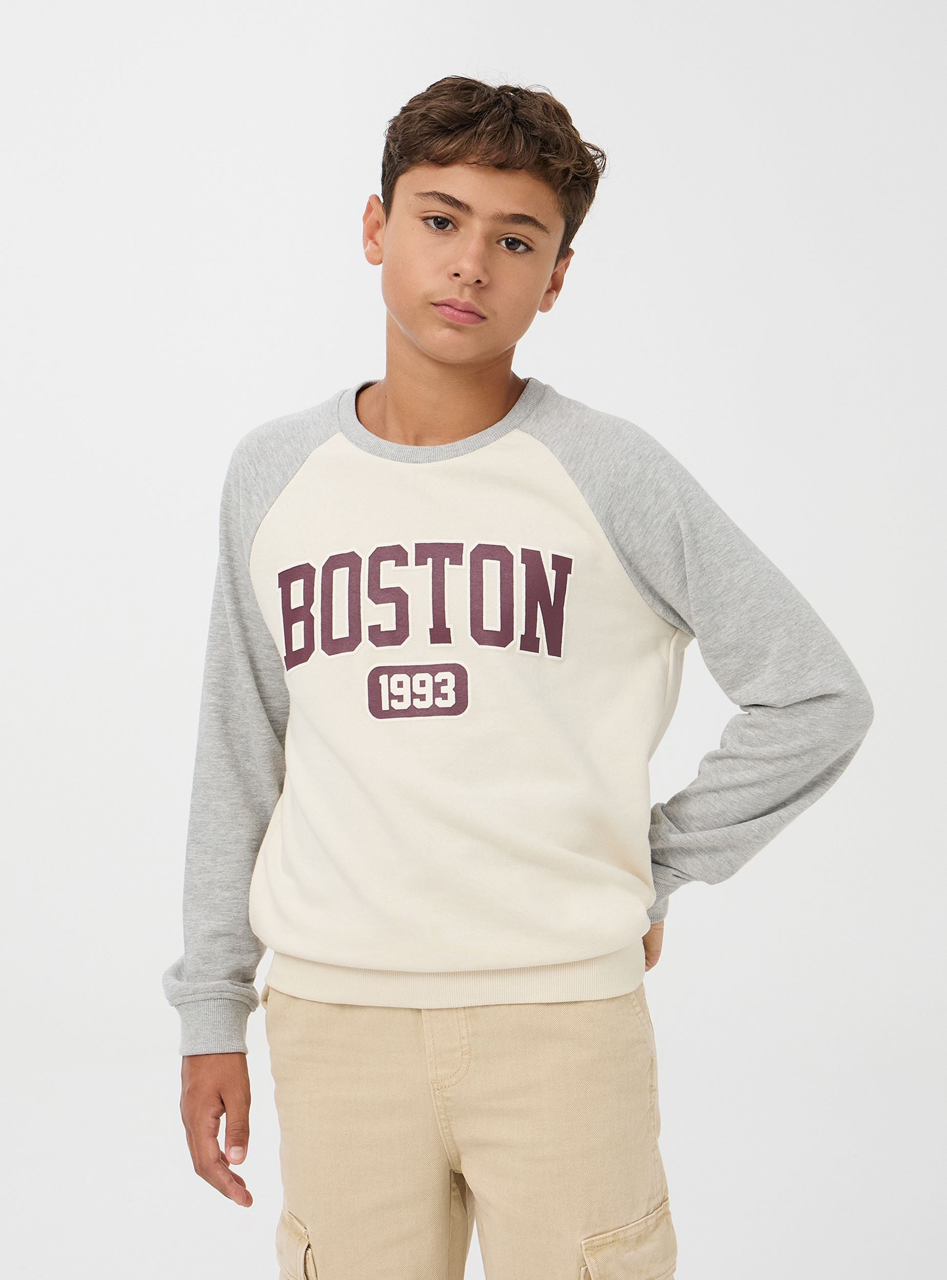 Felpa da bambino casual in tessuto leggero con maniche lunghe raglan. Il design presenta una stampa in stile college con scritta "Boston 1993" sul petto. Dotata di orli a costine su polsini, girocollo e girovita, offre una vestibilità comoda. Ideale per uscite casual, giornate di relax e attività sportive leggere.Dettagli